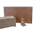 A Guinness advertising tray. Zoo keeper design, diameter 32cm, with a Teacher's Whisky pine box, 'The Right Spirit' polychrome advertising with children playing cricket to the internal lid and 'The Whisky of the Good Old Days' advertisement to the base, with an empty Punch Cabinet Habana cigar box, a carved oak casket box with iron fittings and a small Black forest bear carving (5).