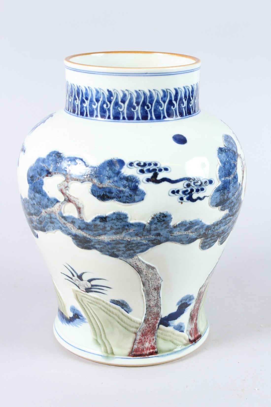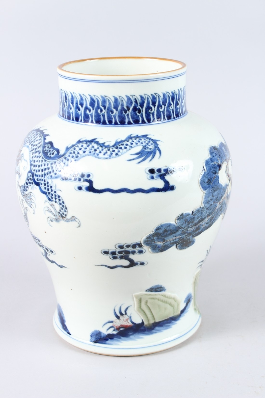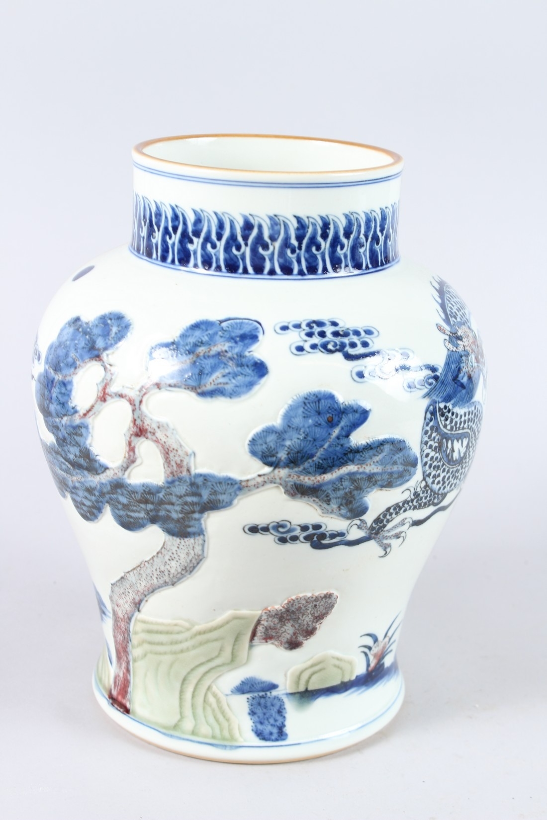 A CHINESE PORCELAIN BLUE AND WHITE JAR, unusually decorated with a moulded design depicting a dragon in a landscape with trees and mountains, six character mark to the base.