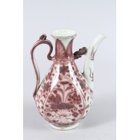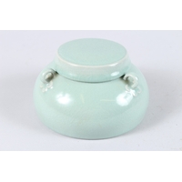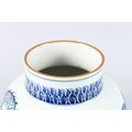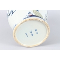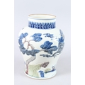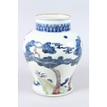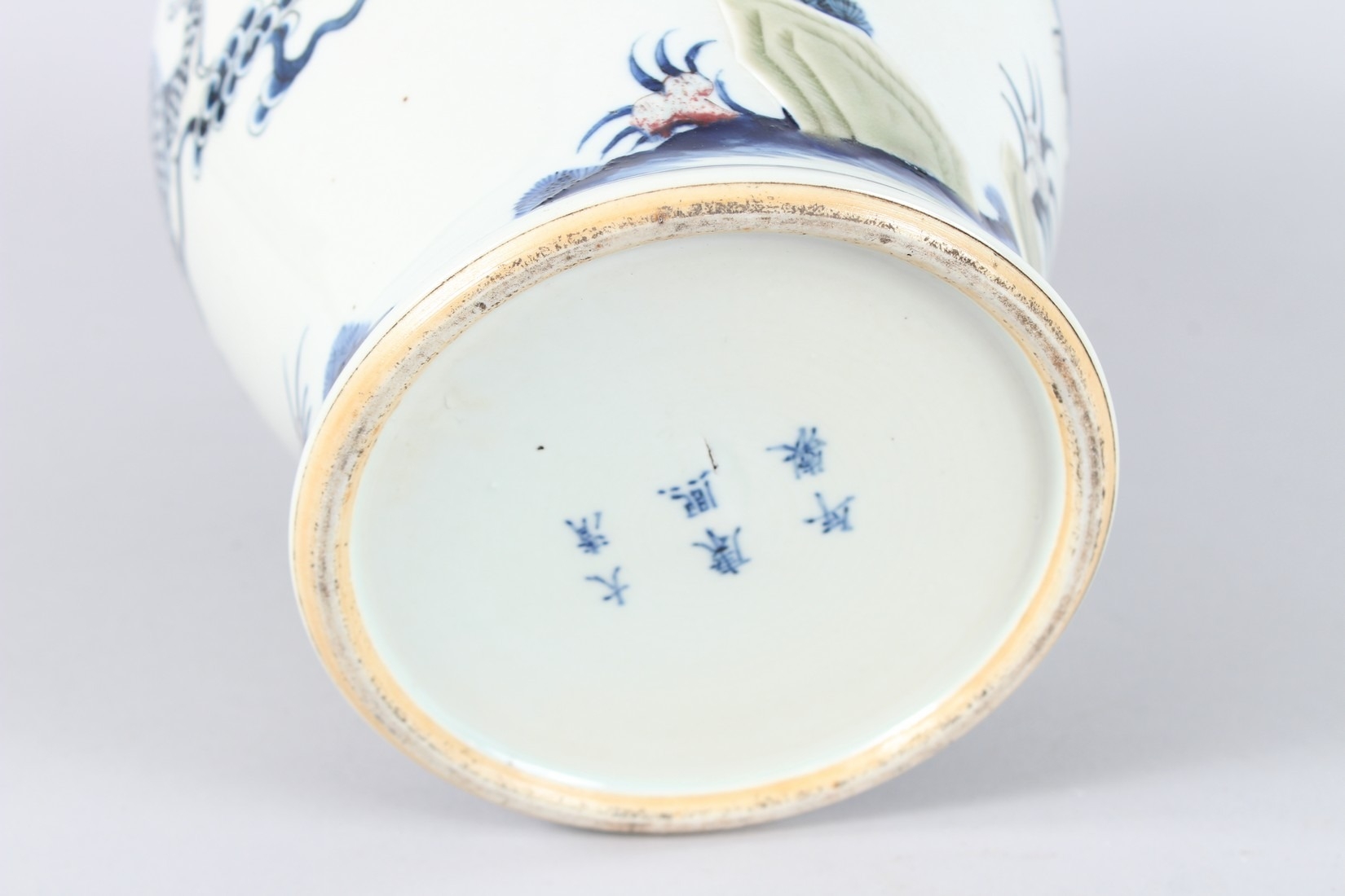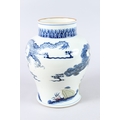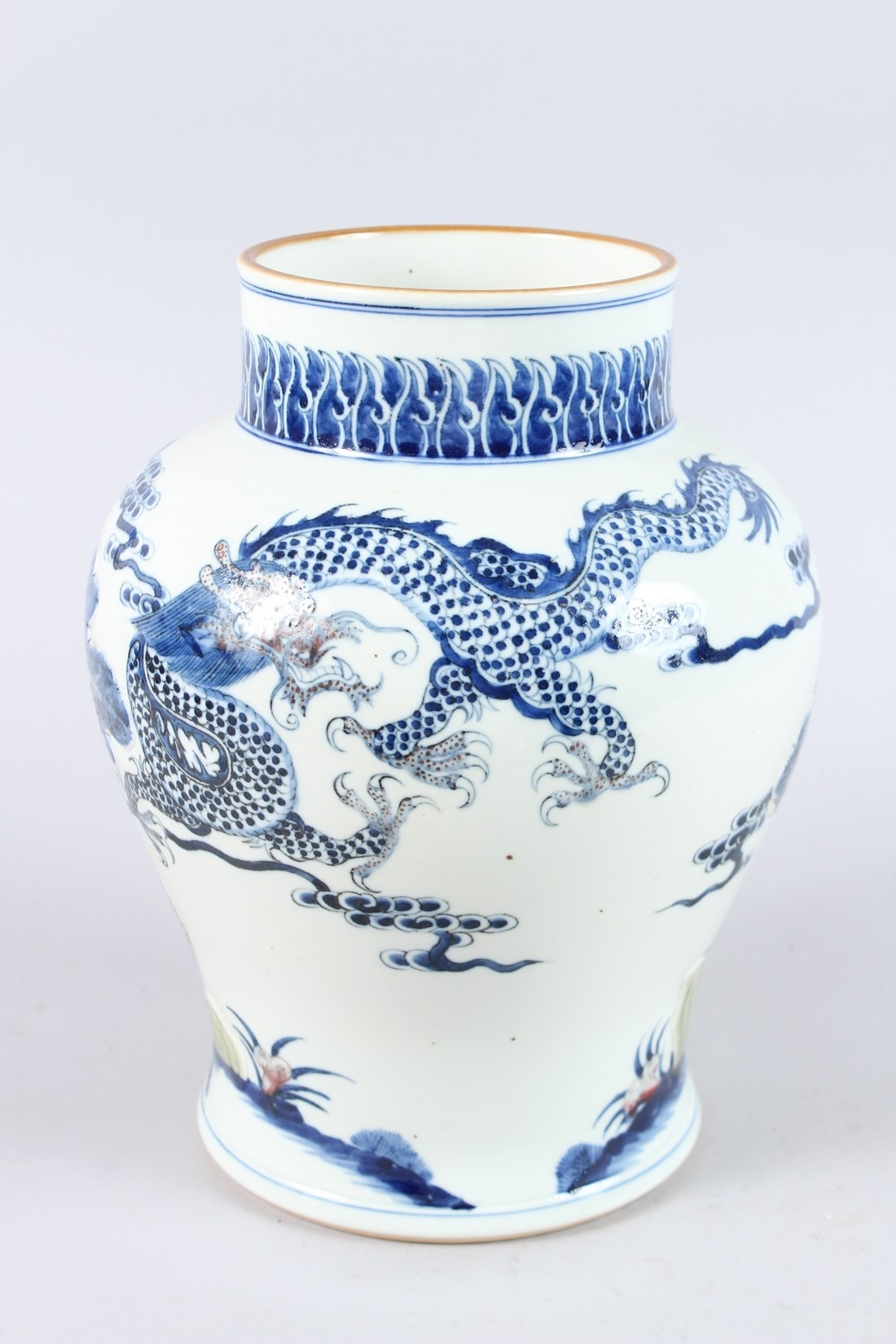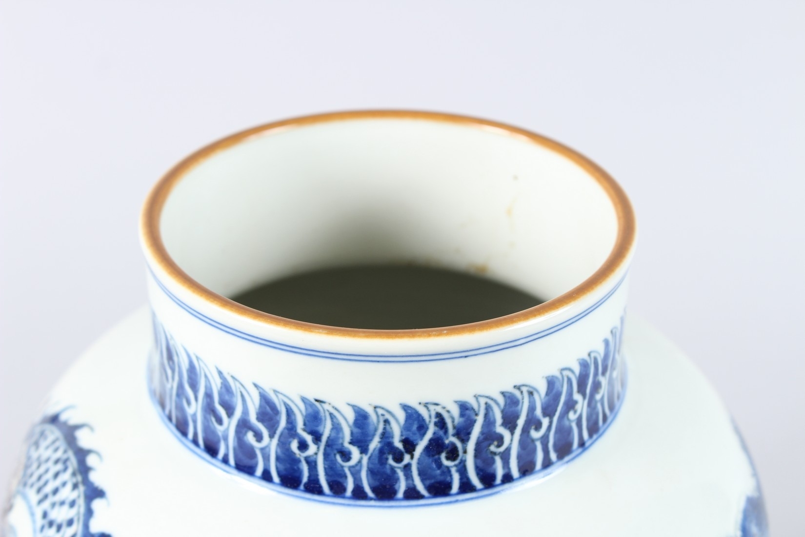 A CHINESE PORCELAIN BLUE AND WHITE JAR, unusually decorated with a moulded design depicting a dragon in a landscape with trees and mountains, six character mark to the base.