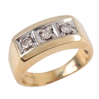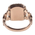 closed back set with a garnet surrounded by seed pearls with three decreasing C scrolls to each shoulder, unmarked, surface testing as 9ct, ring size P, c. 4.7 grams