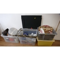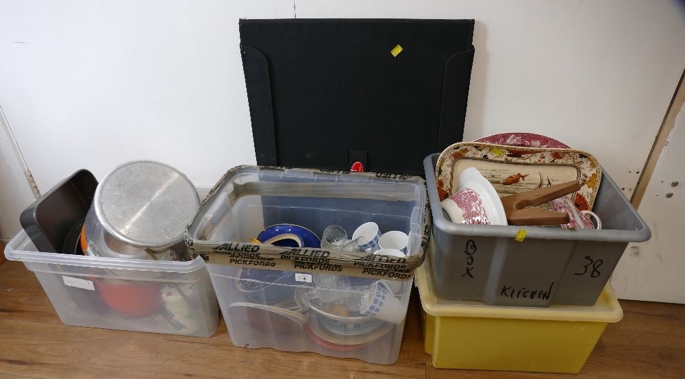 Jigsaw storage folder and three boxes of kitchenware, ceramics and crockery