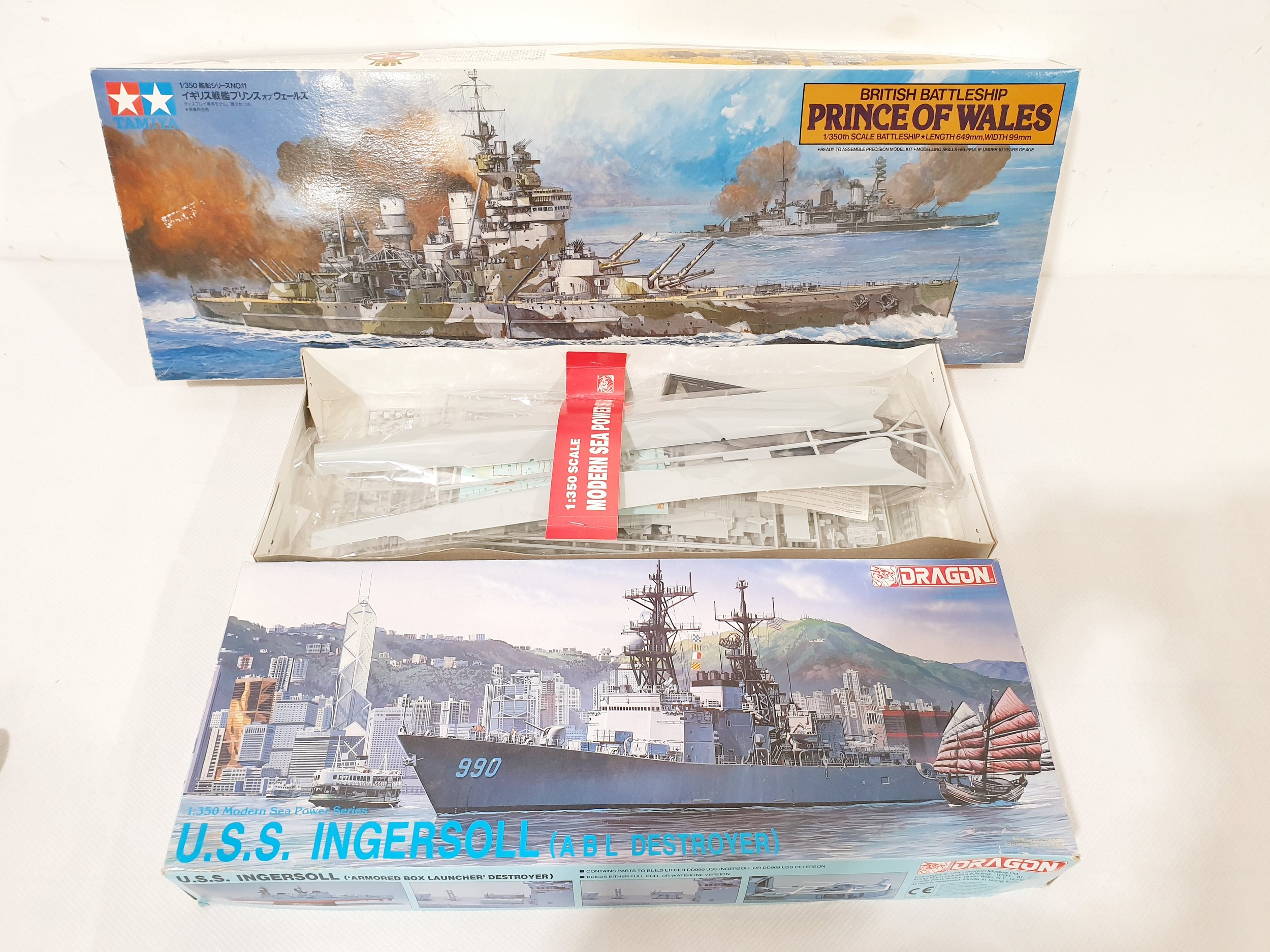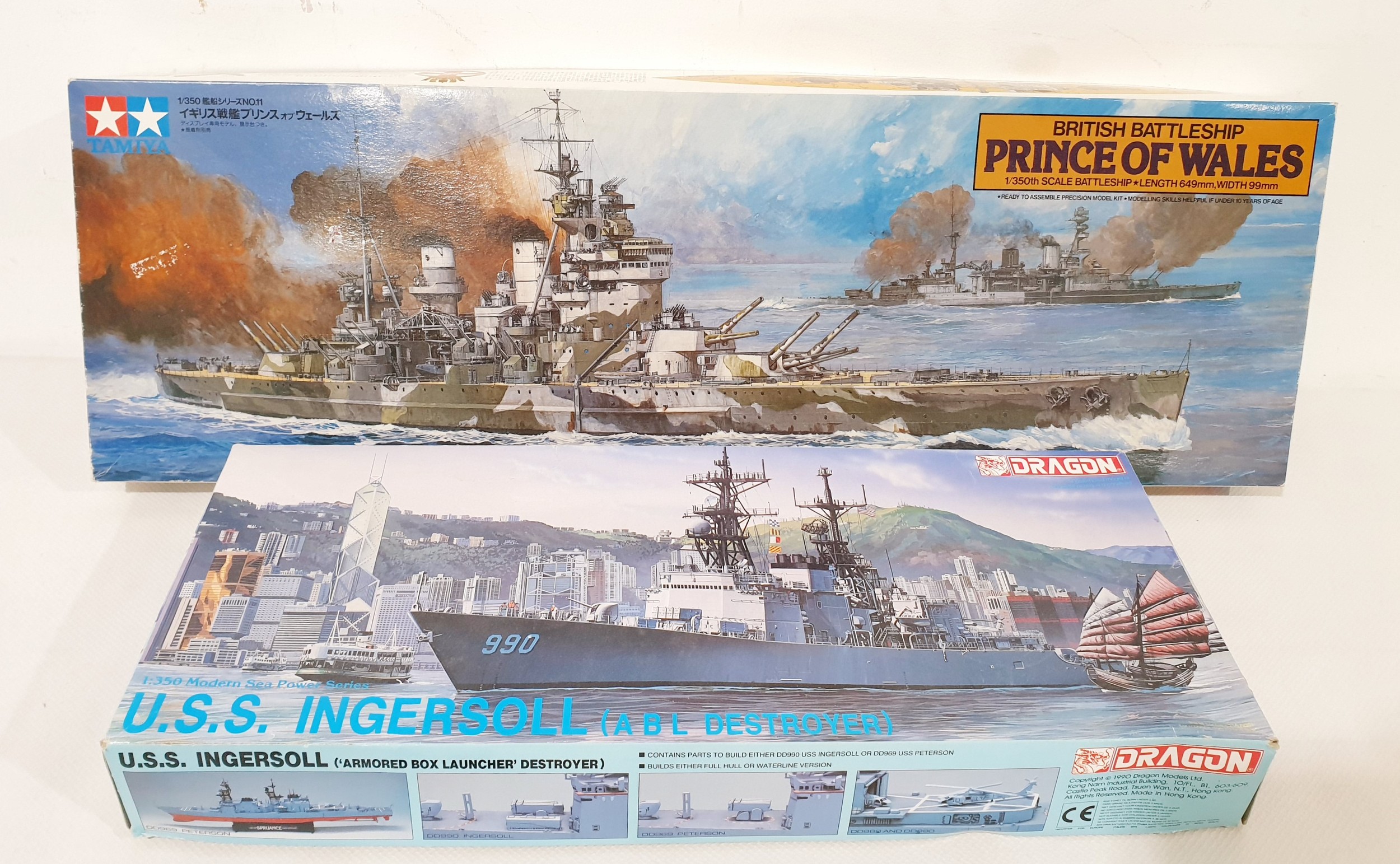 Pair of 1:350 scale model ship kits Tamiya 'HMS Prince of Wales' & Dragon 'USS Ingersoll'. No Shipping. Arrange collection or your own packer and shipper, please.