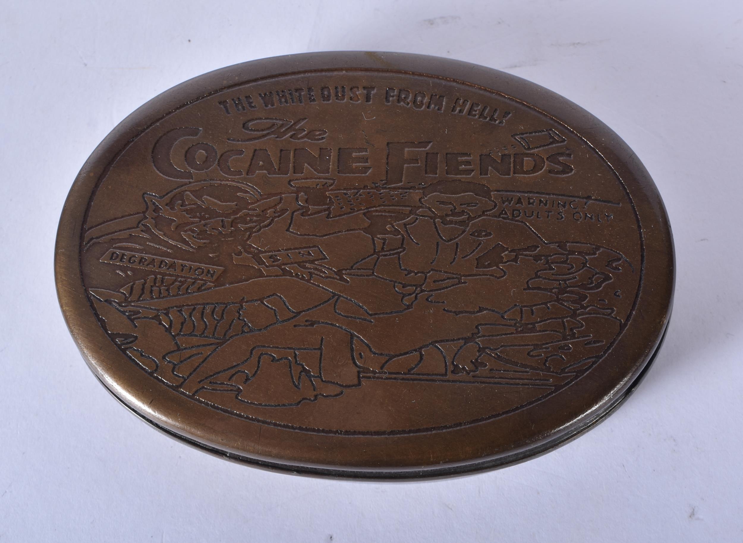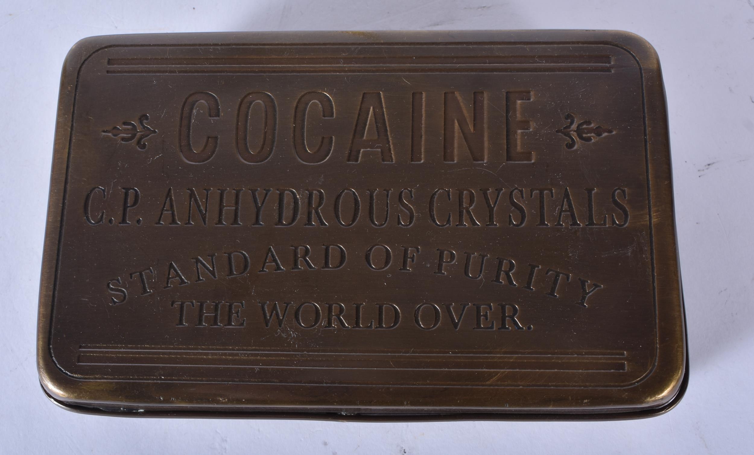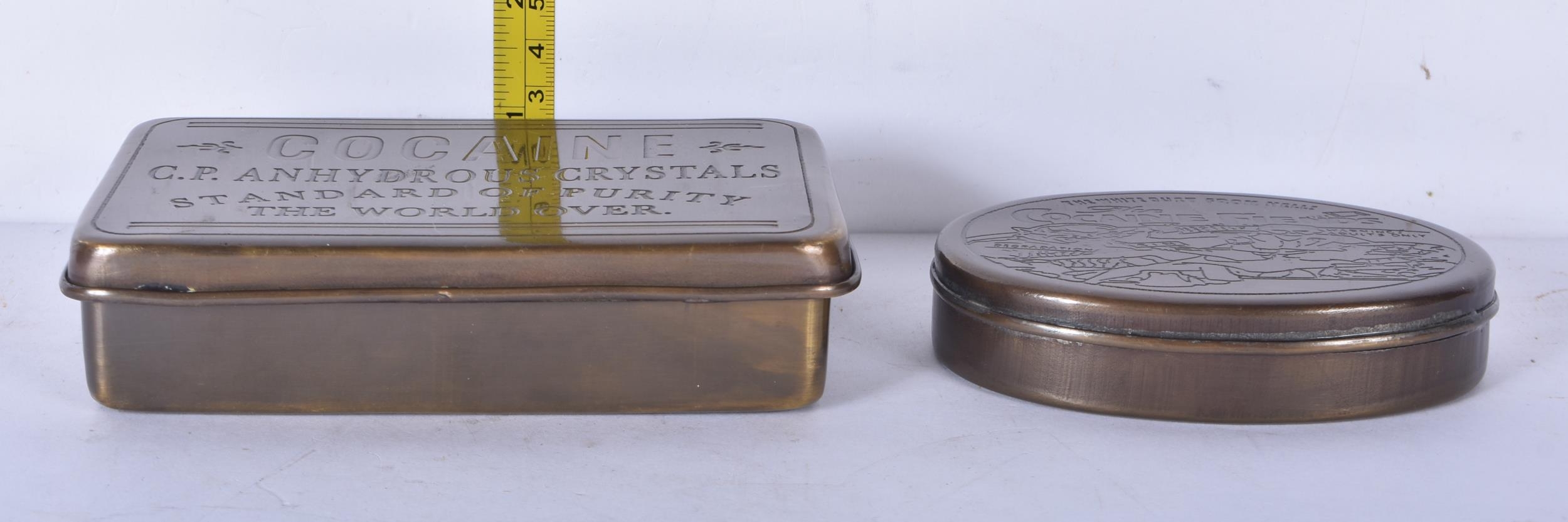 Two novelty brass cocaine tins. 3.5x13x8cm (2)