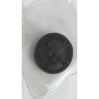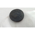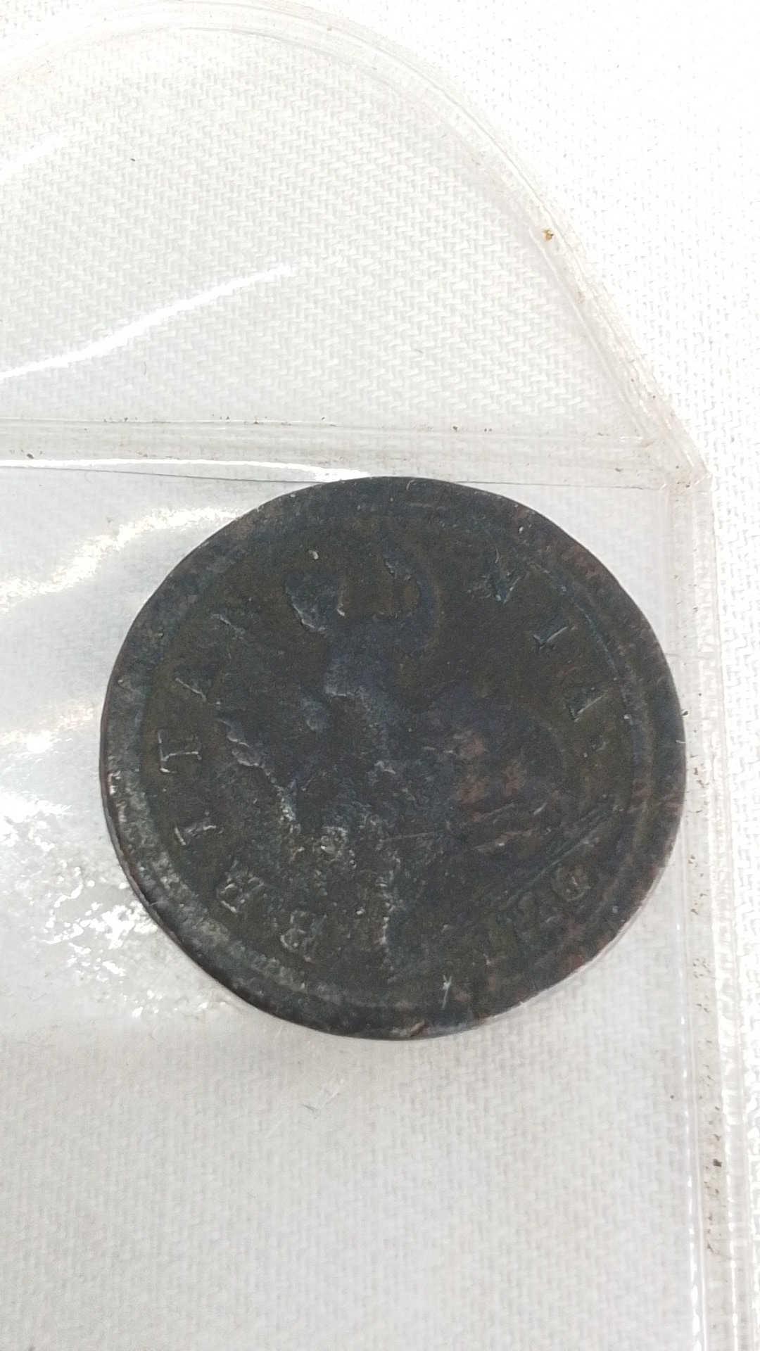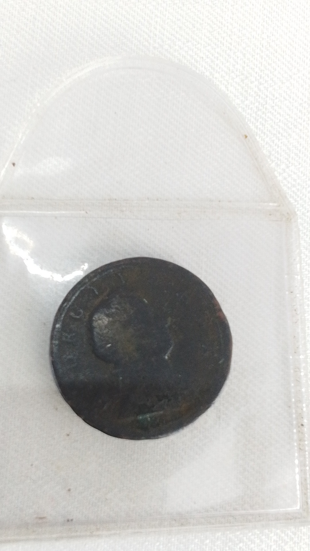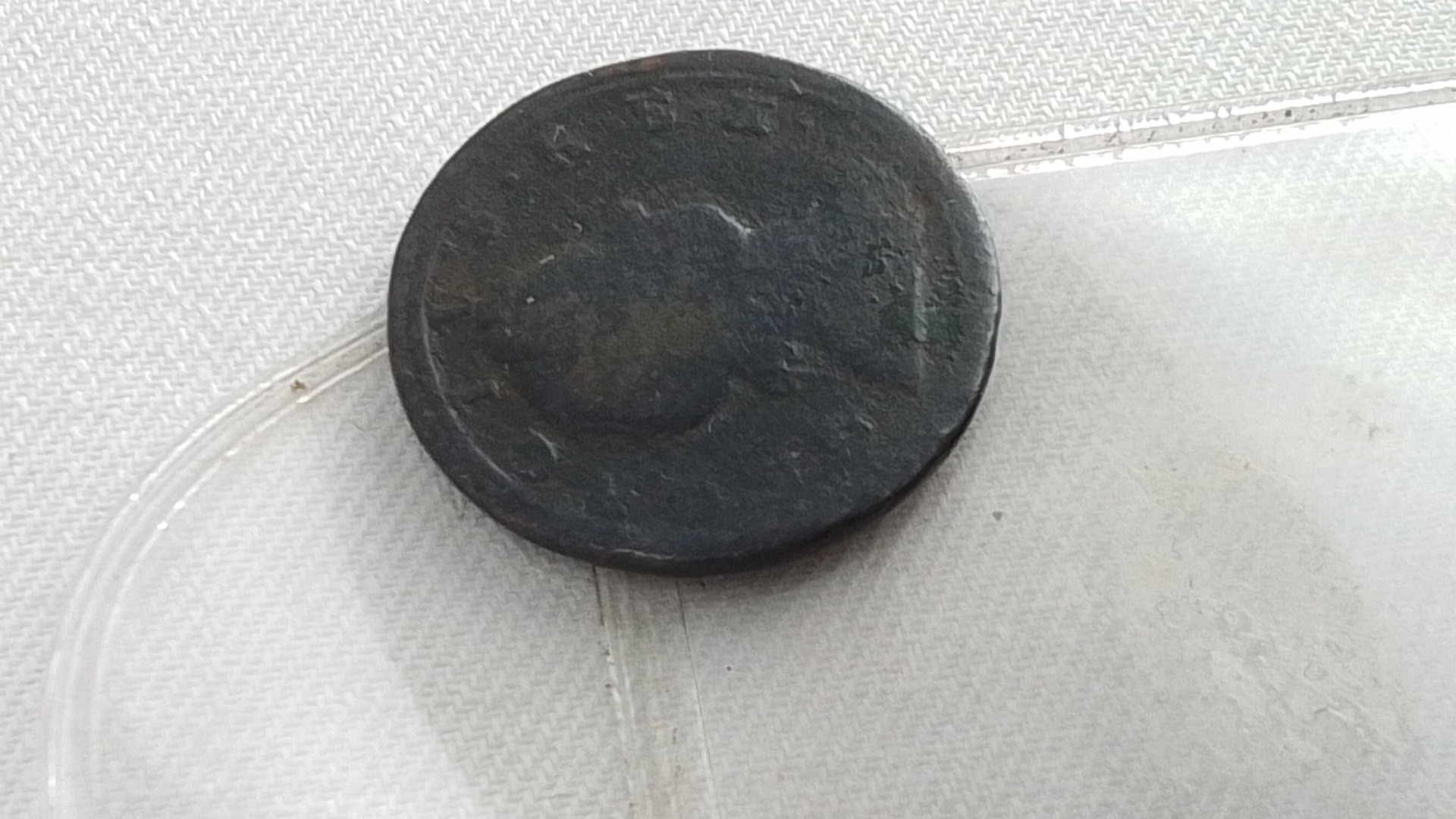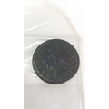 One early 19th century copper coin, the obverse with laureate bust in profile and surrounding legend; the reverse with seated figure within legend (details indistinct), housed in a clear protective sleeve.