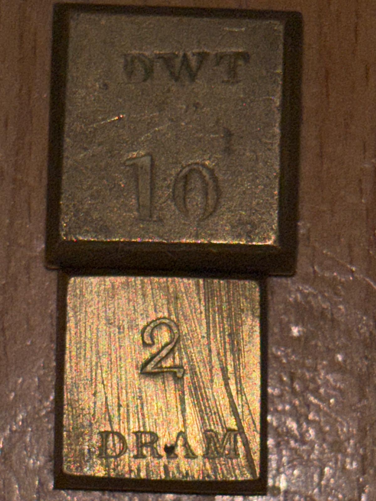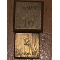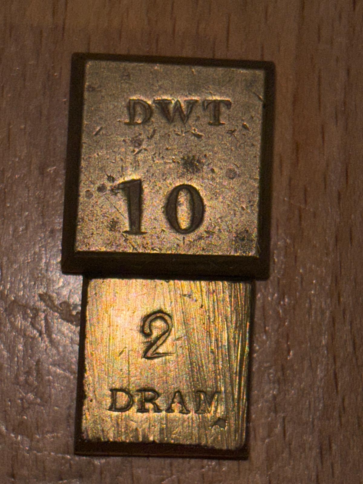Antique Brass Apothecary / Goldsmith’s Balance Weights — 10 DWT & 2 DRAM A fine pair of original brass precision weights from a traditional apothecary or jeweller’s balance set, comprising: • 10 Pennyweight (10 DWT) • 2 Dram (2 DRAM) These denominations were used within the historic apothecaries’ and precious metal weight systems, essential for the accurate weighing of gold, silver, medicinal compounds, and fine materials. The weights retain clear stamped markings and display honest period wear consistent with long commercial use. Such pieces were standard equipment in chemists’ shops, assay offices, and goldsmith workshops from the late Georgian through Victorian era. Material: Solid brass System: Apothecaries’ / Troy Period: 19th century Condition: Original patina, clear stamps, light surface wear A desirable and practical pair of traditional trade weights — authentic tools of precision from the age of balance scales and counter trade. Offered together as one lot.
