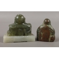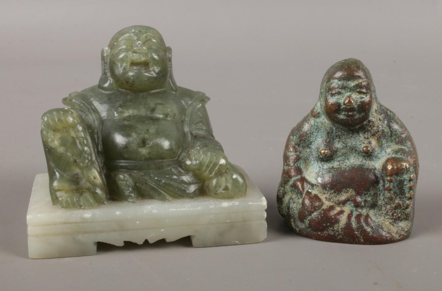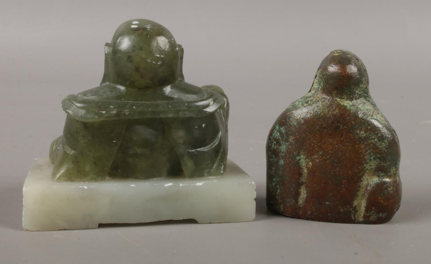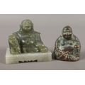 Two small seated Buddhas. Comprising of one Buddha in bronze and the other in spinach Jade on plinth. Bronze: H: 5cm, Jade: H: 5.5cm.