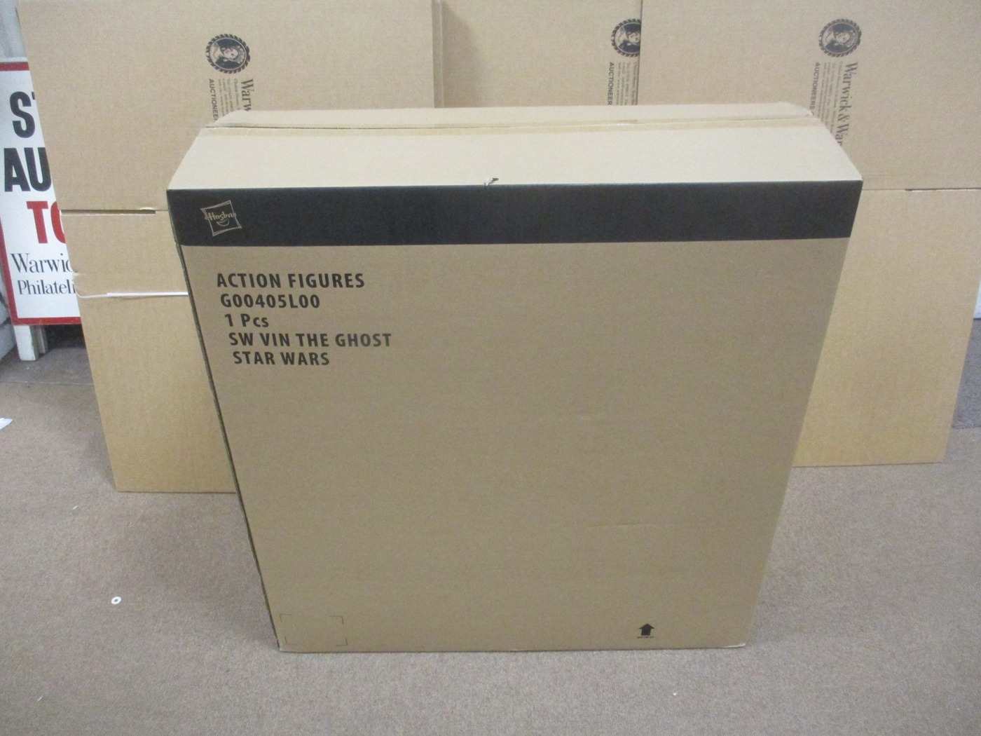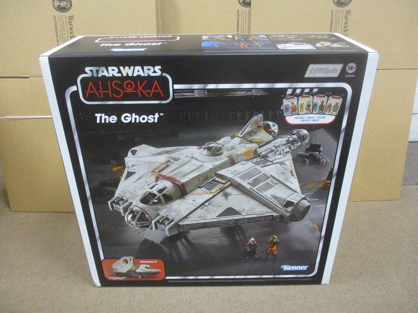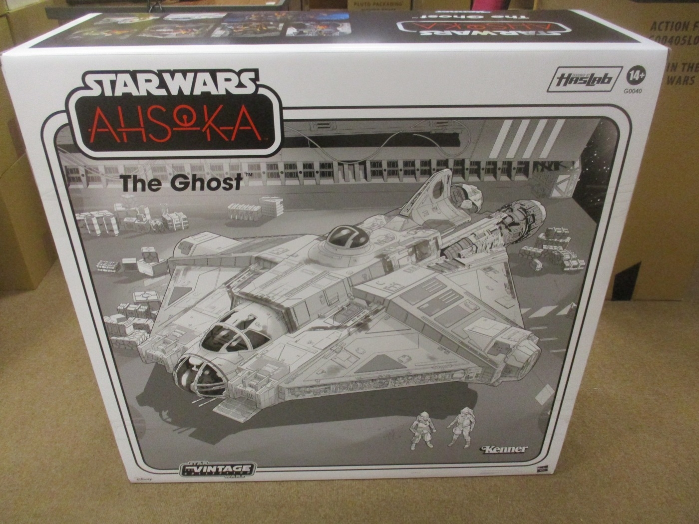 Star Wars. Hasbro. The Vintage Collection Ahsoka 'The Ghost' spaceship designed by HasLab, mint in near mint box, measures approx. 70x85x33cm and has capacity to fit at least 15 figures, includes Ezra, Hera, Kanan and Zeb figures as well as Phantom II shuttle. (B)