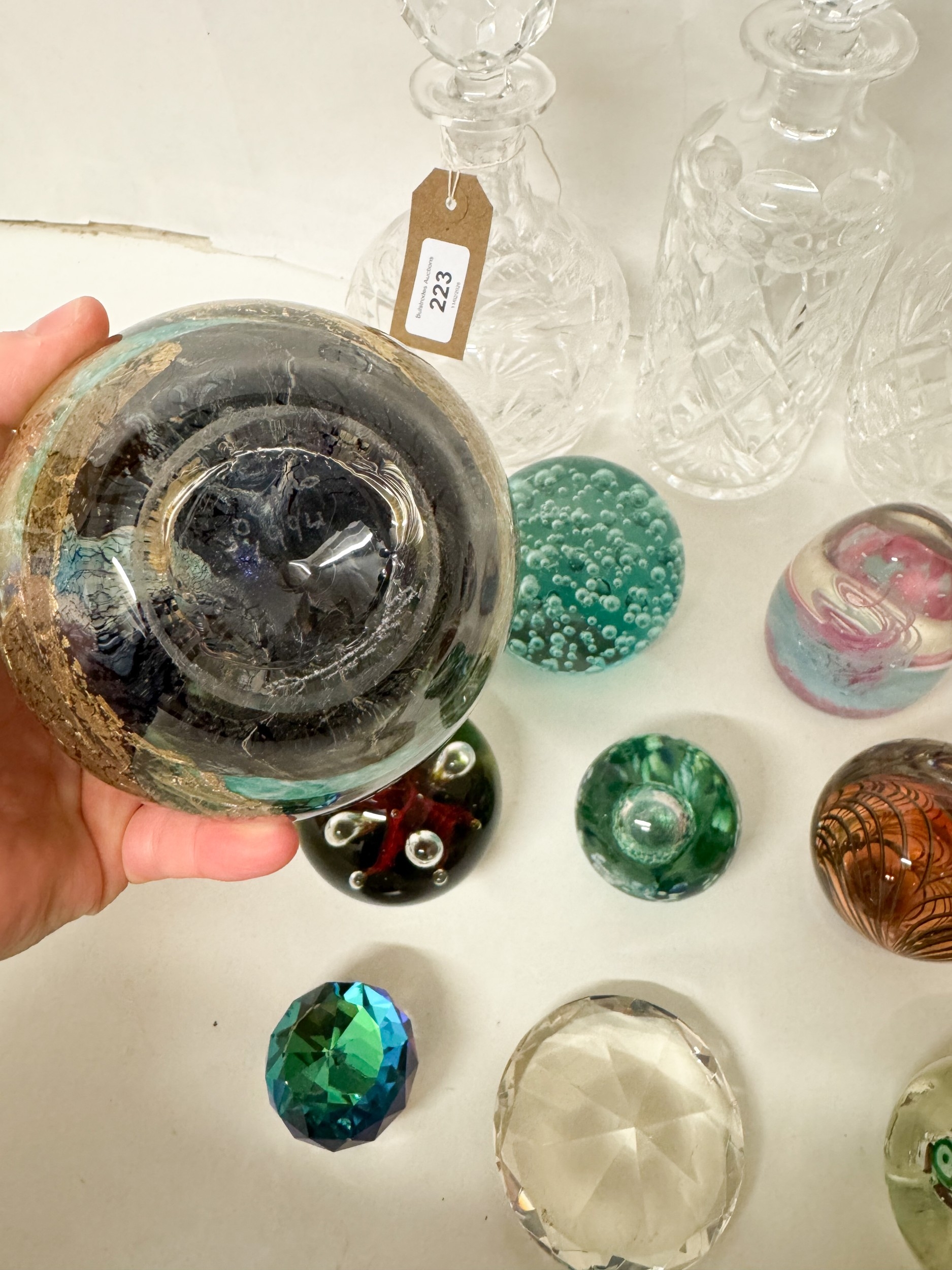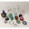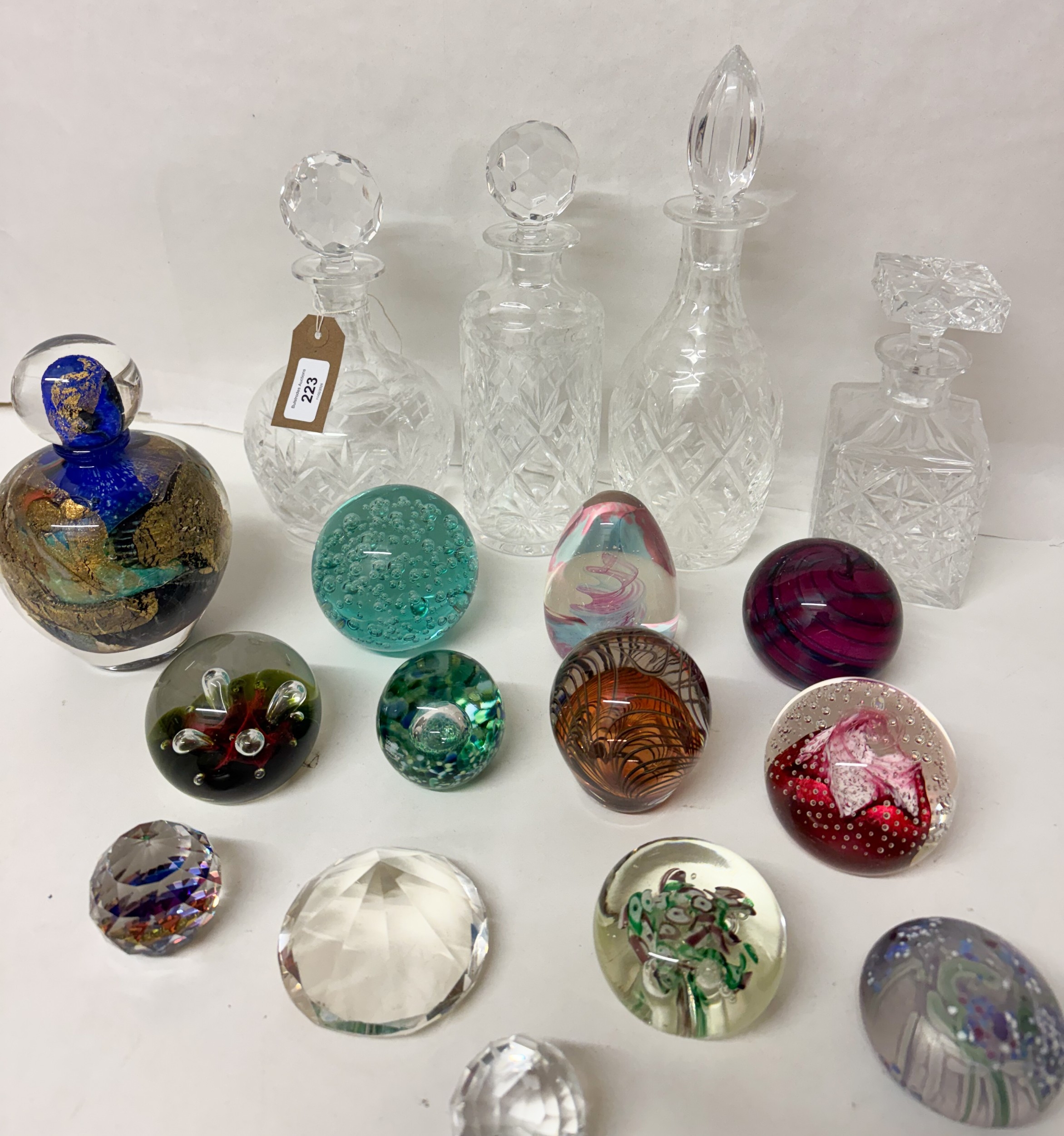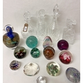 Four cut glass decanters with stoppers together with a Jean- Claude Novaro hand blown Art Glass perfume bottle or decanter with stopper and gold leaf decoration and a collection of twelve Art Glass paperweights to include Caithness and Swarovski examples
