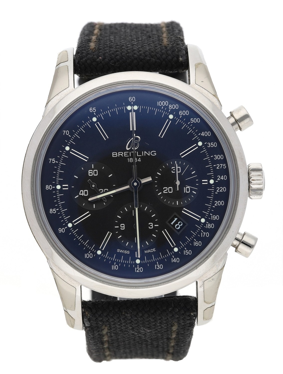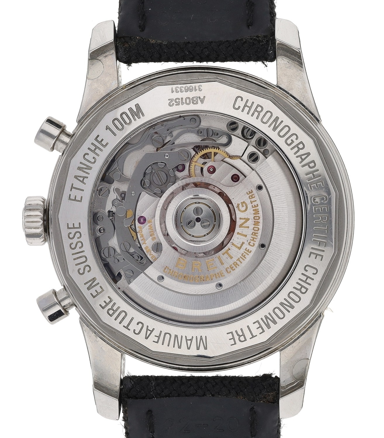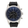 Breitling Transocean Chronograph automatic stainless steel gentleman's wristwatch, reference no. AB0152, serial no. 3166xxx, circa 2019, circular black dial, signed 47 jewel movement, exhibition case, Breitling black leather/nylon strap with signed buckle, 43mm