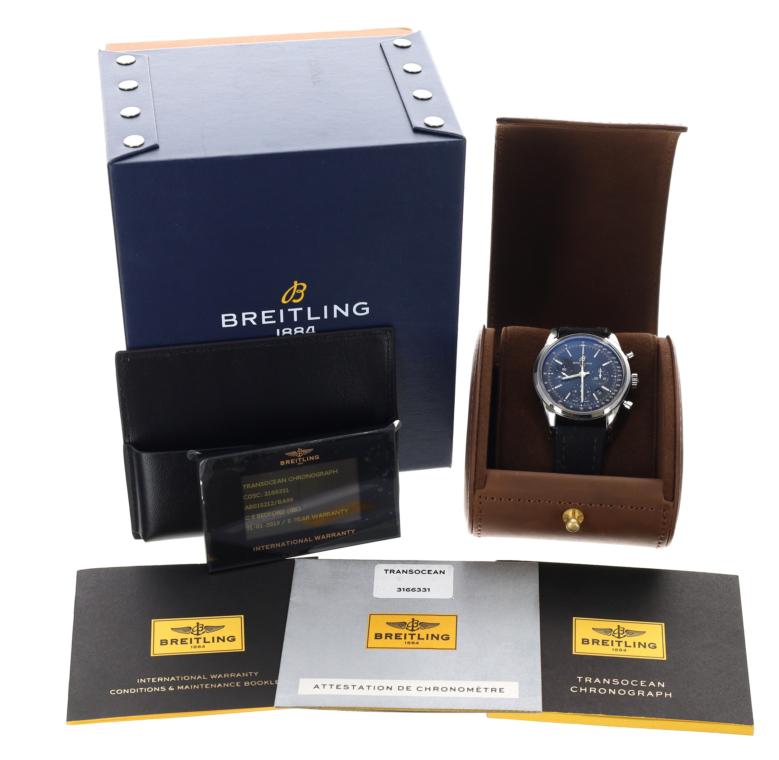 ** Breitling case with outer box, card sleeve, International warranty stamped CS Bedford and dated 31-01-2019, International warranty booklet, Transocean Chronograph booklet, chronometre certificate