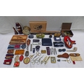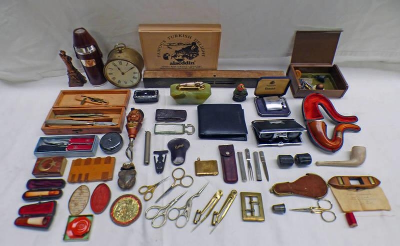 SHUTTLE WITH OLD LABEL ROBERT TANNAHILLS OWN SHUTTLE, B - 1774 D - 1810, SNUFFBOX, COLLECTION SCISSORS, MEERSCHAUM PIPE, RONSON HARDSTONE LIGHTER, RABONE SPIRIT LEVEL, BRASS TOPPED JOHN BRASS CLOCK, LEATHER BOUND FLAKS & CUPS ETC