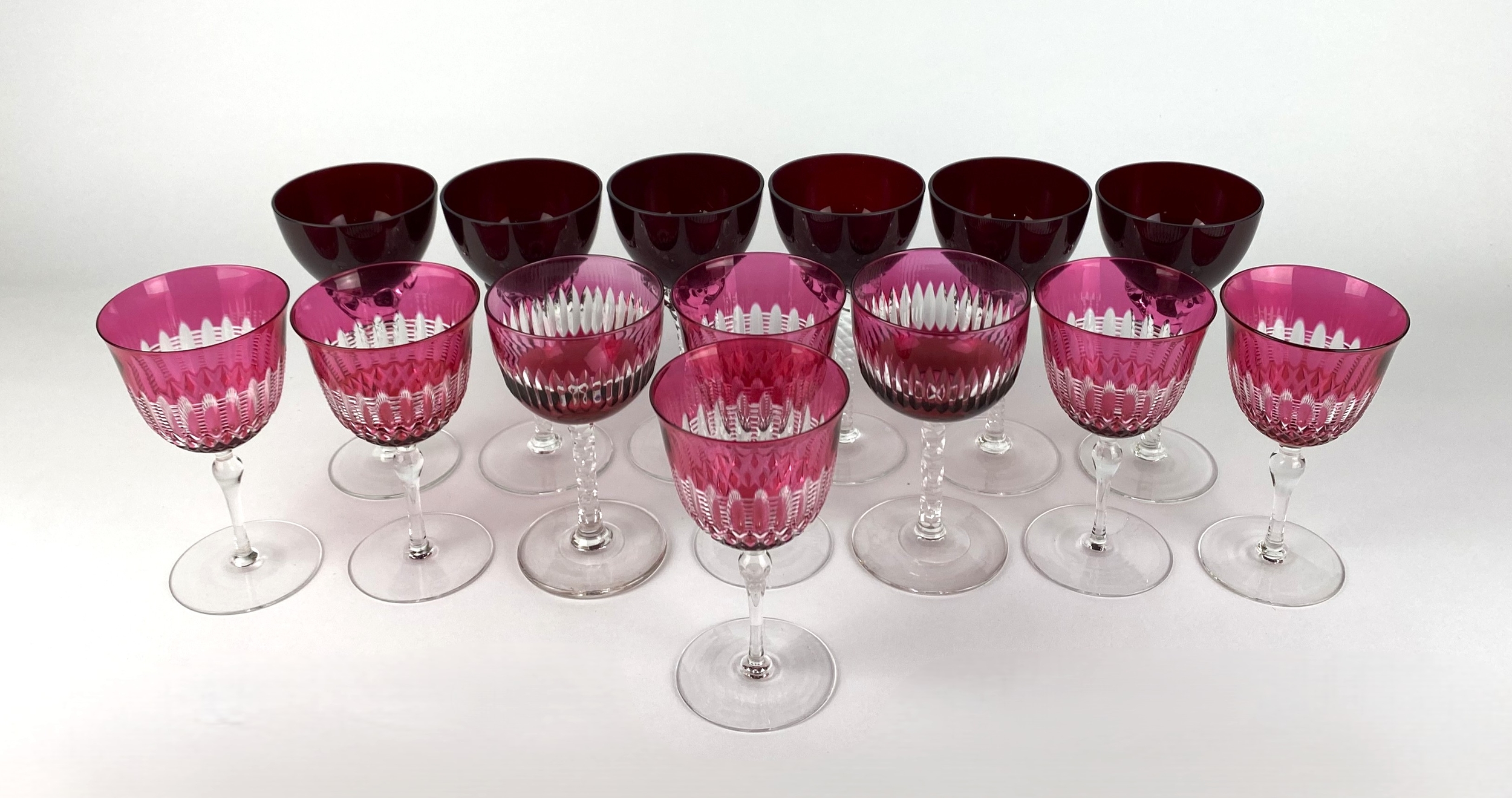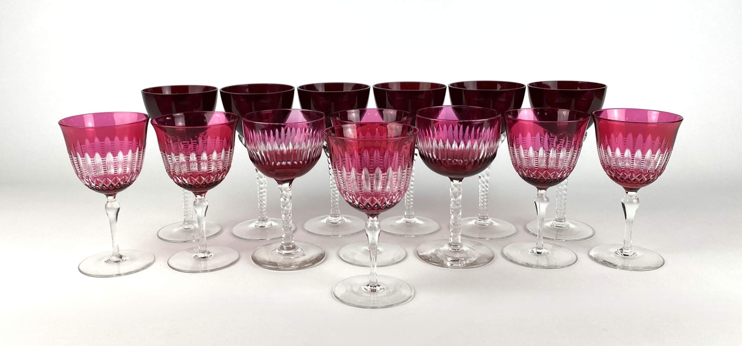 A set of six cranberry cut glass wine glasses, with clear glass stems, together with a pair of cranberry wine glasses, and a set of six ruby wine glasses, with twisted clear glass stems the first height 12cm (14)
