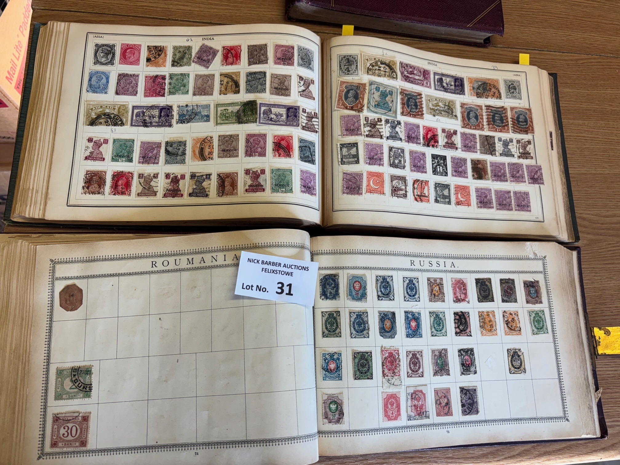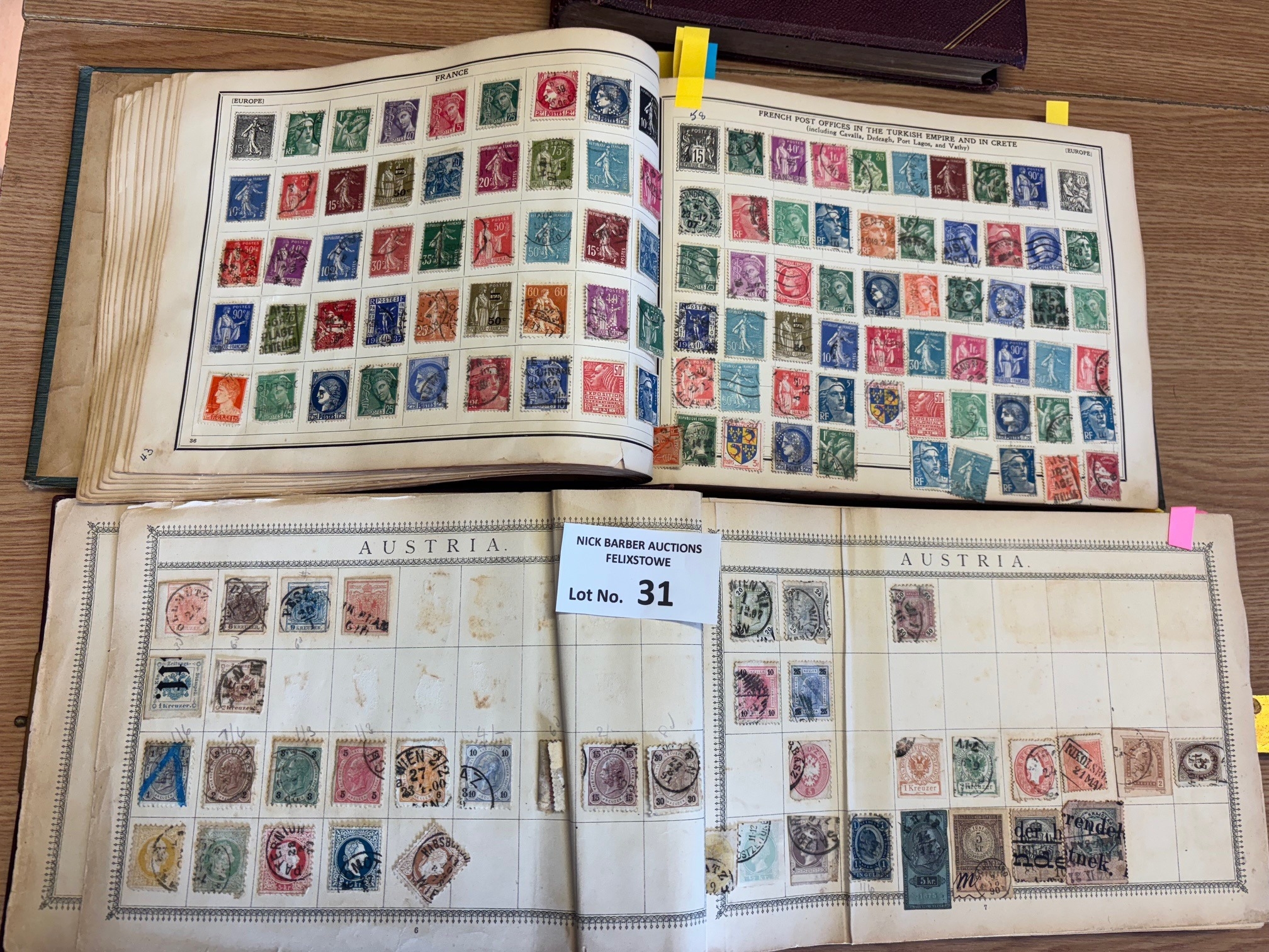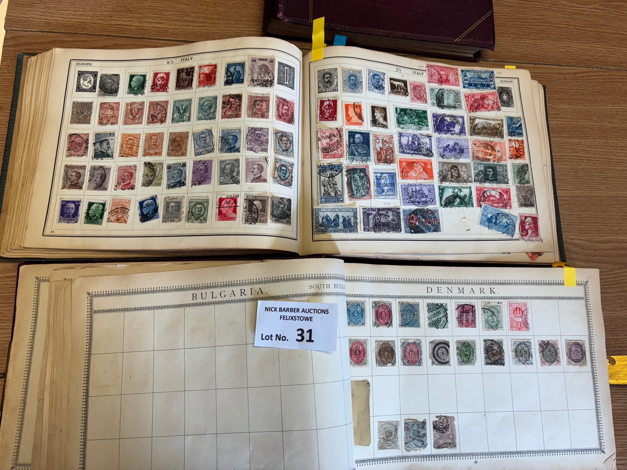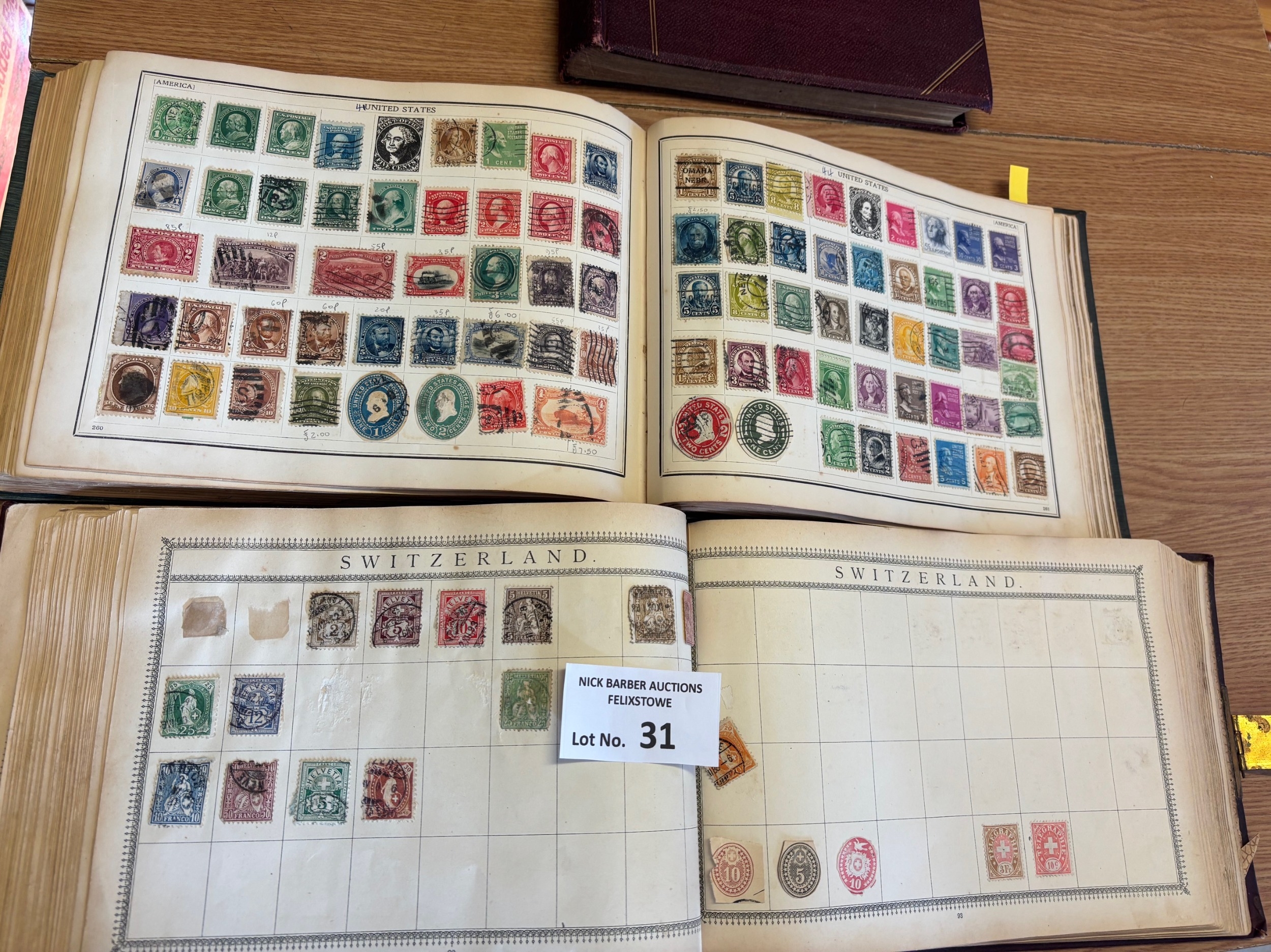 Stamps : Old time world collection in 3 oblong stamp albums, one with a metal clasp.