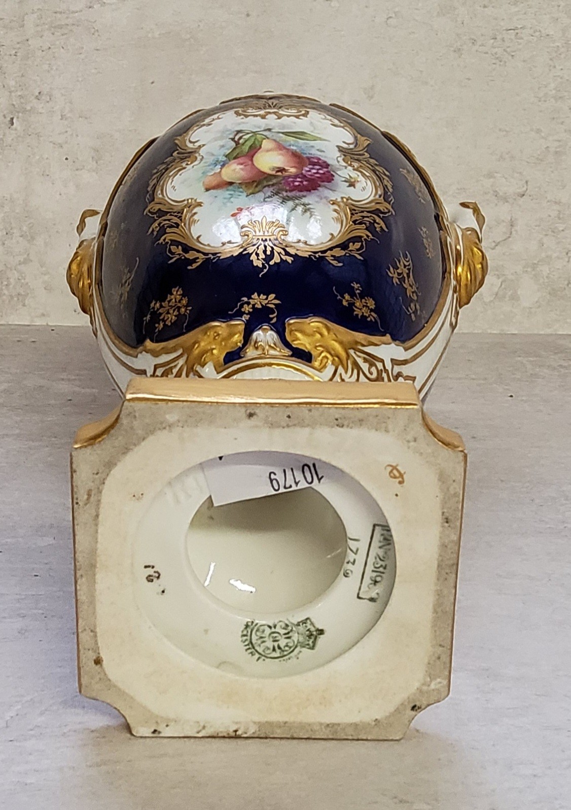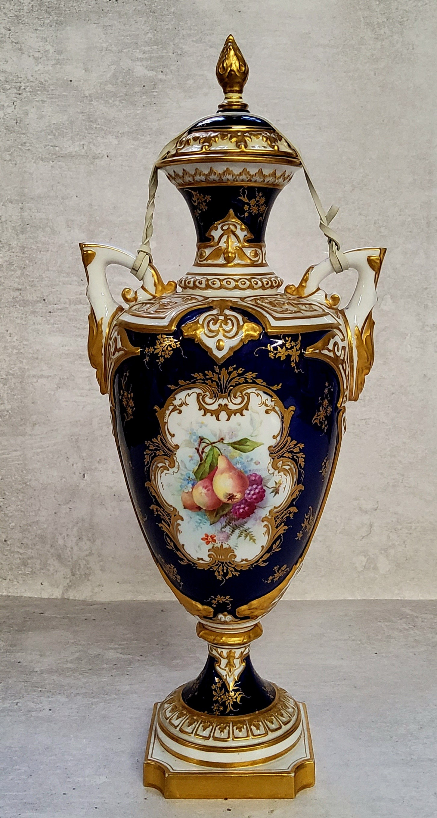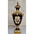 AMENDED DECSRIPTION - A Royal Worcester two handled pedestal slender ovoid vase painted with pears & blackberries within a gilt cartouche on a cobalt blue ground, green printed mark, RN 2319, 1739 impressed mark k4 32cms high PLEASE NOTE the cover pictured belongs with the larger vase in Lot 5