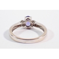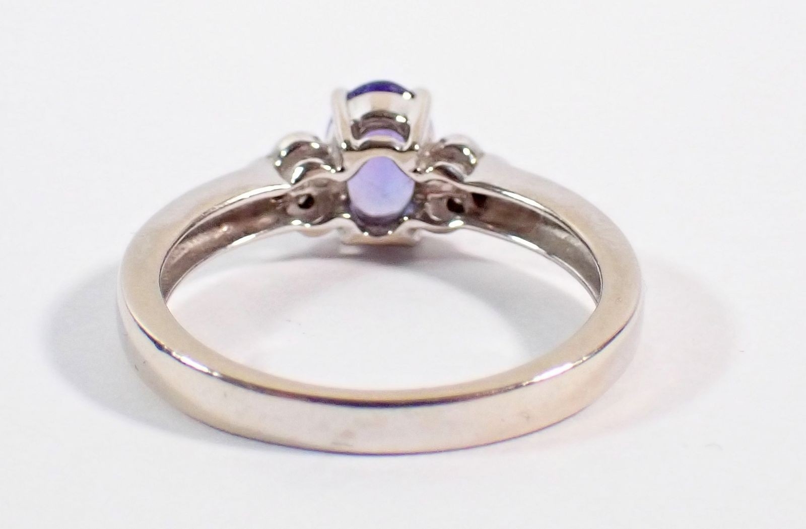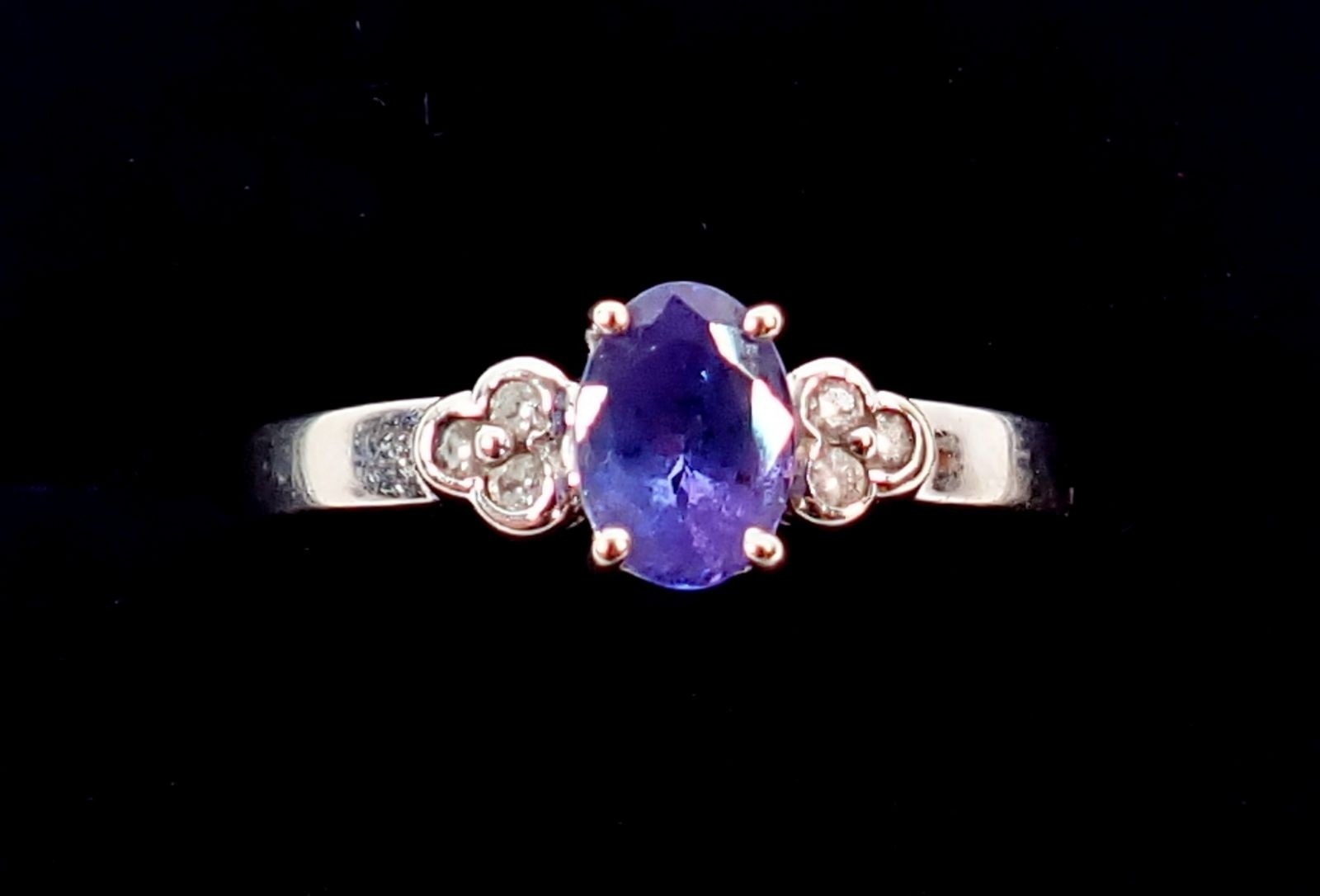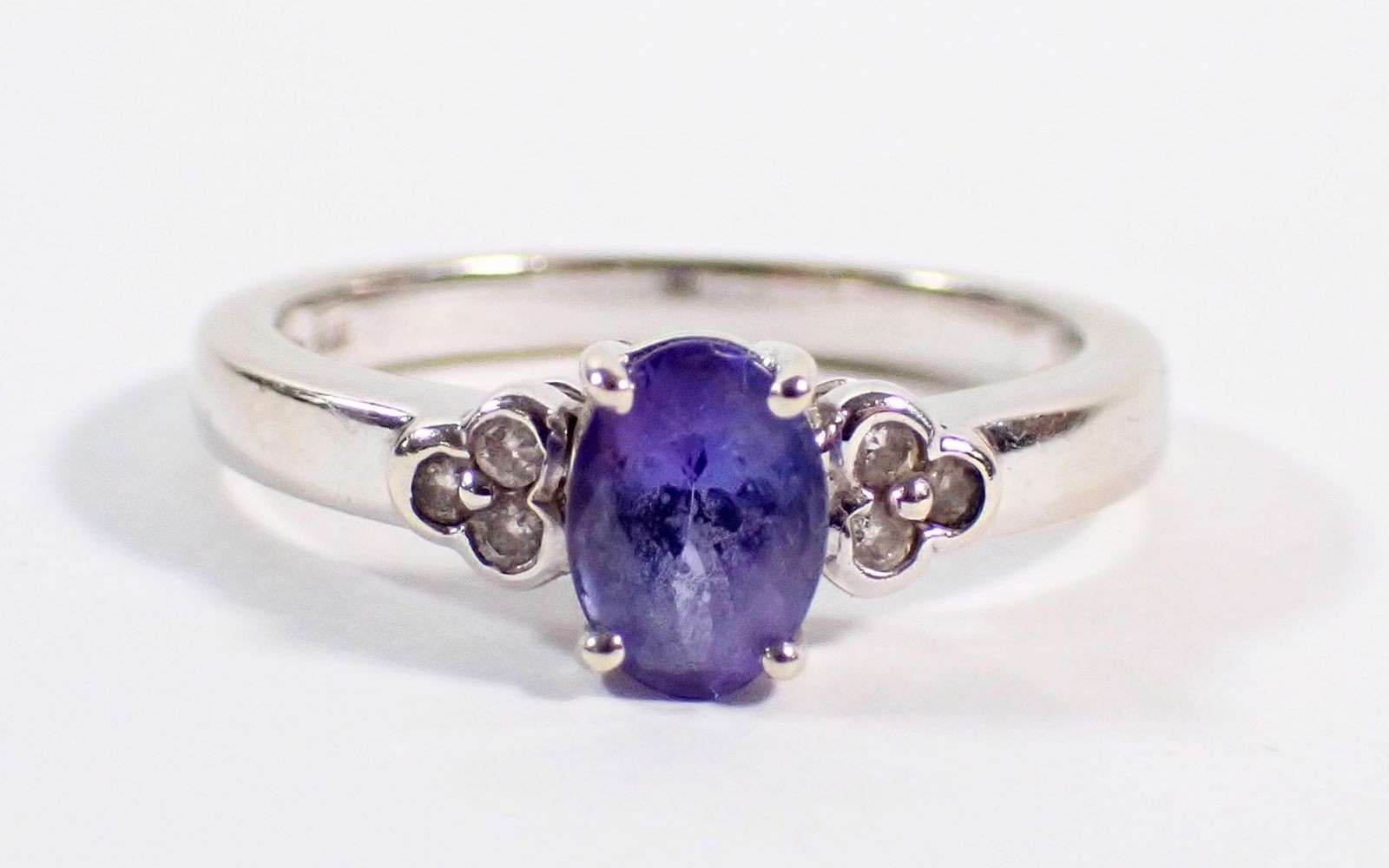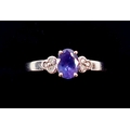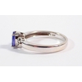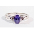 A 14 carat white gold ring set oval cut tanzanite flanked by six small diamonds, size O, 3.5g