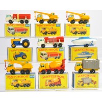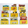 Matchbox Regular wheels comprising nine boxed issues as shown. Cattle truck (still on sprue), Opel diplomat, refuse truck etc. Mostly very good or excellent in some good but mostly very good/excellent boxes. Generally Ex-Shop Stock.