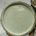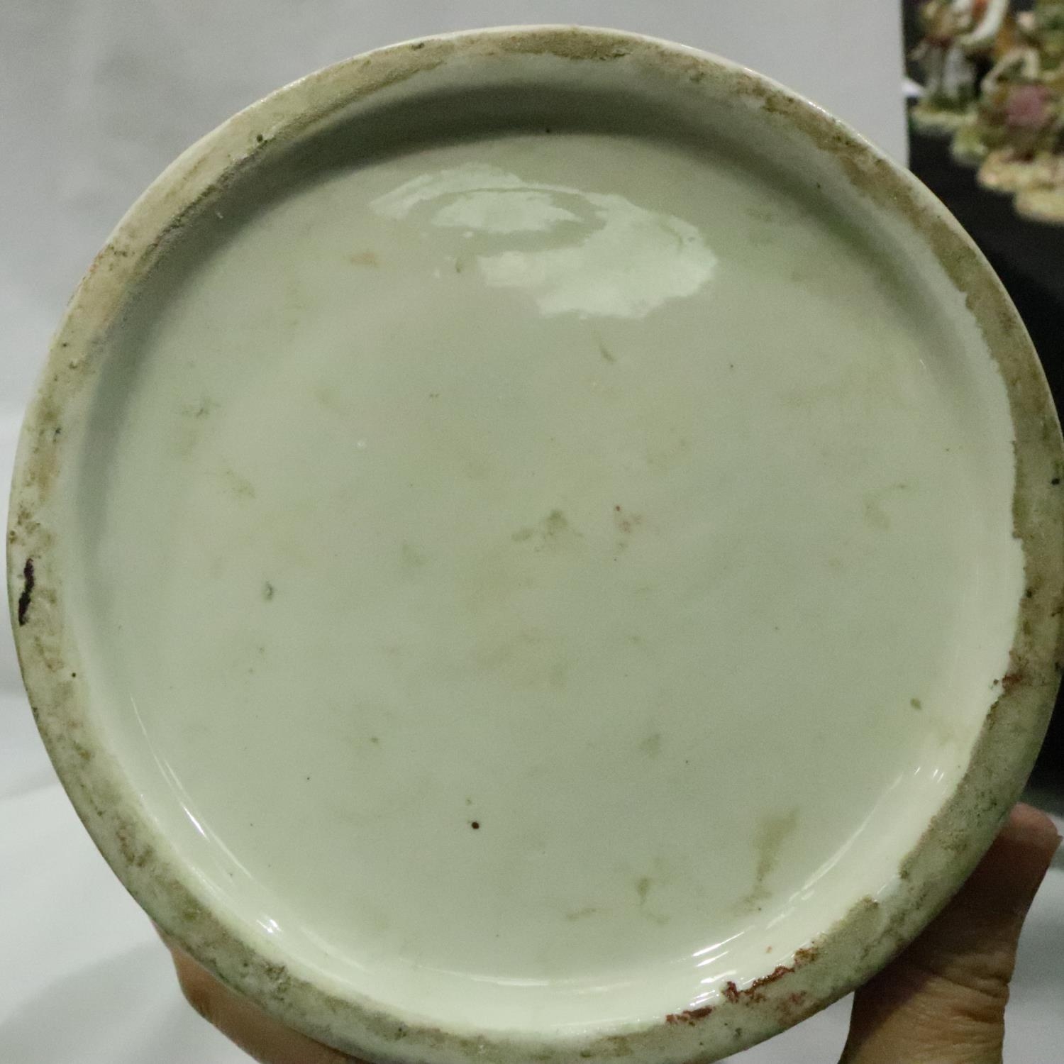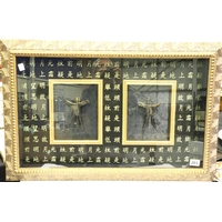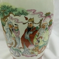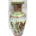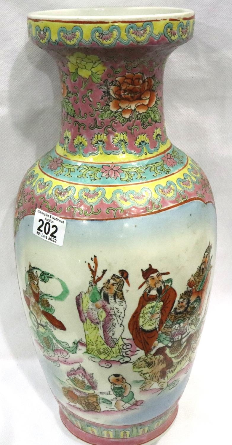 Large Oriental floor vase designed with Gods and figures, H: 49 cm. No visible cracks or chips, some pitting. Not available for in-house P&P, contact Paul O'Hea at Mailboxes on 01925 659133