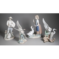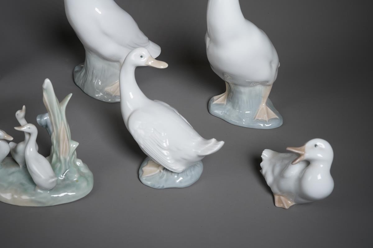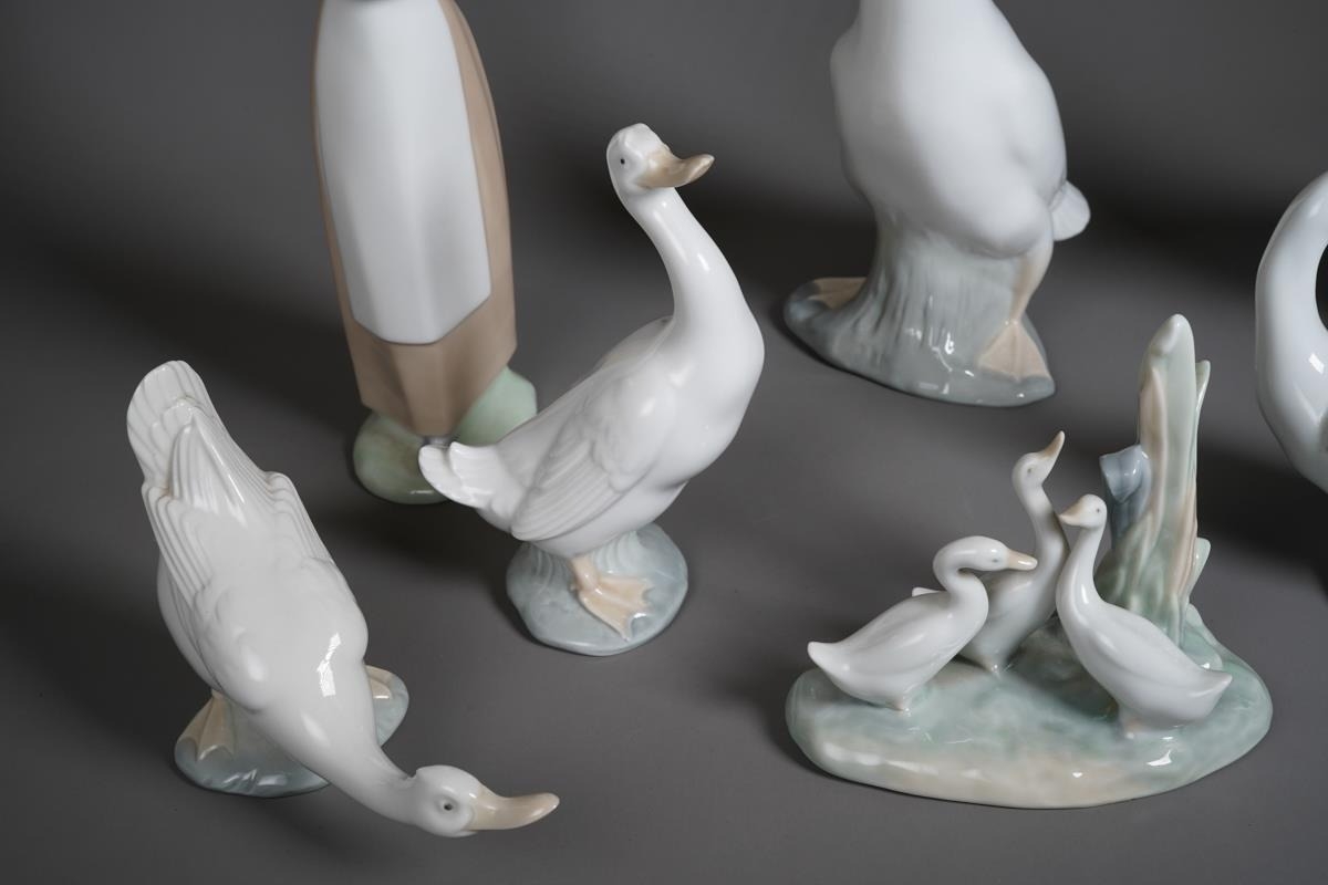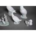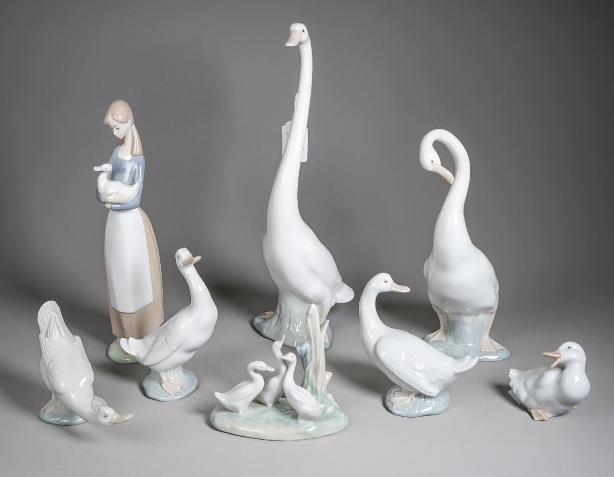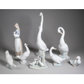 Eight Nao figures of ducks and geese, including with a girl holding a duck, various sizes, height of tallest 34cm, smallest 7cm (8)