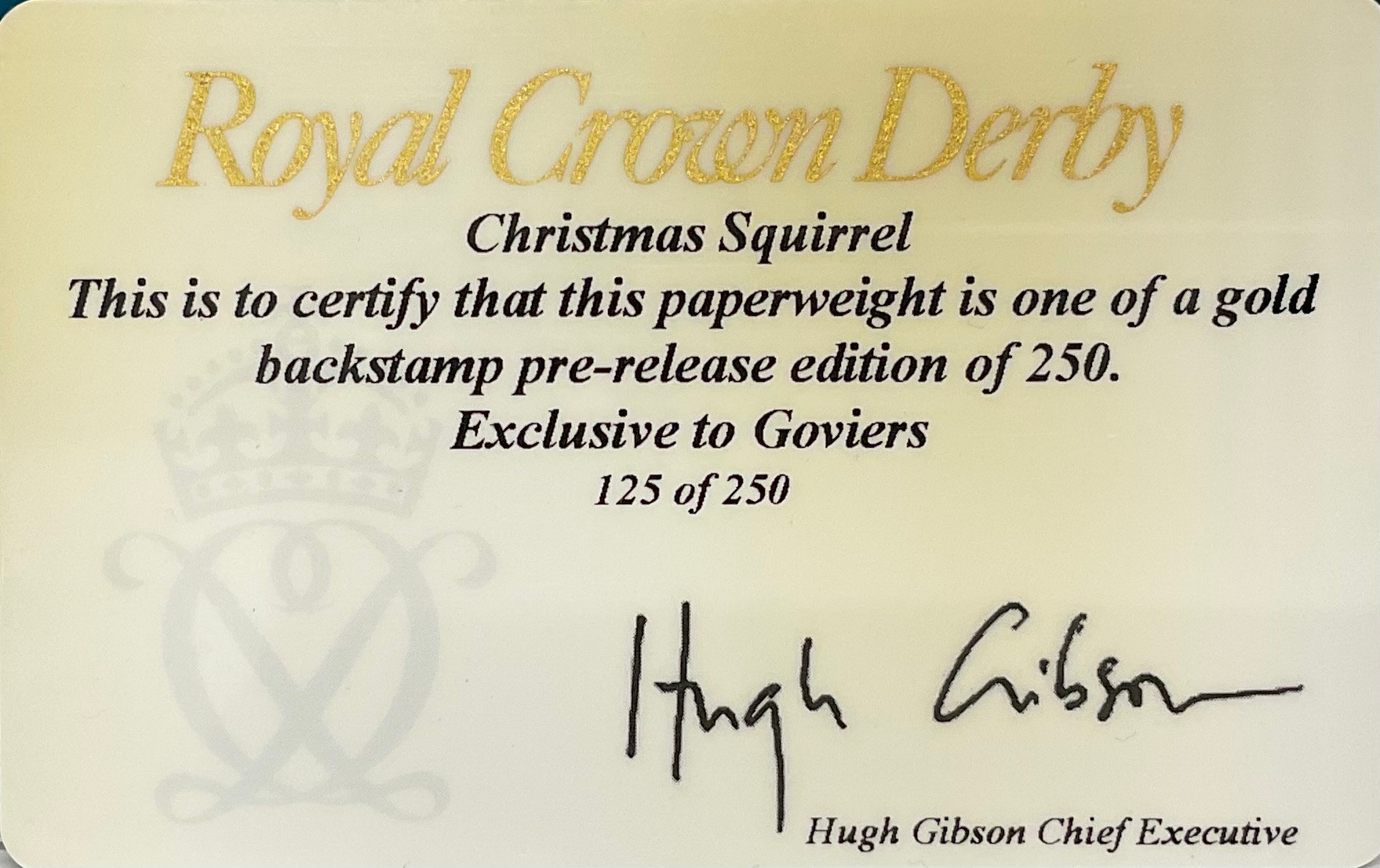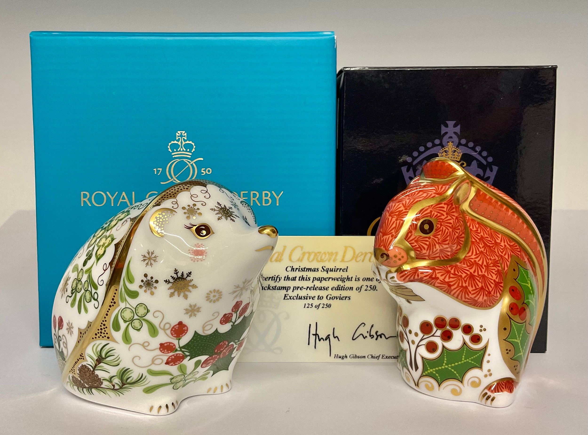 A Royal Crown Derby paperweight, Christmas Hedgehog, gold stopper, 9cm, printed mark in grey, boxed; another, Christmas Squirrel, gold backstamp pre-release, exclusive to Goviers, limited edition 125/250, gold stopper, 9cm, printed mark in gold, certificate, boxed (2)