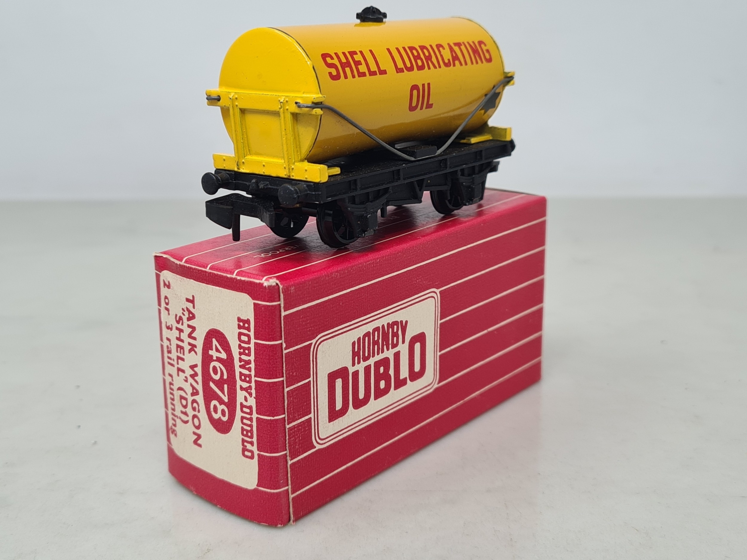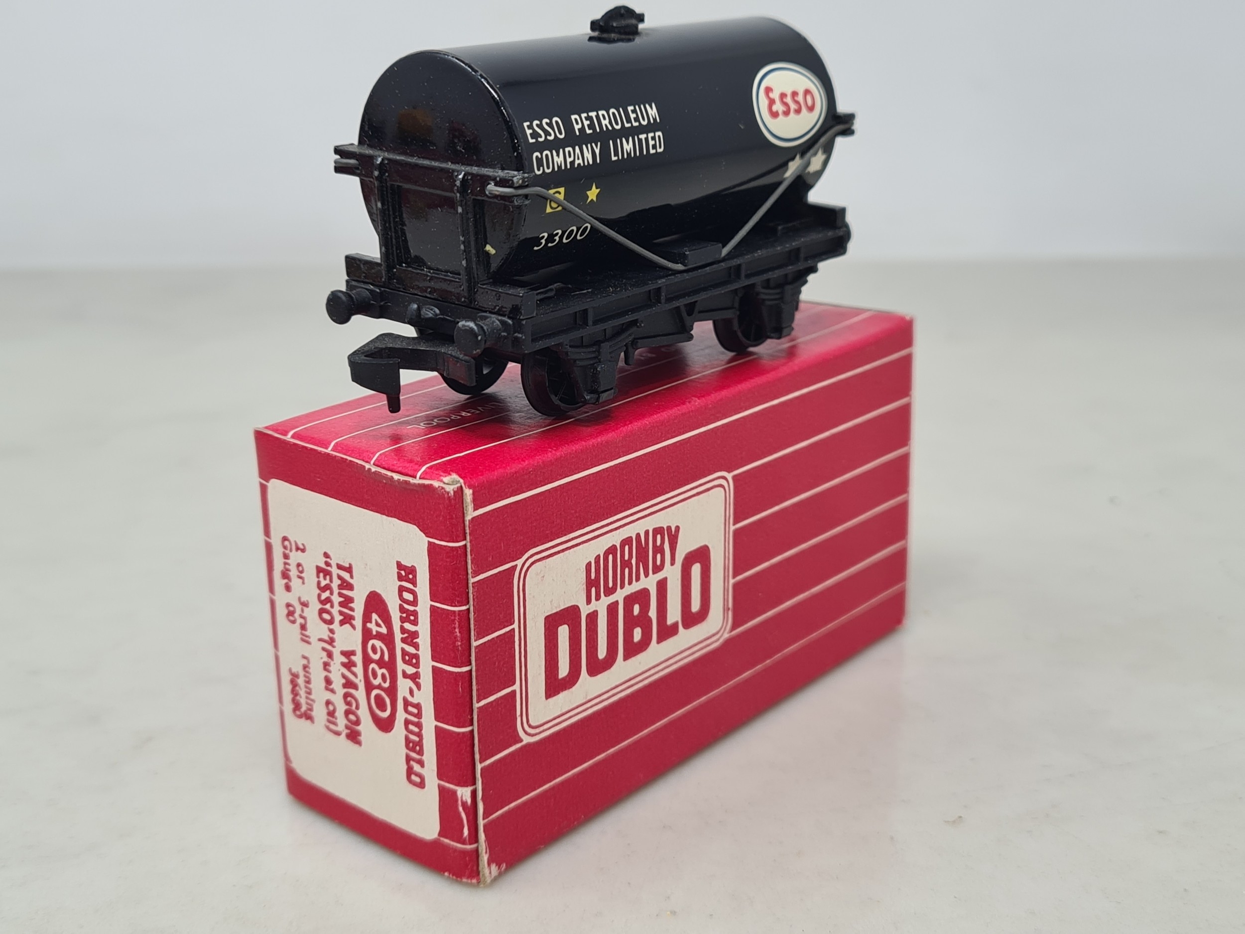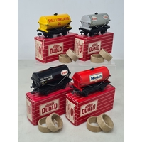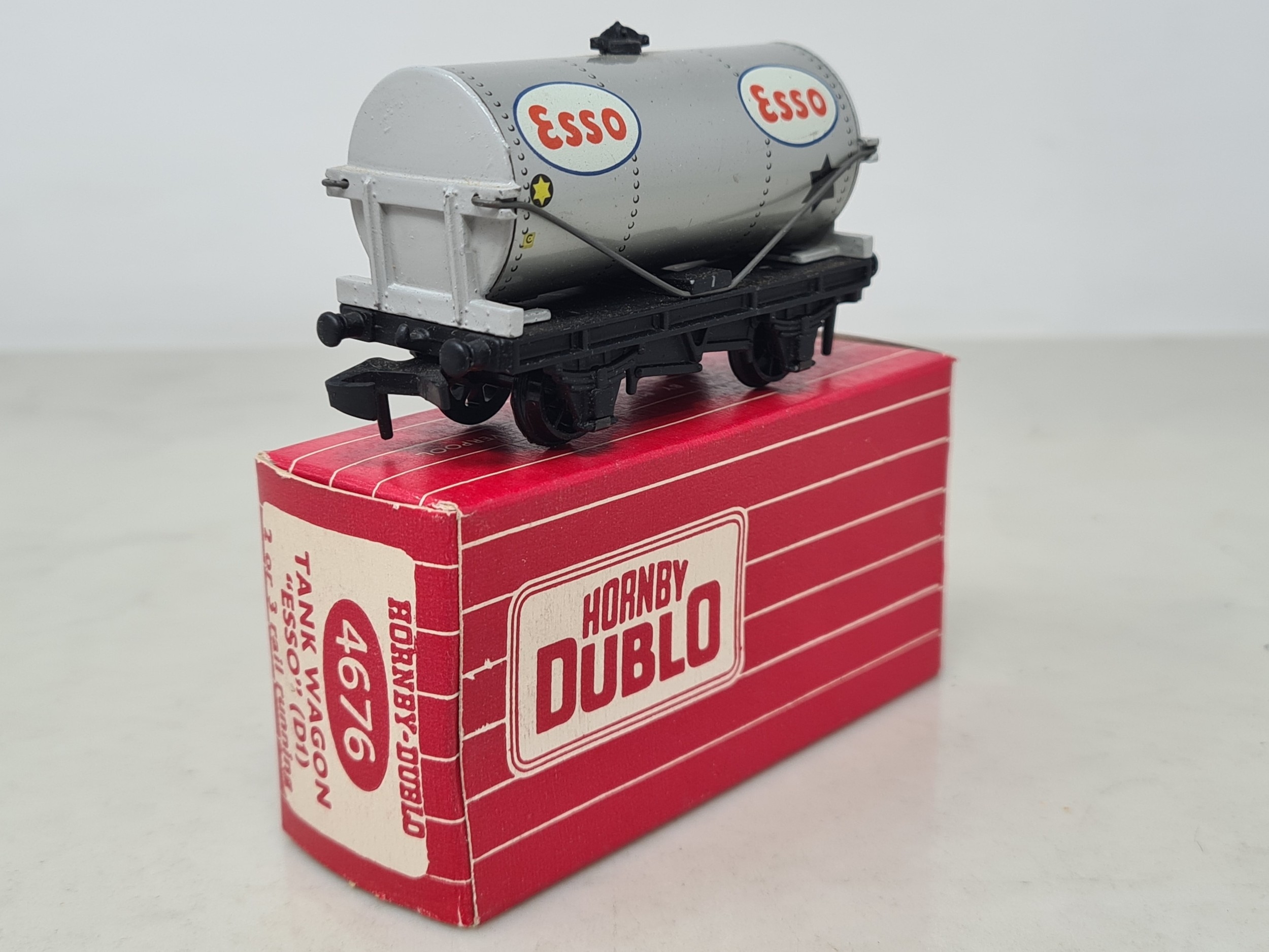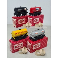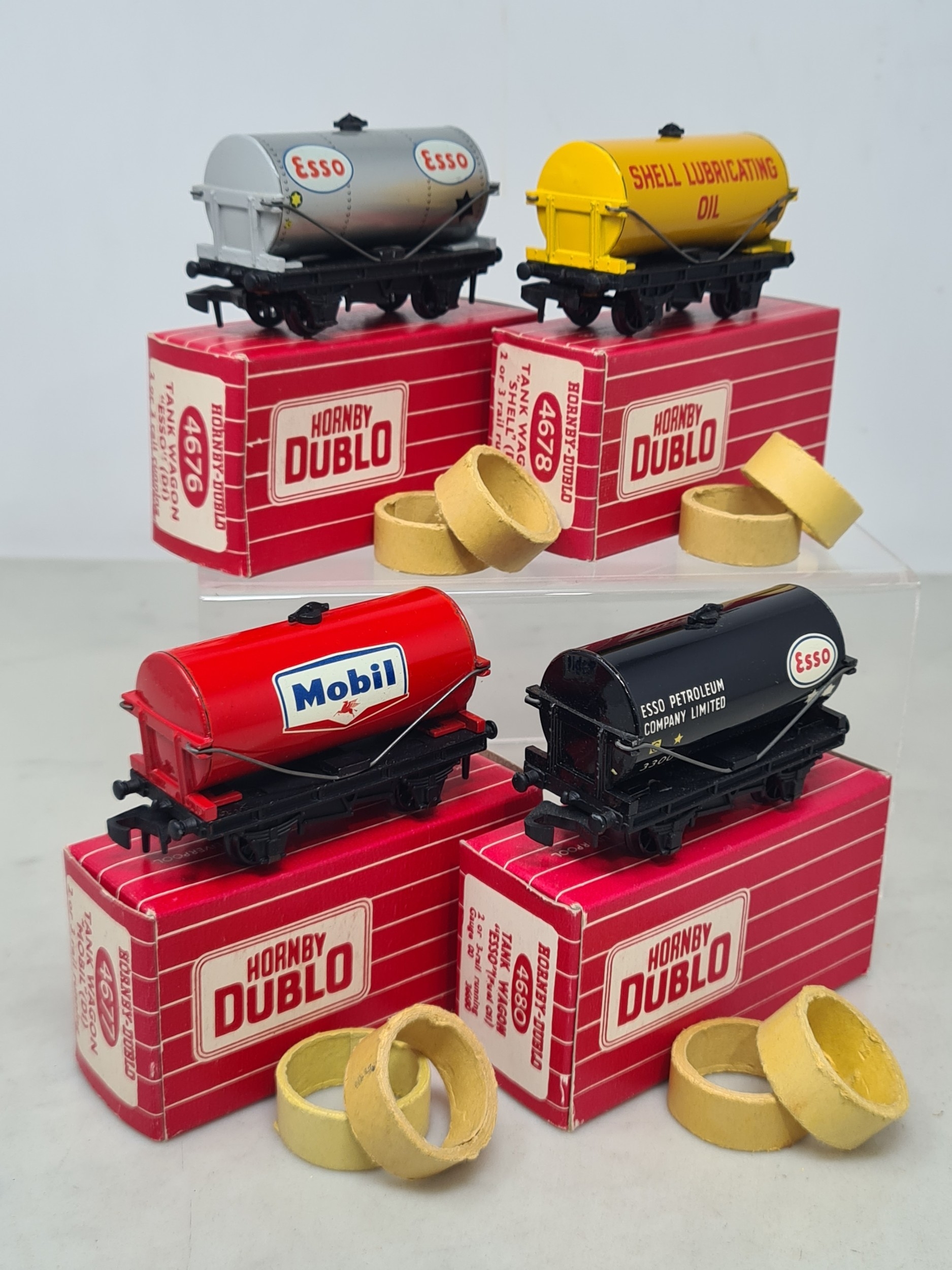 A reference collection of boxed Hornby Dublo second issue Tank Wagons with plastic couplings and closed brake gear comprising 4676 silver 'Esso', 4677 'Mobil', 4678 'Shell' and 4680 black 'Esso', M. Boxes Ex with yellow type packing rings (4676/77/78 correct boxes with large numbers, 4680 box is a standard issue)