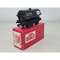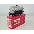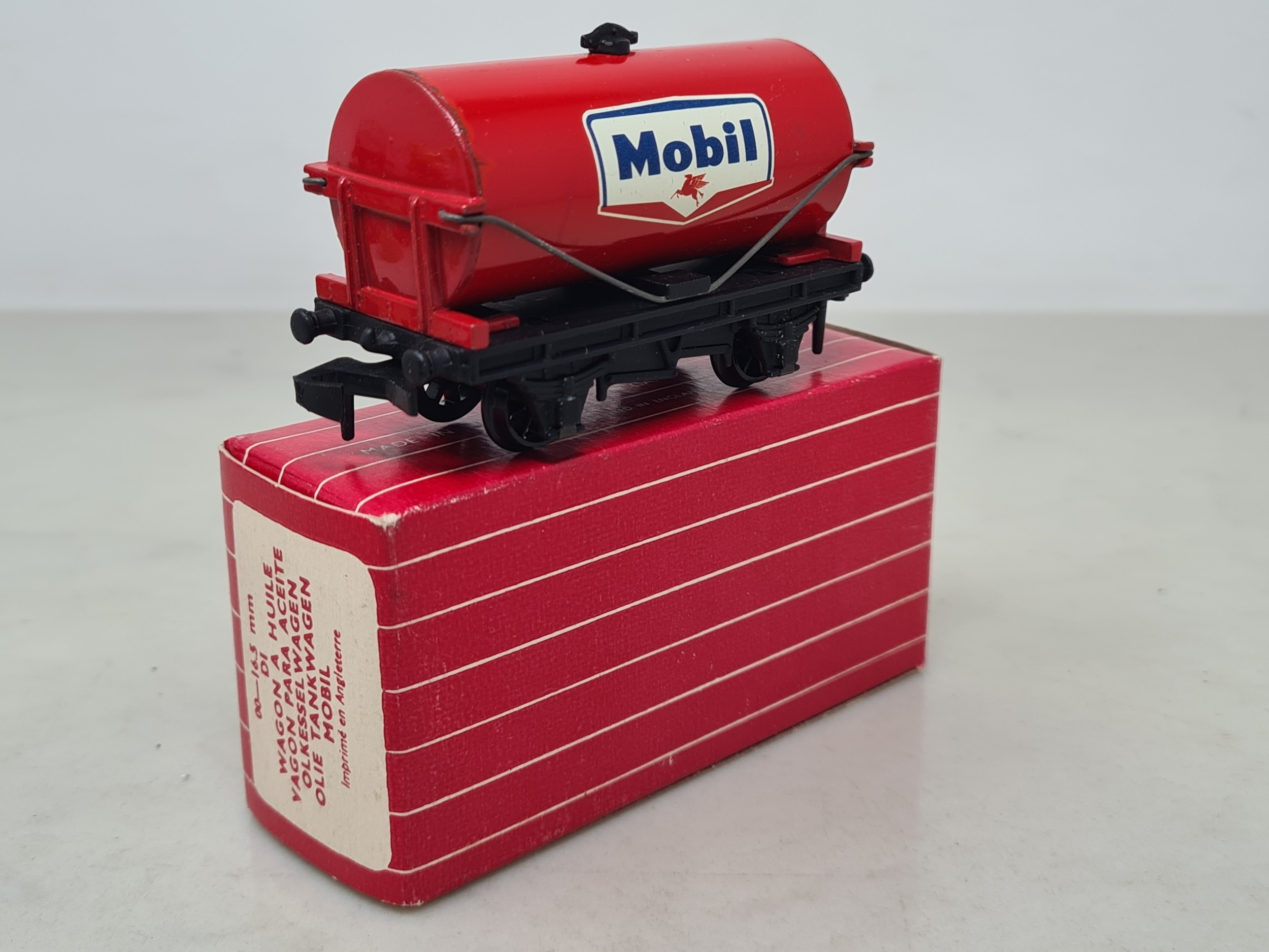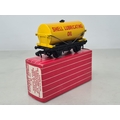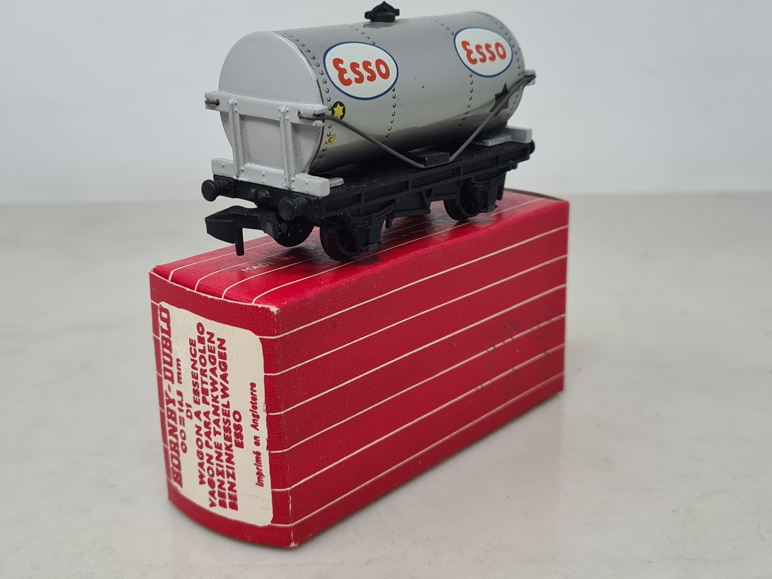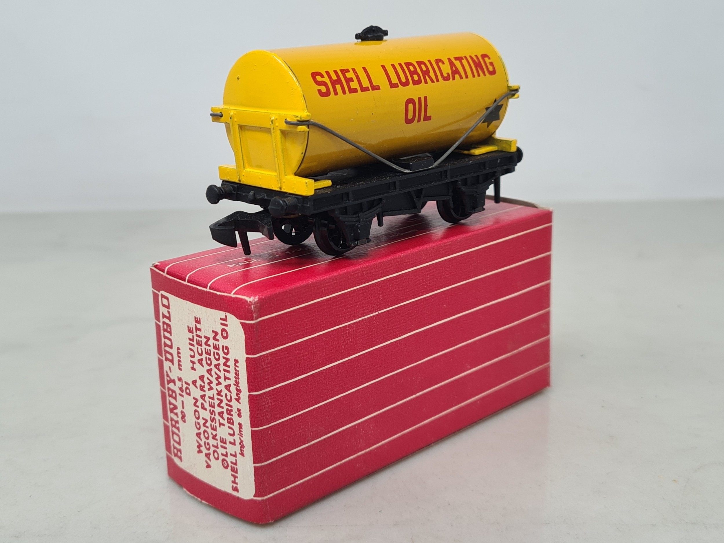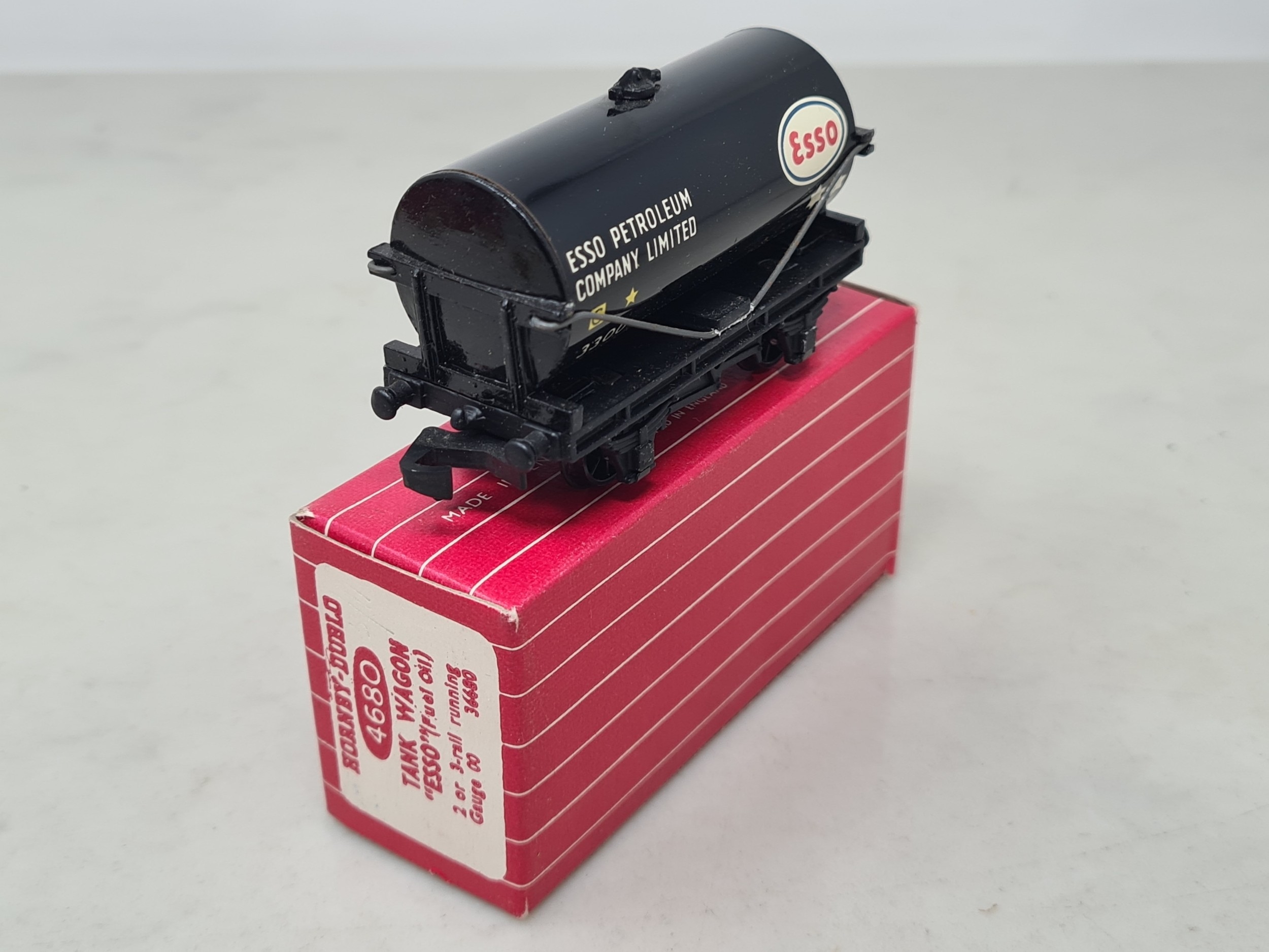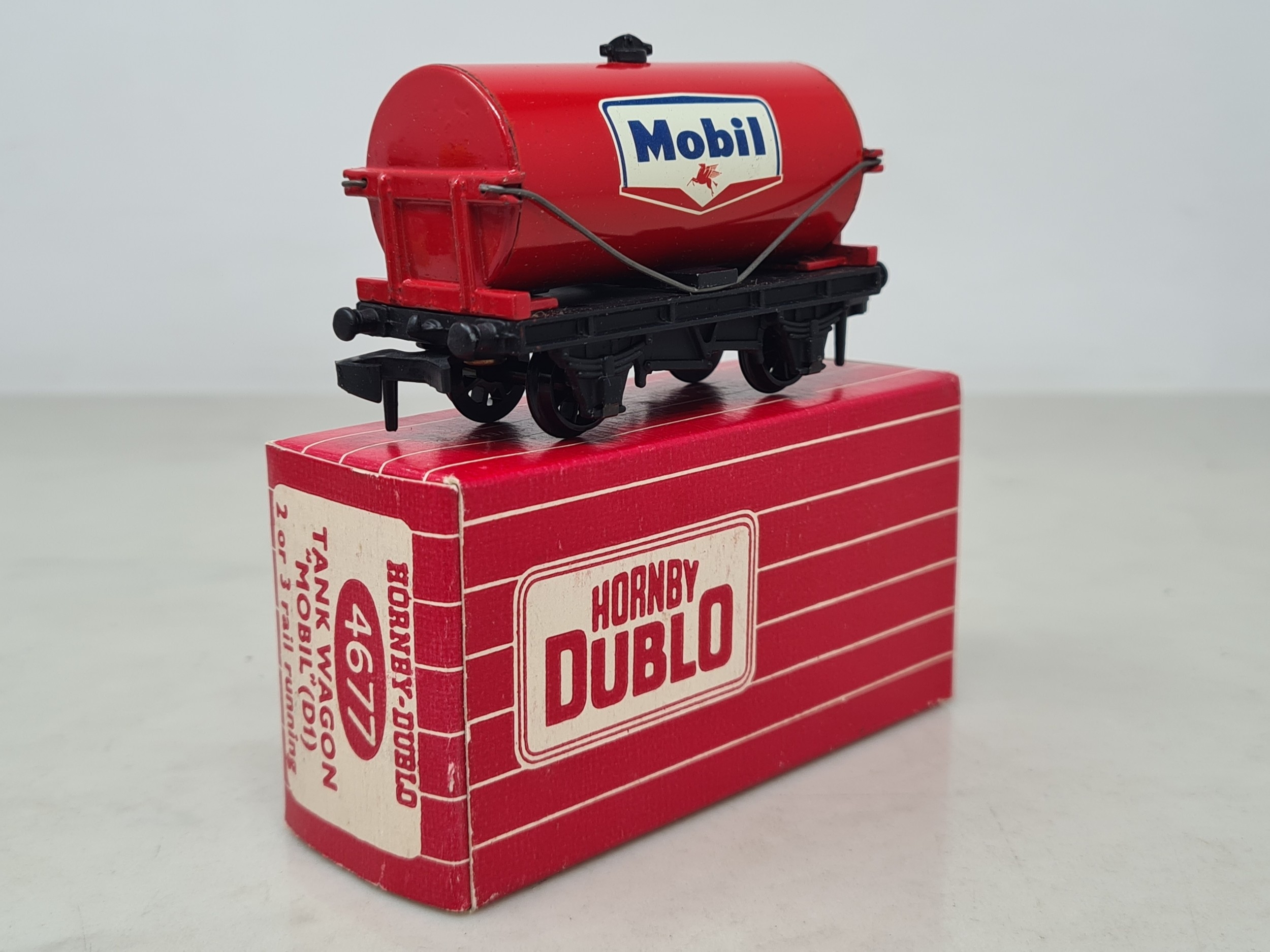 A reference collection of boxed Hornby Dublo second issue Tank Wagons with plastic couplings and closed brake gear comprising 4676 silver 'Esso', 4677 'Mobil', 4678 'Shell' and 4680 black 'Esso', M. Boxes Ex with yellow type packing rings (4676/77/78 correct boxes with large numbers, 4680 box is a standard issue)