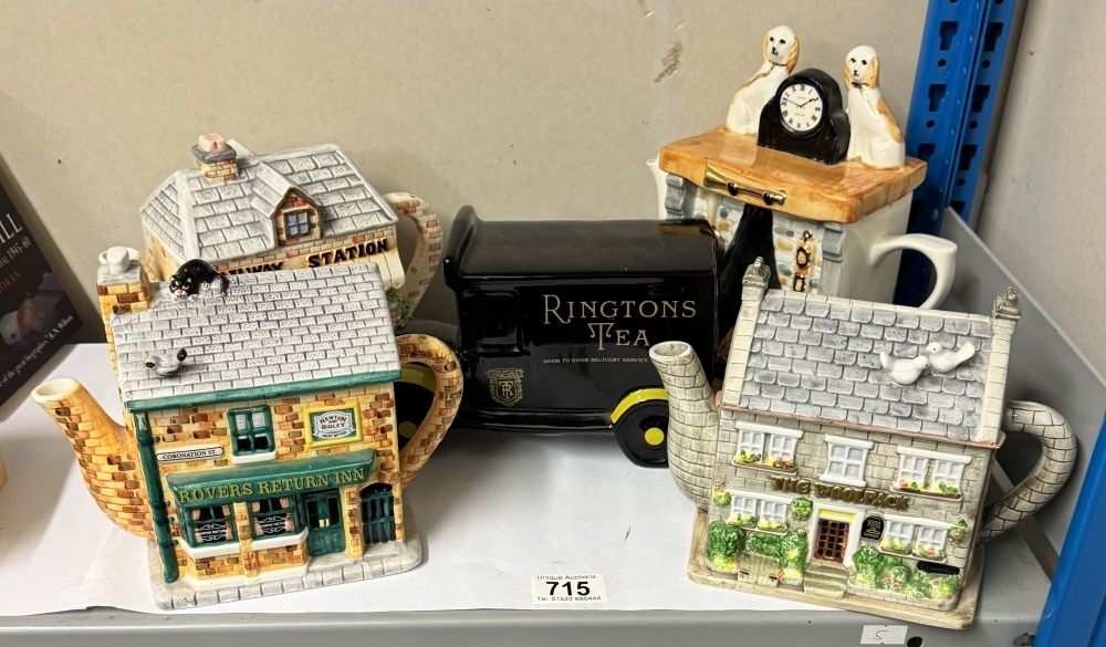 4 collectors teapots inc the Woolpack, Rovers Return, Railway Station etc and Ringtons van money box