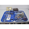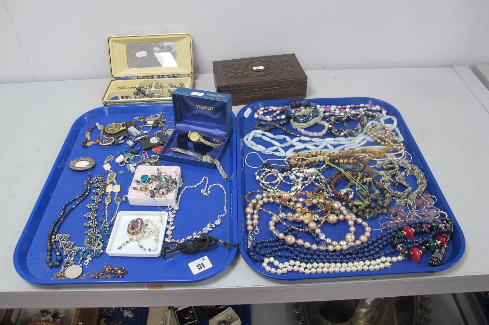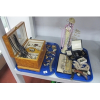 A Mixed Lot of Assorted Costume Jewellery, including imitation and fresh water pearls, assorted necklaces, earrings, bracelets, ladies wristwatches, carved wood trinket box, miniature photograph frame, keyrings, brooch etc :- Two Trays