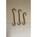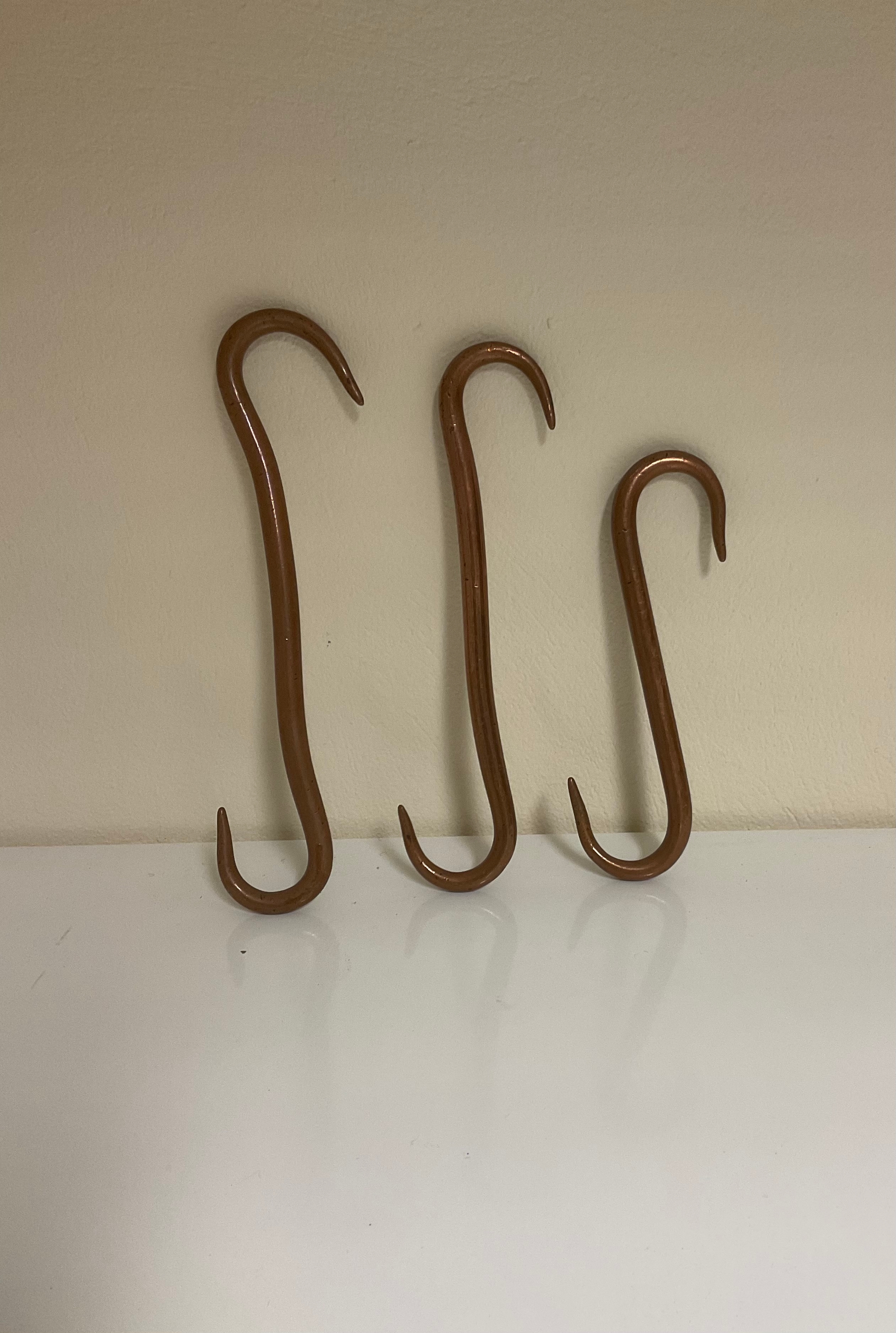 Three copper meat / smokehouse hooks - 17.5 cms 21.5 cms and 23 cms