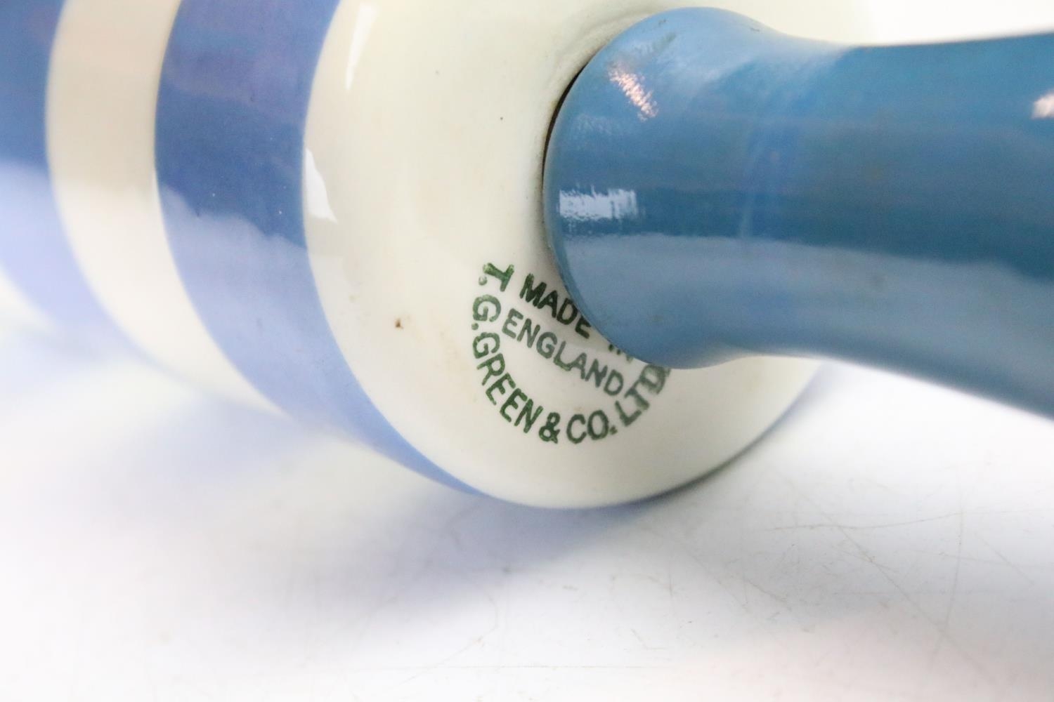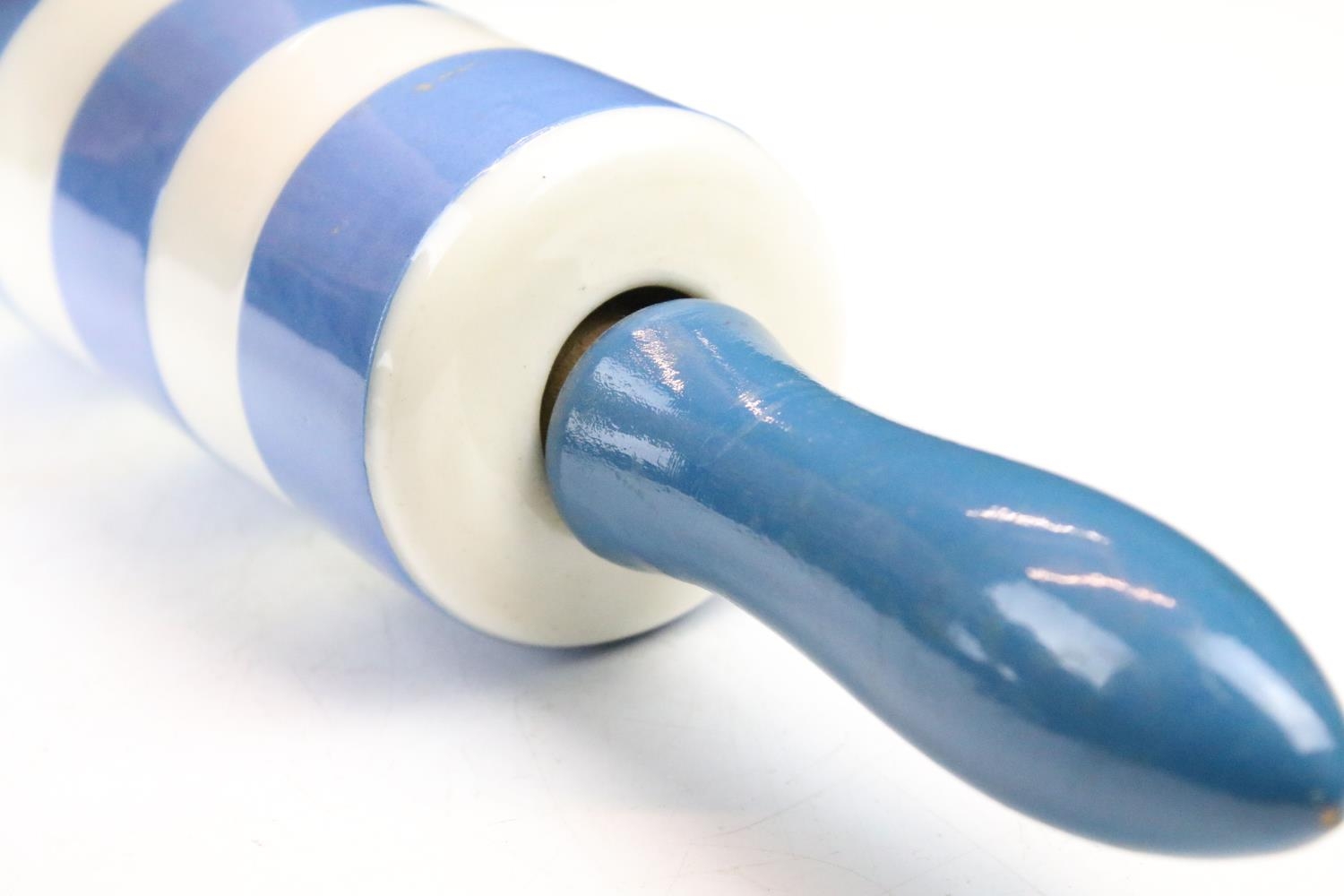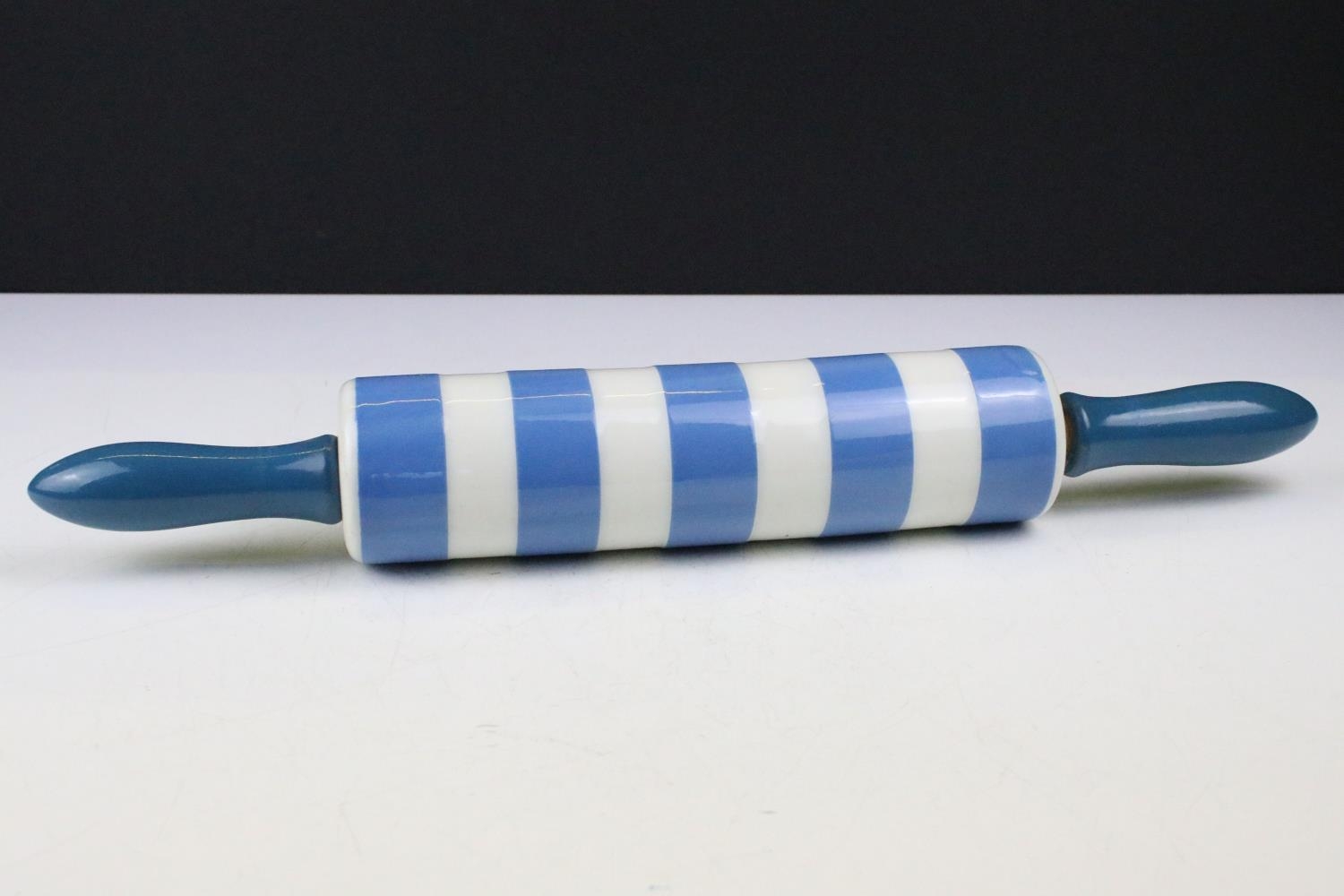 T.G. Green Blue and White Cornishware Rolling Pin, green T.G. Green & Co Ltd mark to end, 47cm long