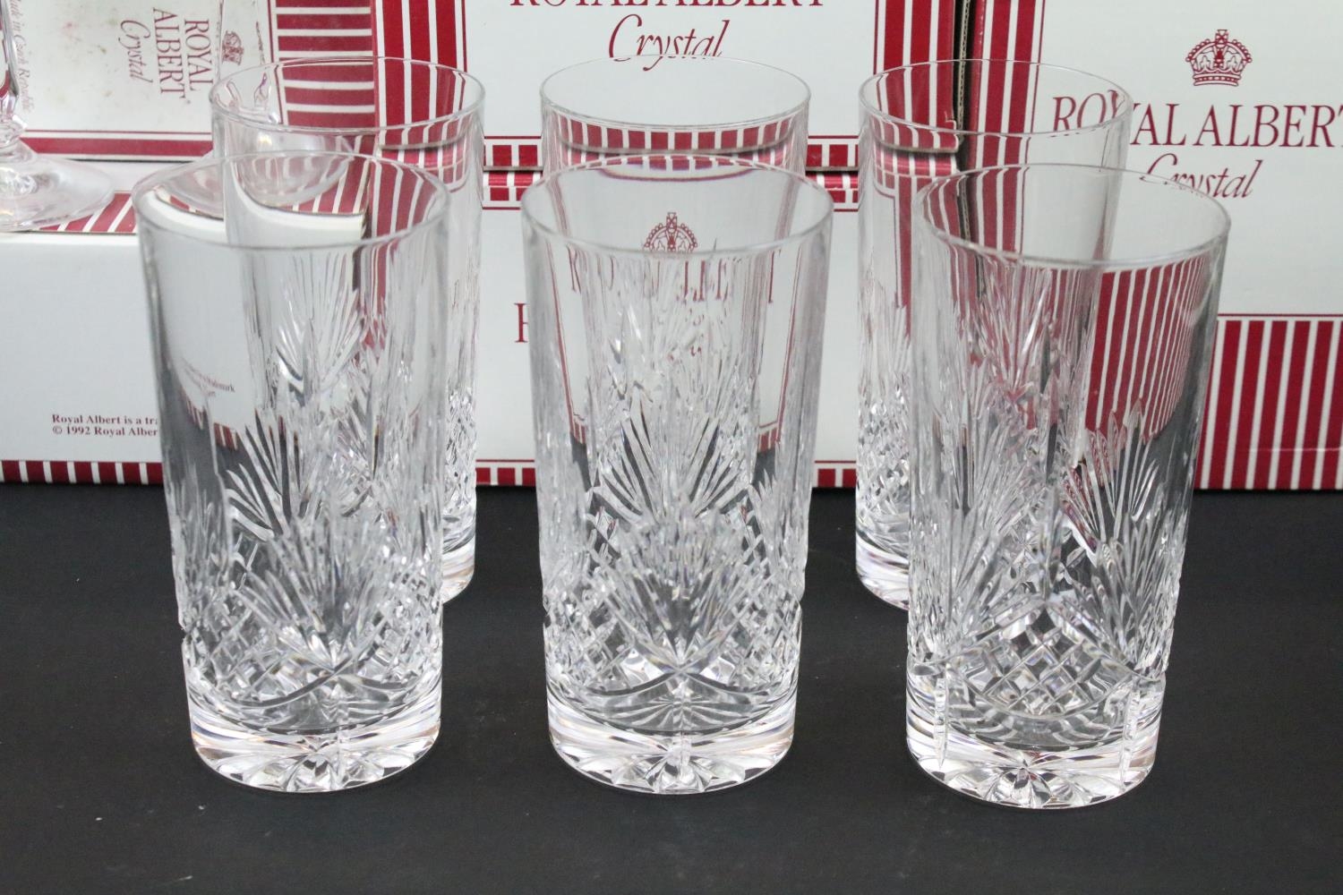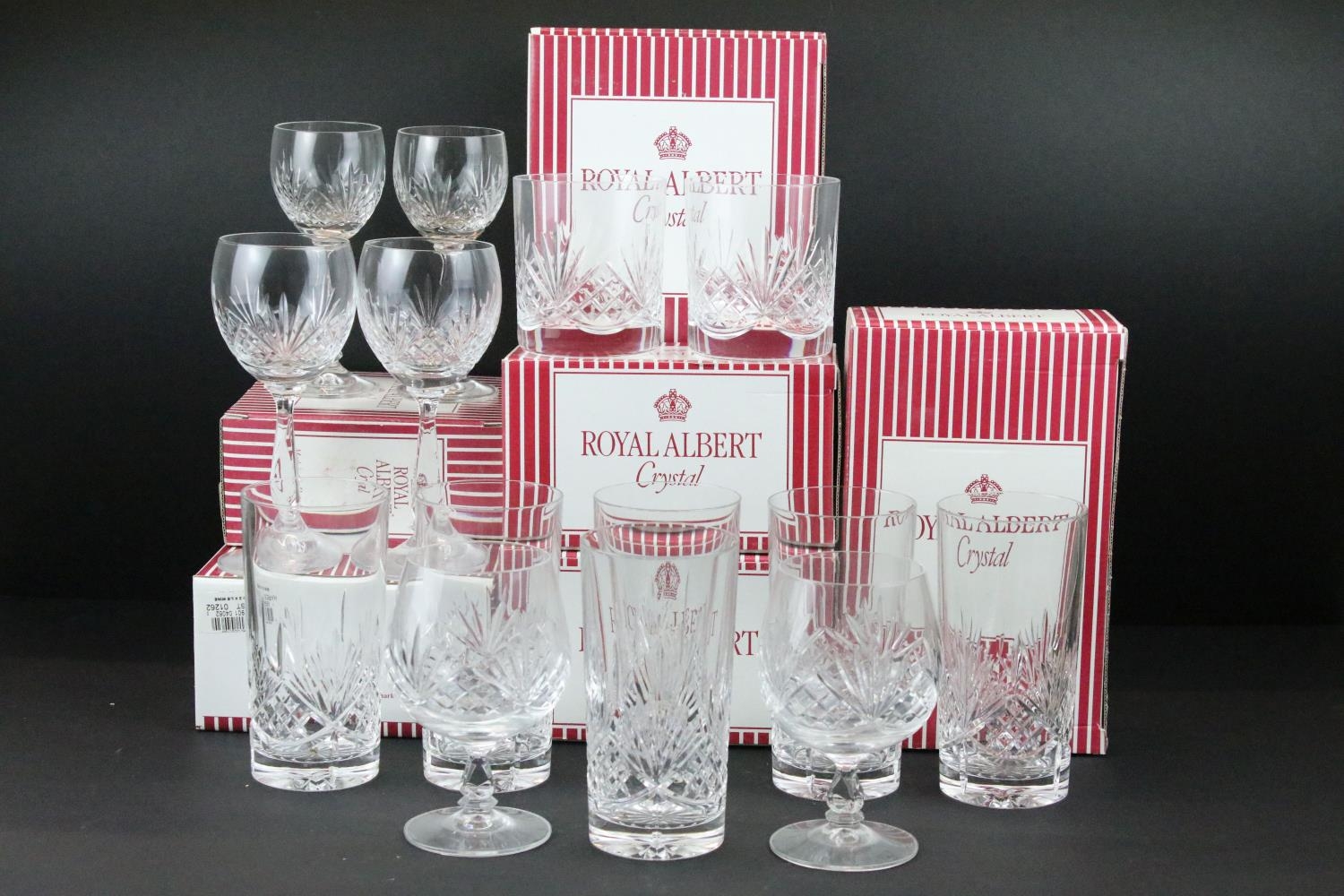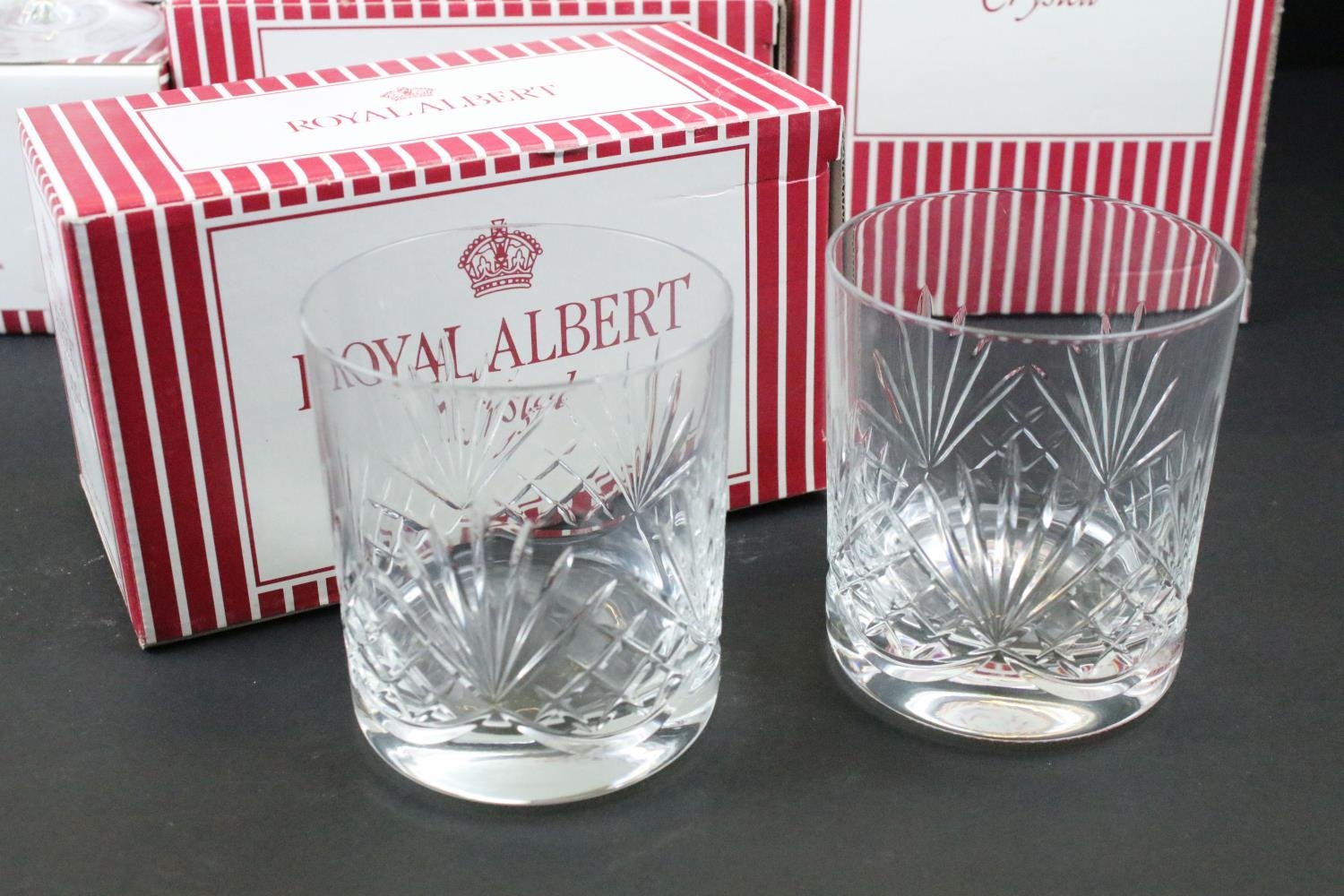 Collection of 17 boxed Royal Albert Crystal glass sets to include tumblers, Champagne flutes, wine glasses, etc; together with eight unboxed glasses (featuring Edinburgh Crystal). (3)
