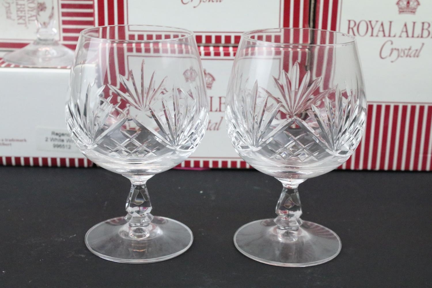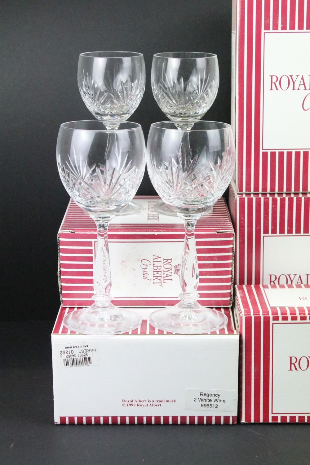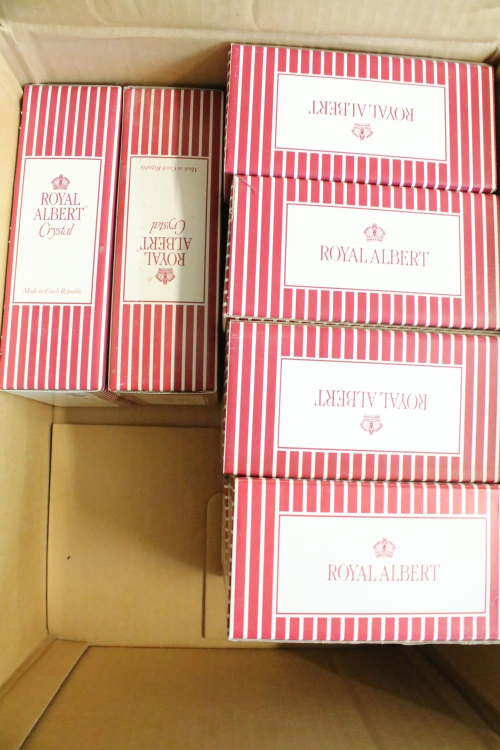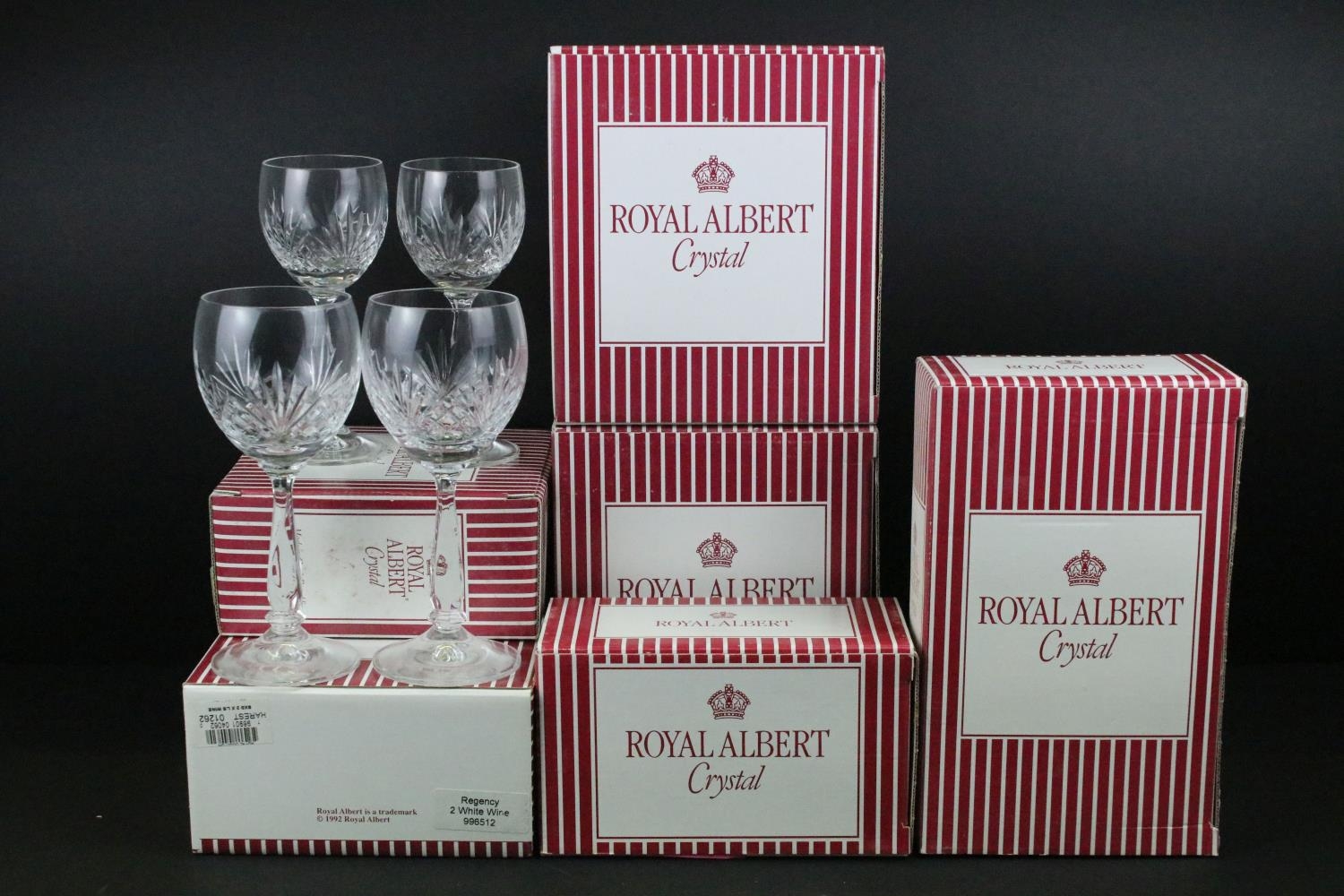 Collection of 17 boxed Royal Albert Crystal glass sets to include tumblers, Champagne flutes, wine glasses, etc; together with eight unboxed glasses (featuring Edinburgh Crystal). (3)