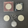 A white metal coin in a white metal mount and chain plus a cased 1967 Gibraltar crown etc