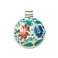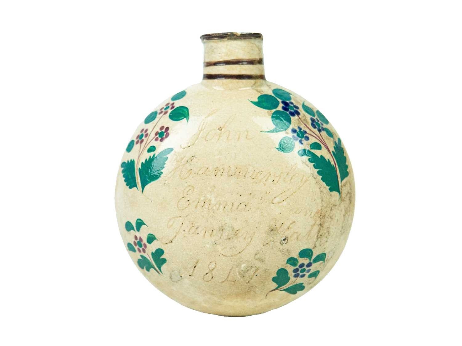 A small documentary pearlware flask. Probably Scottish, painted with floral motifs, and incised with 'John Hammersley Emma......1847'?, diameter 9.5cm.