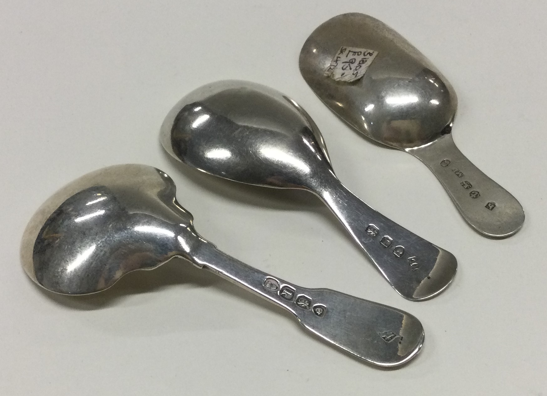 Three Georgian silver caddy spoons. Various dates and makers. Approx. 37 grams. Est. £50 - £80.