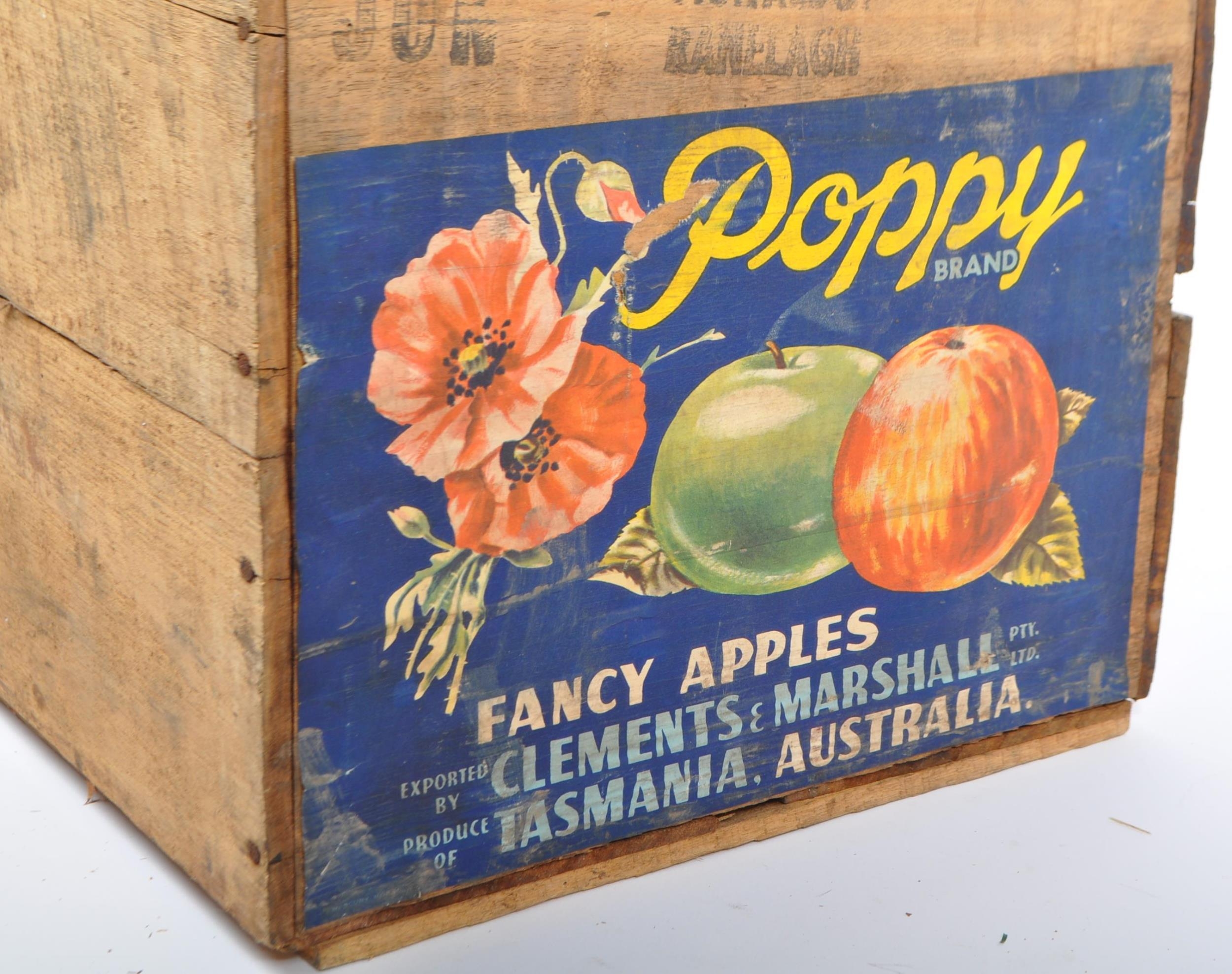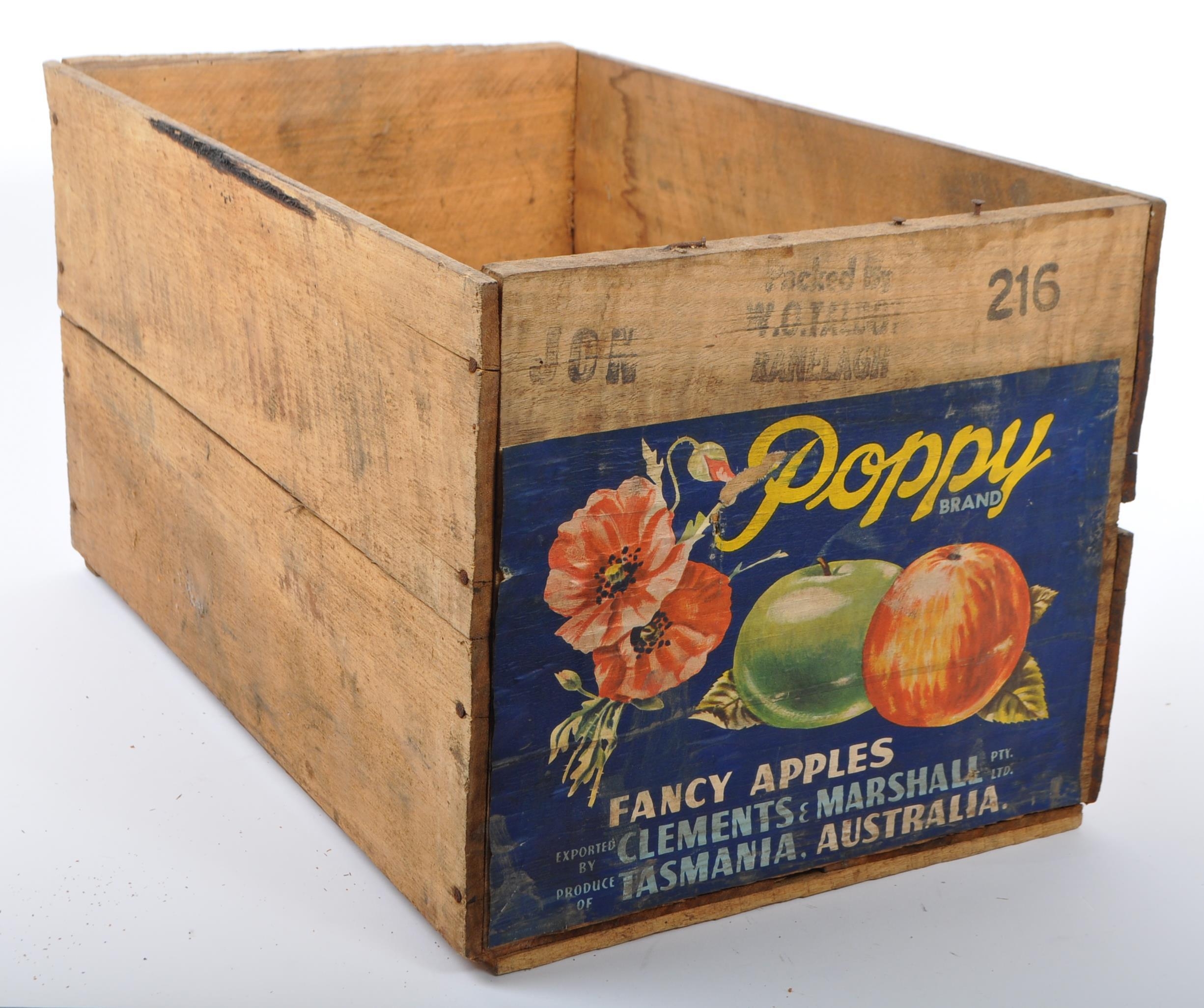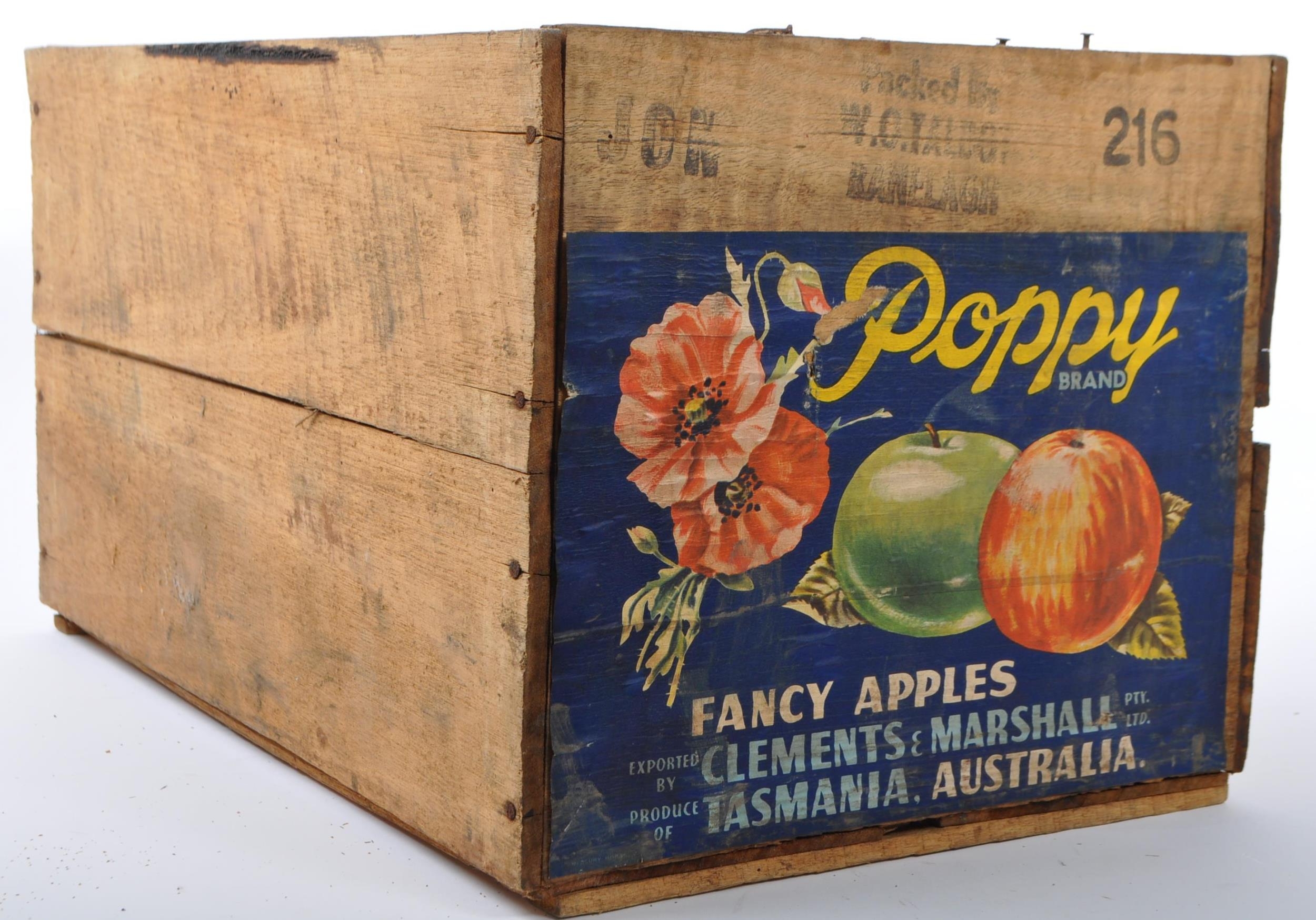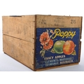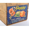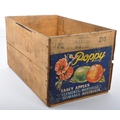 A mid 20th century advertising storage transport crate box. Poppy brand, fancy apples from Tasmania, Australia. 27cm x 50cm x 37cm
