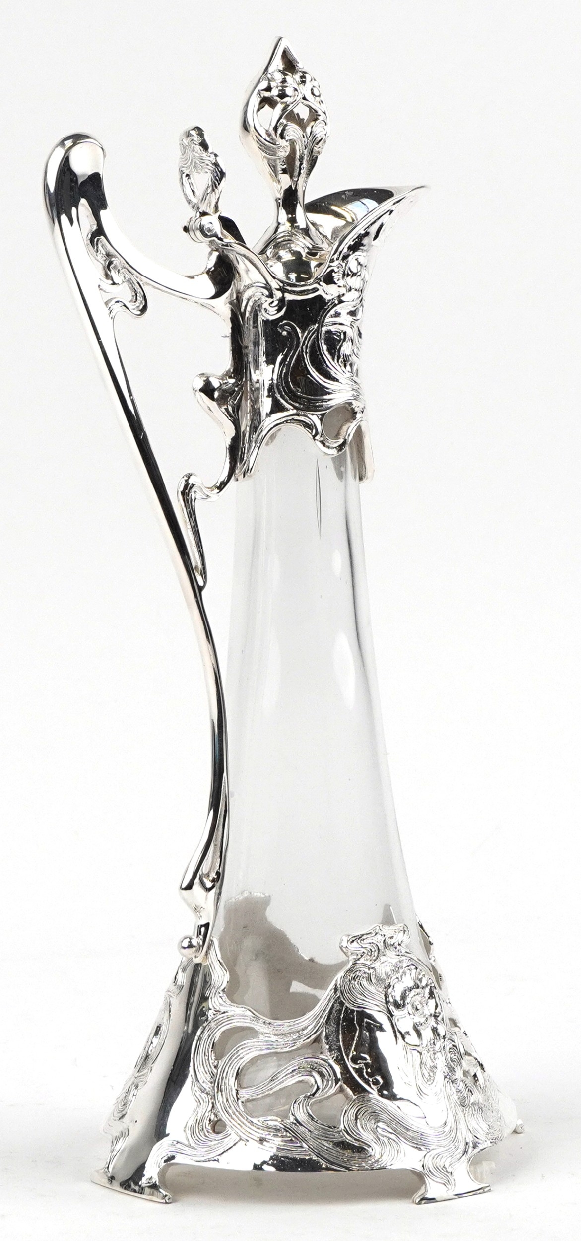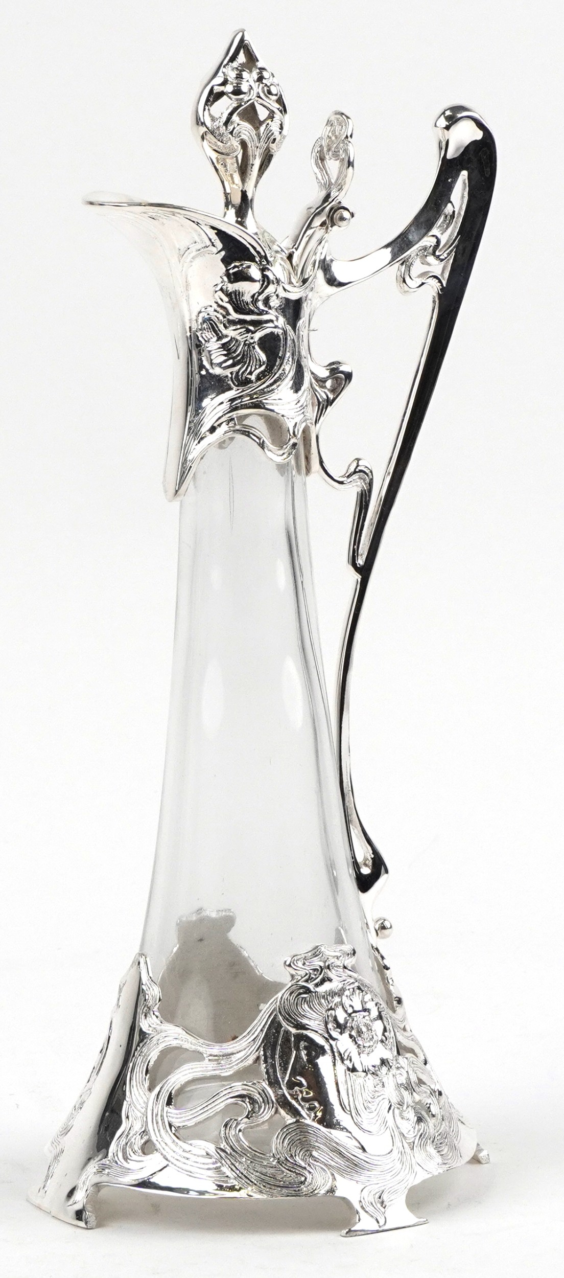 An Art Nouveau style silver plated and glass claret jug decorated with stylized flowers, 41cm high.
