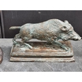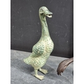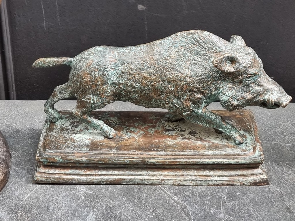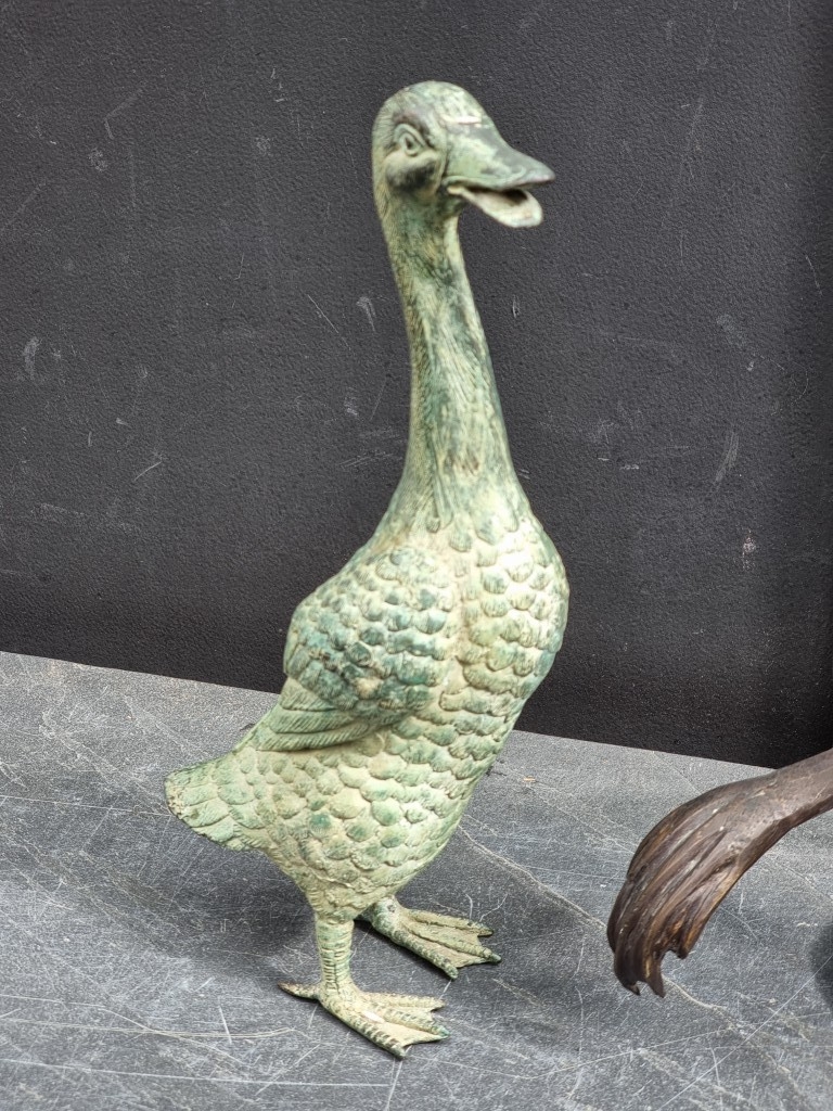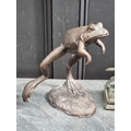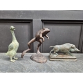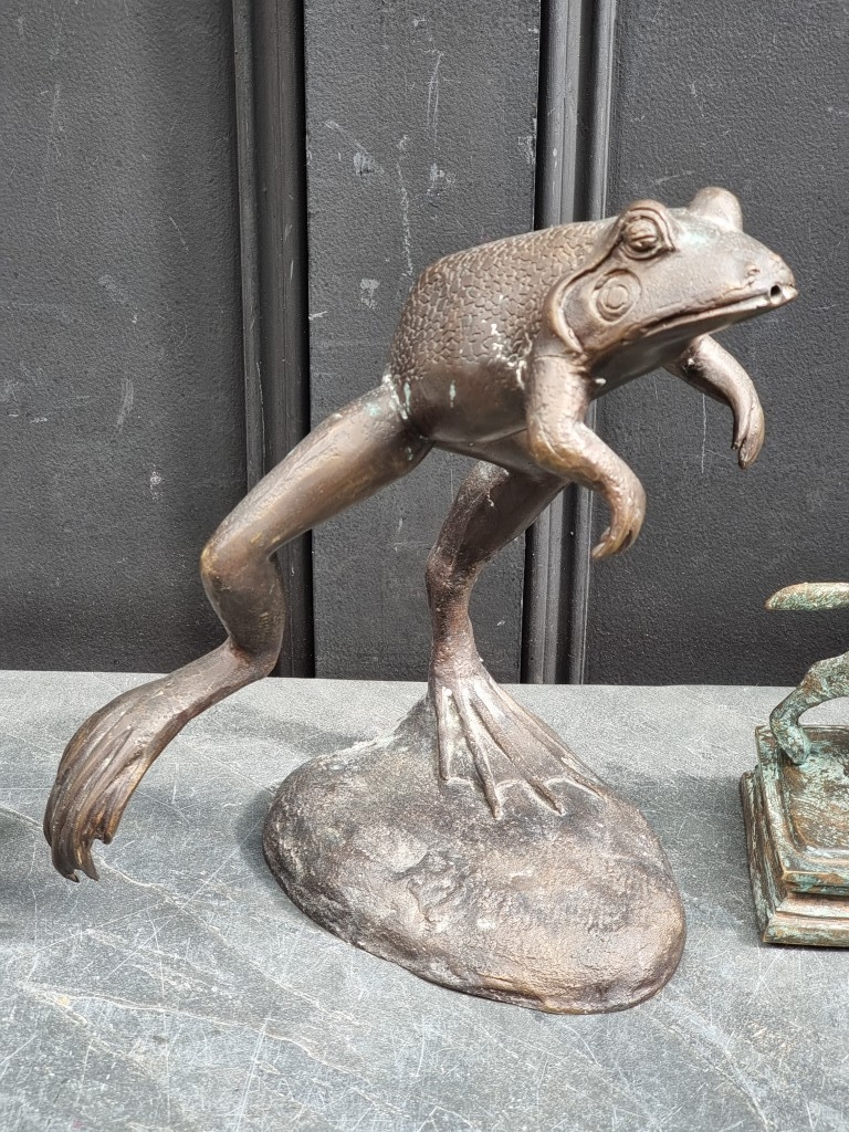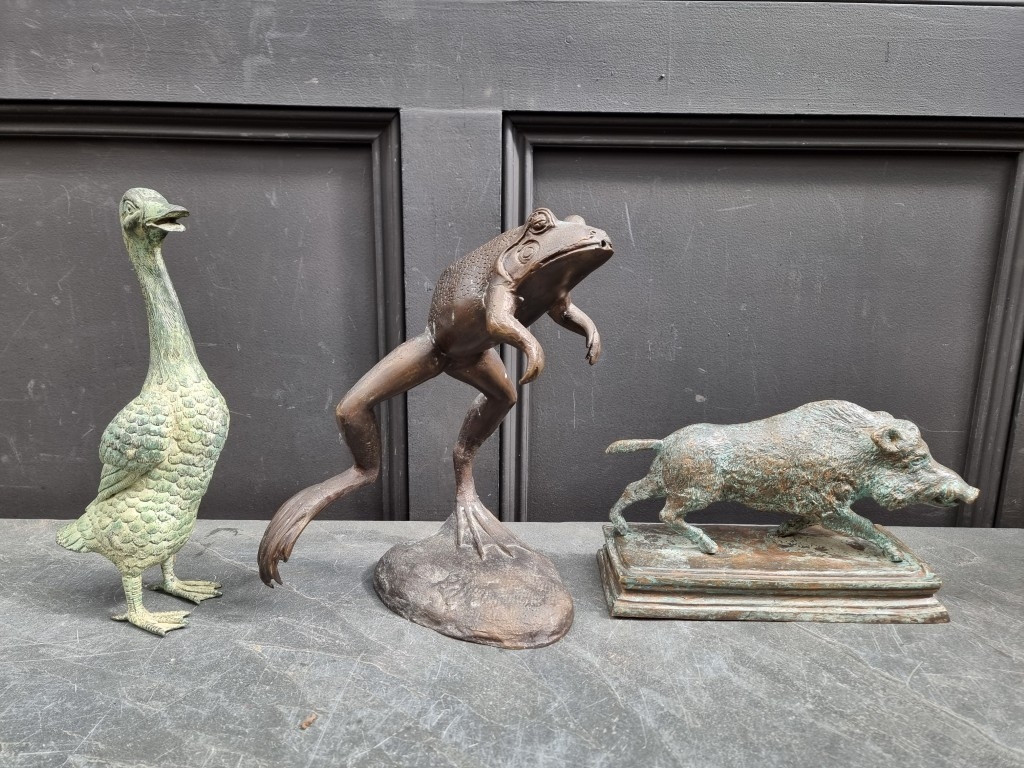 A bronze frog water feature, 30.5cm high; together with another bronze boar, 26.5cm long; and a similar duck, 32cm high. (3)