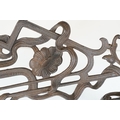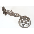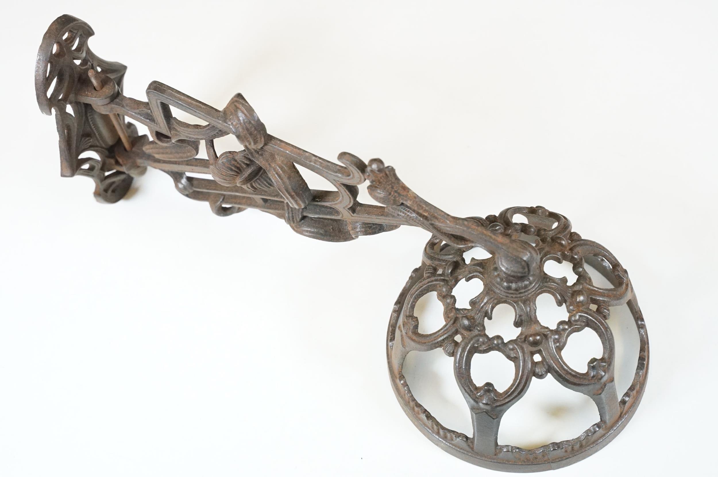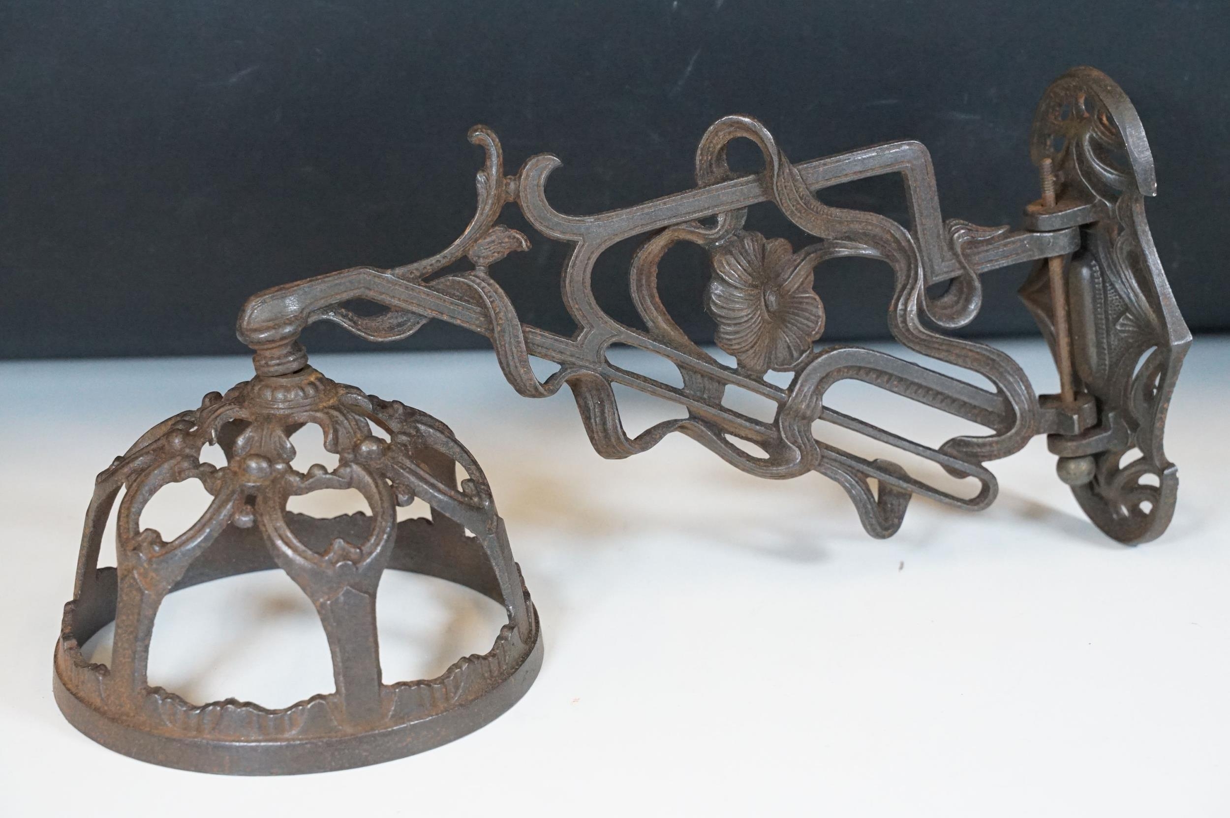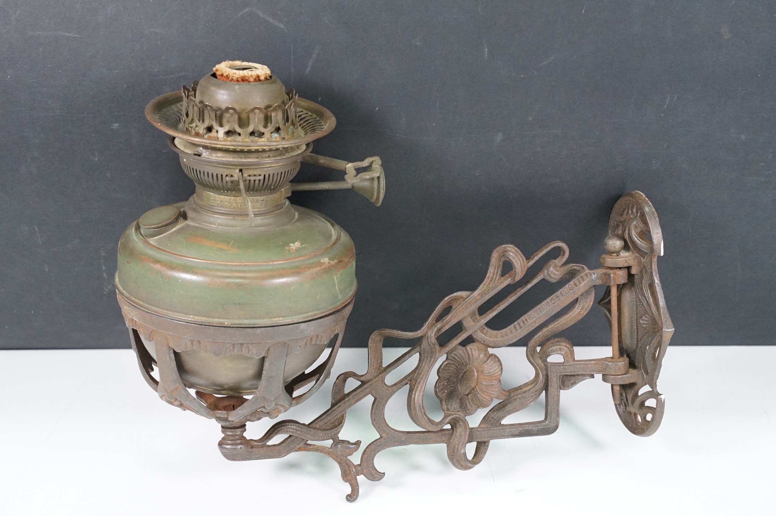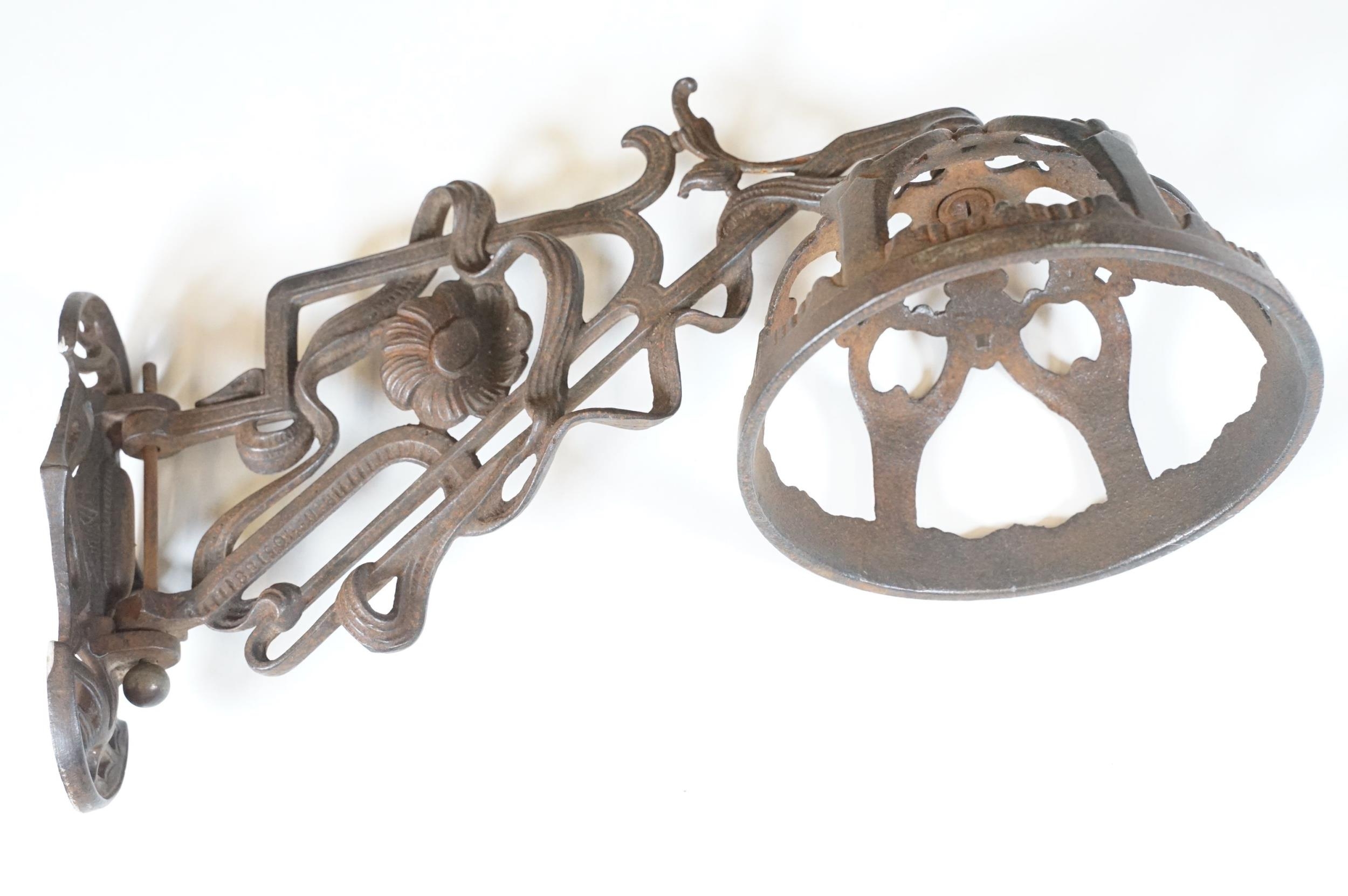 Art nouveau late 19th century pierced iron wall bracket of foliate sinuous design, stamped with a registration number, 36cm long holding a cathedral oil lamp by Jones & Willis