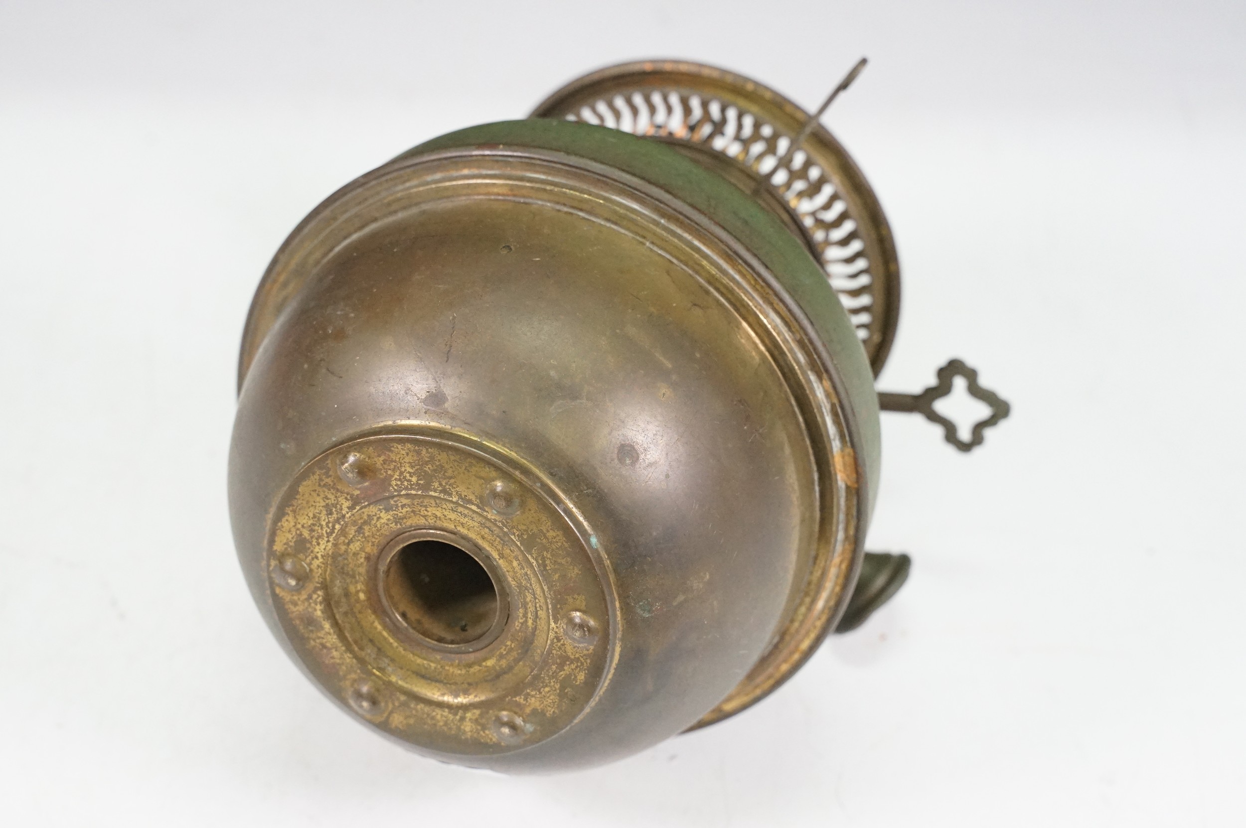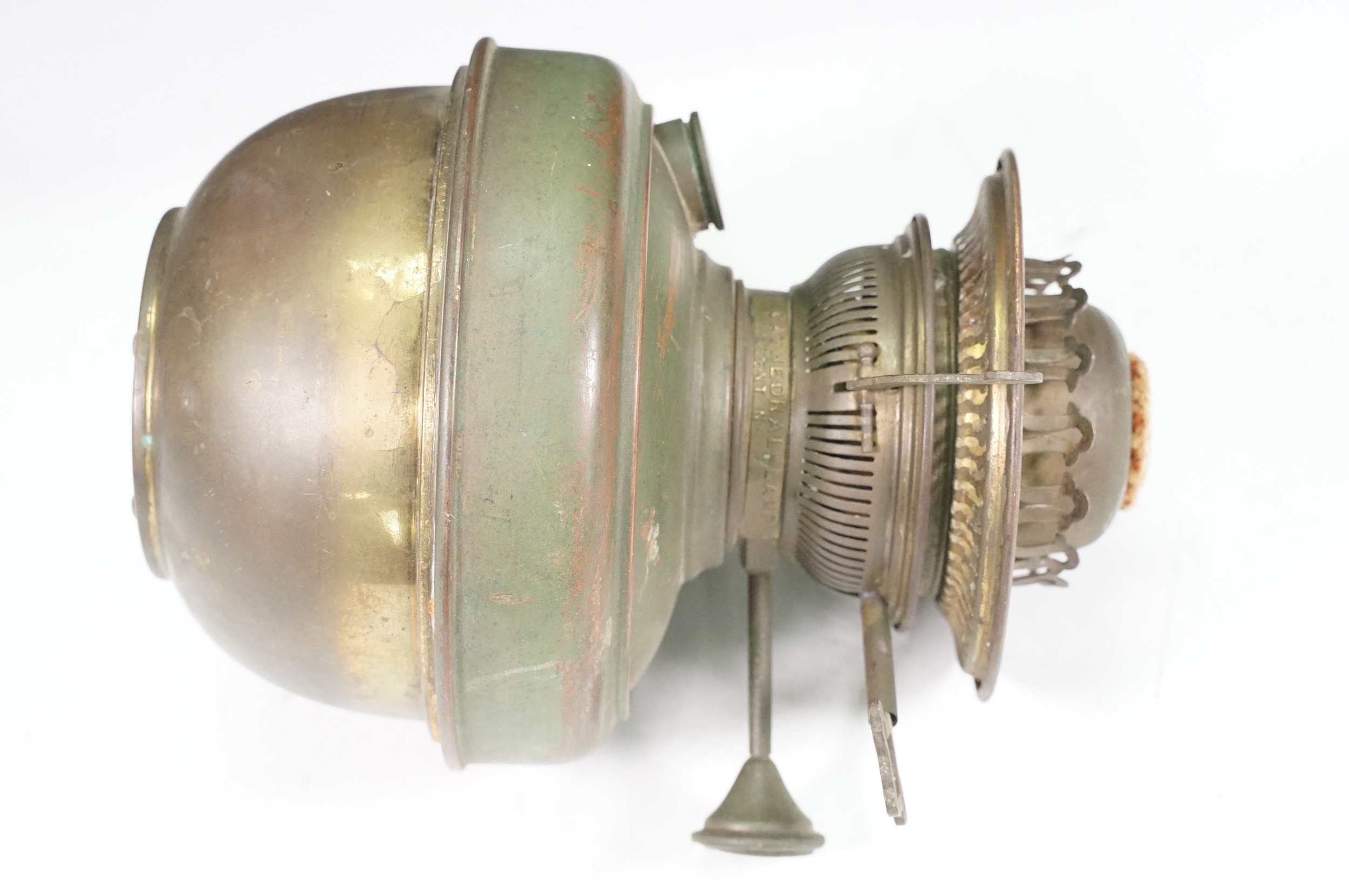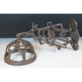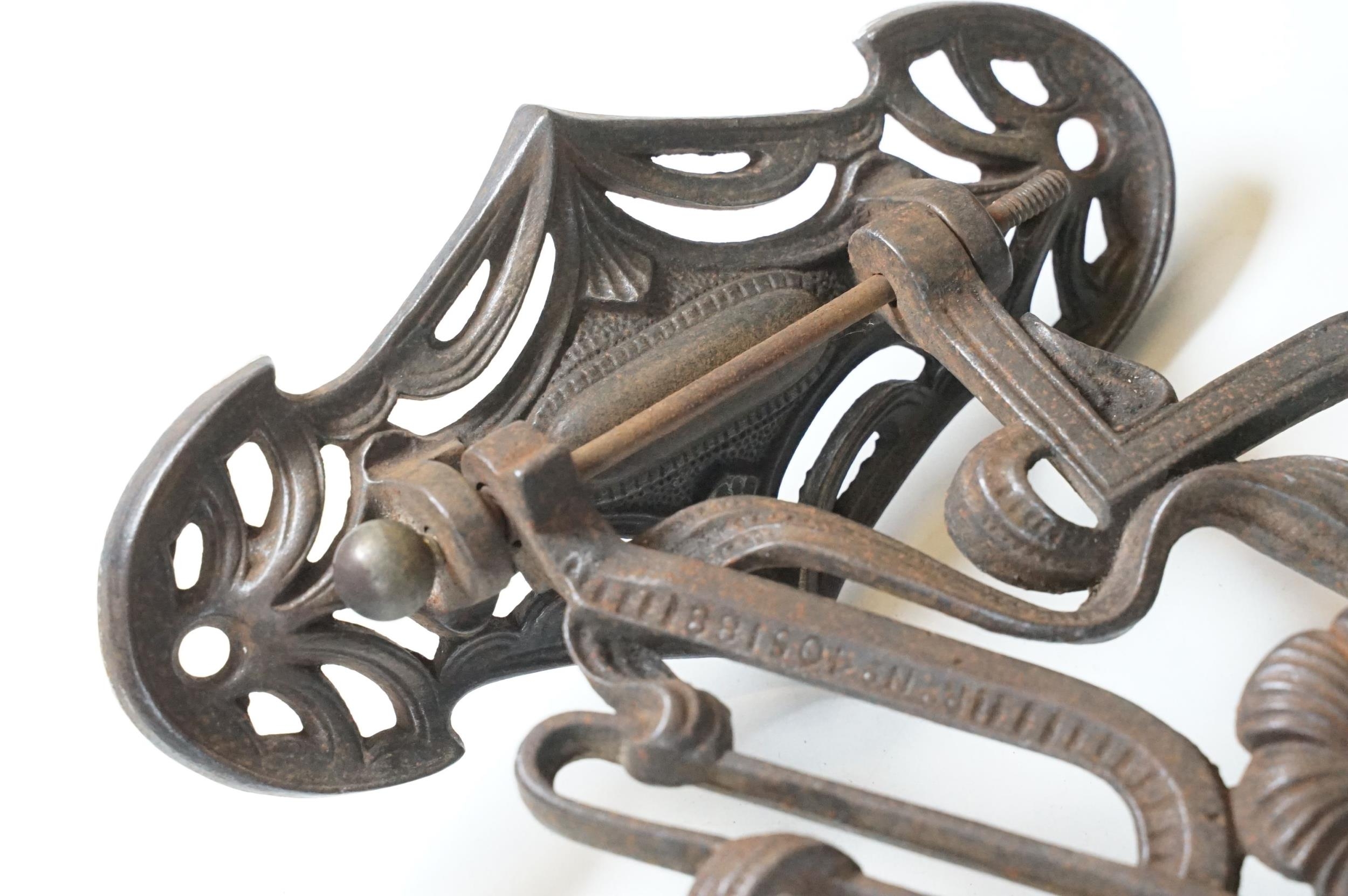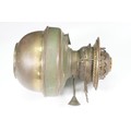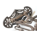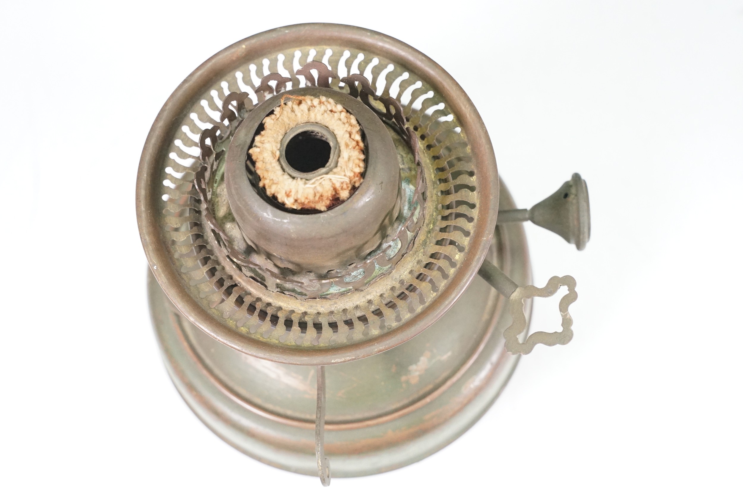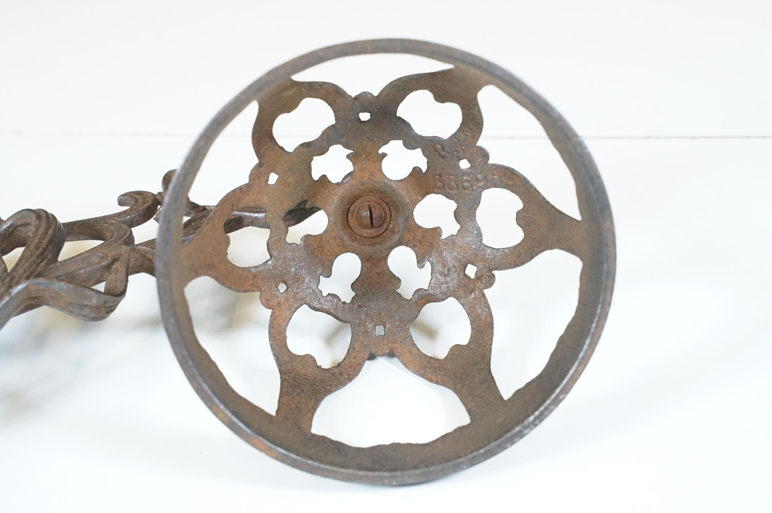 Art nouveau late 19th century pierced iron wall bracket of foliate sinuous design, stamped with a registration number, 36cm long holding a cathedral oil lamp by Jones & Willis