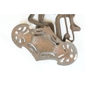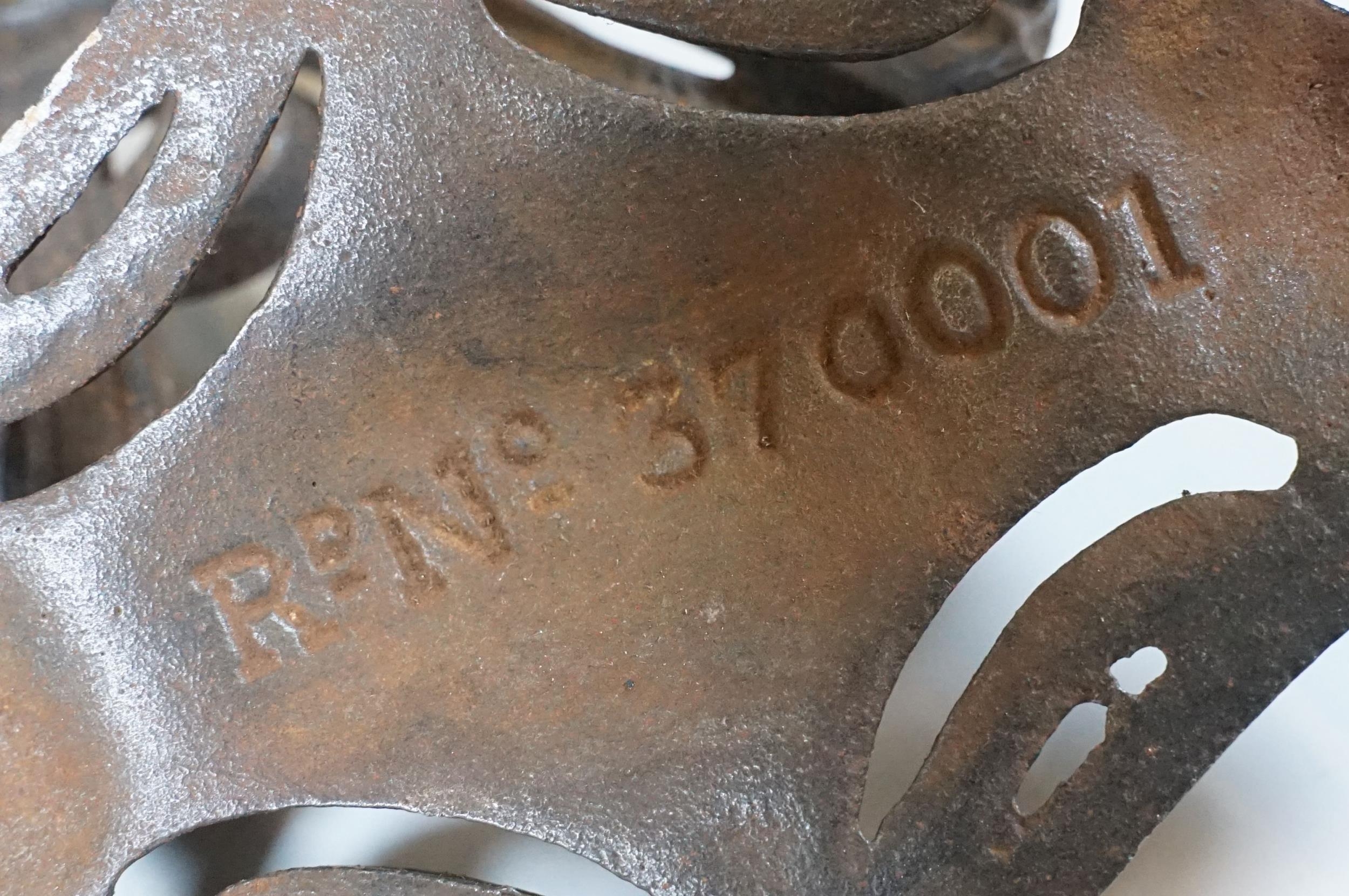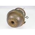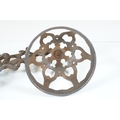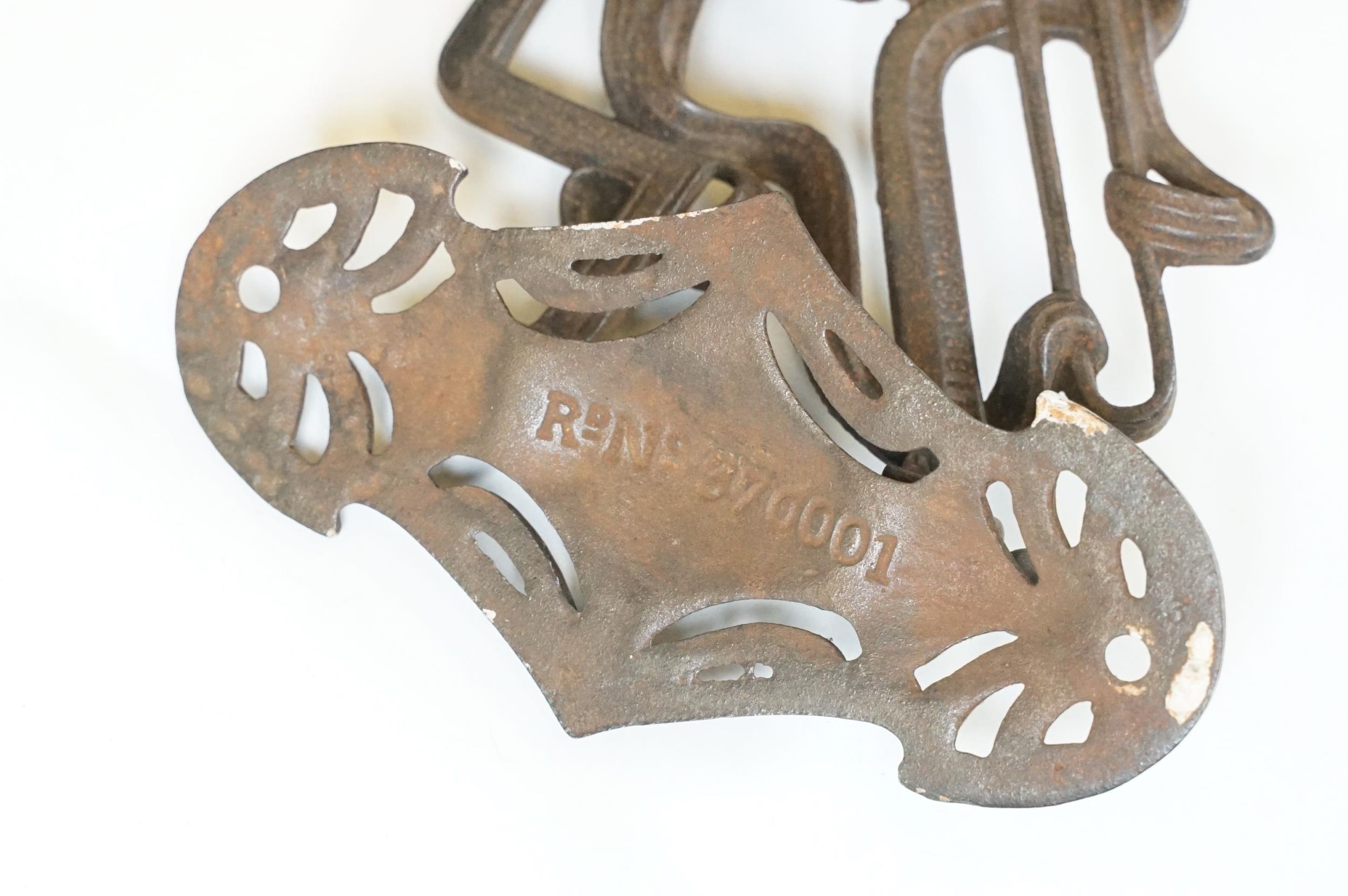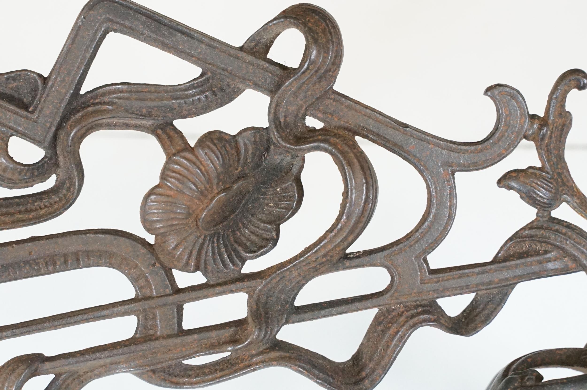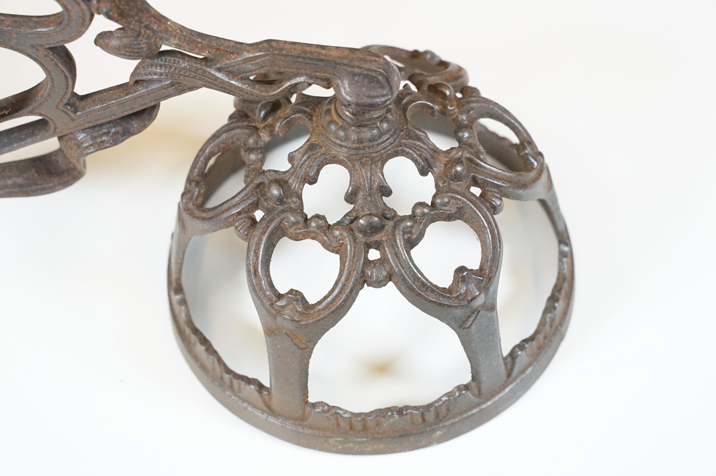 Art nouveau late 19th century pierced iron wall bracket of foliate sinuous design, stamped with a registration number, 36cm long holding a cathedral oil lamp by Jones & Willis