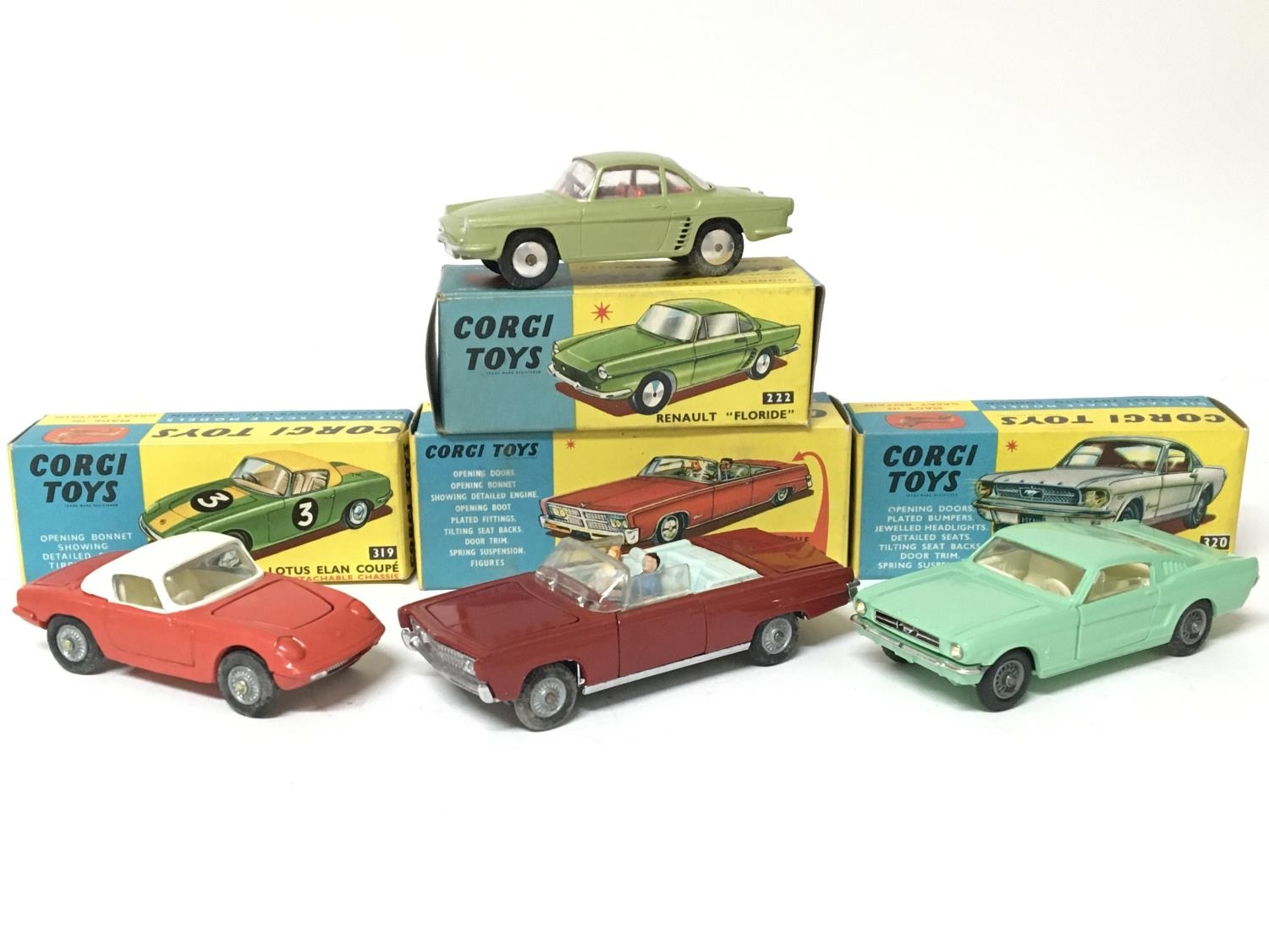Corgi toys, #319 Lotus Elan coupe, #320 Ford Mustang fastback 2+2, #246 Chrysler Imperial and Renault Floride, boxed