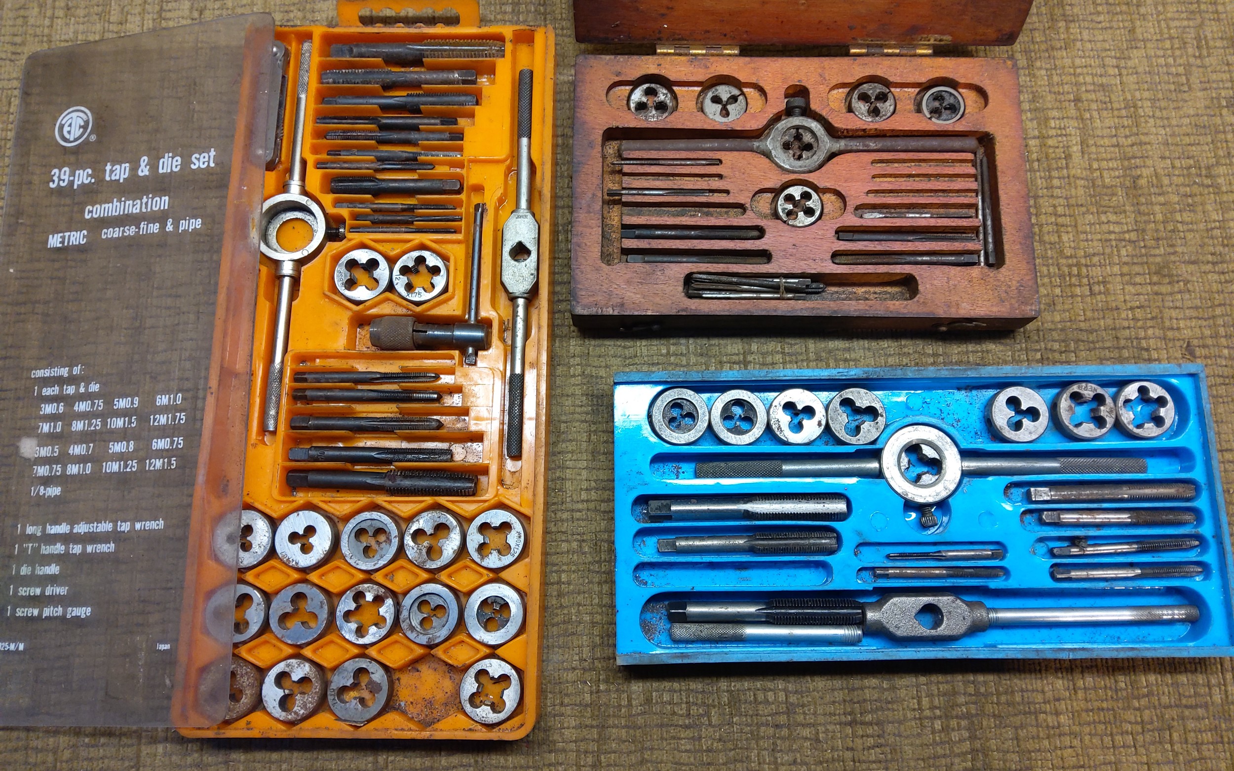 Three vintage tap and die sets.