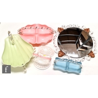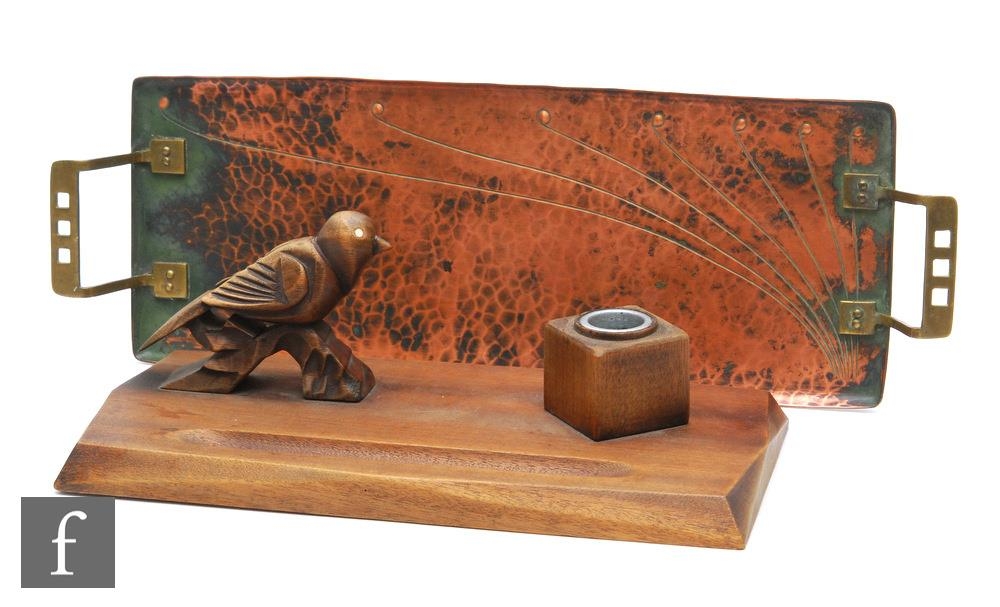 A small Secessionist brass and copper two handled serving tray, width 43cm, and an Art Deco wooden ink stand modelled with a perched bird and a square well, width 31cm. (2)