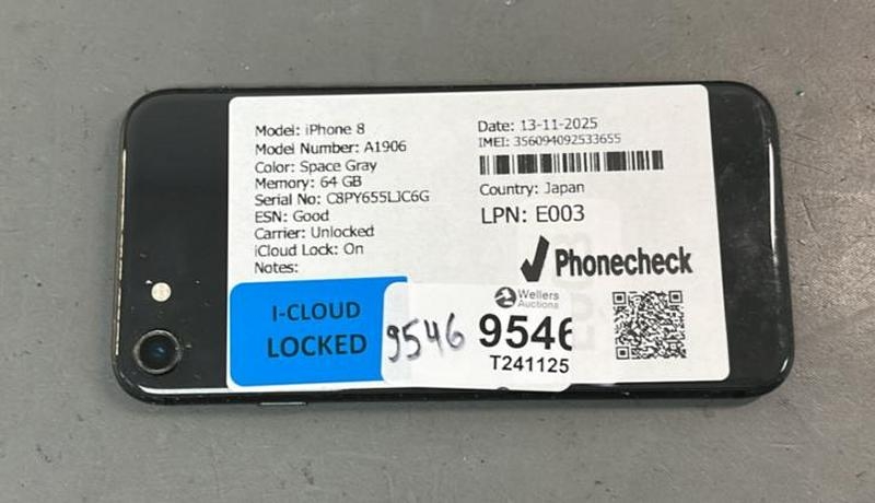 IPHONE 8. A1906/ SPACE GRAY/64GB/ IMEI-356094092533655 (I-CLOUD LOCKED) (SCREEN DAMAGED)