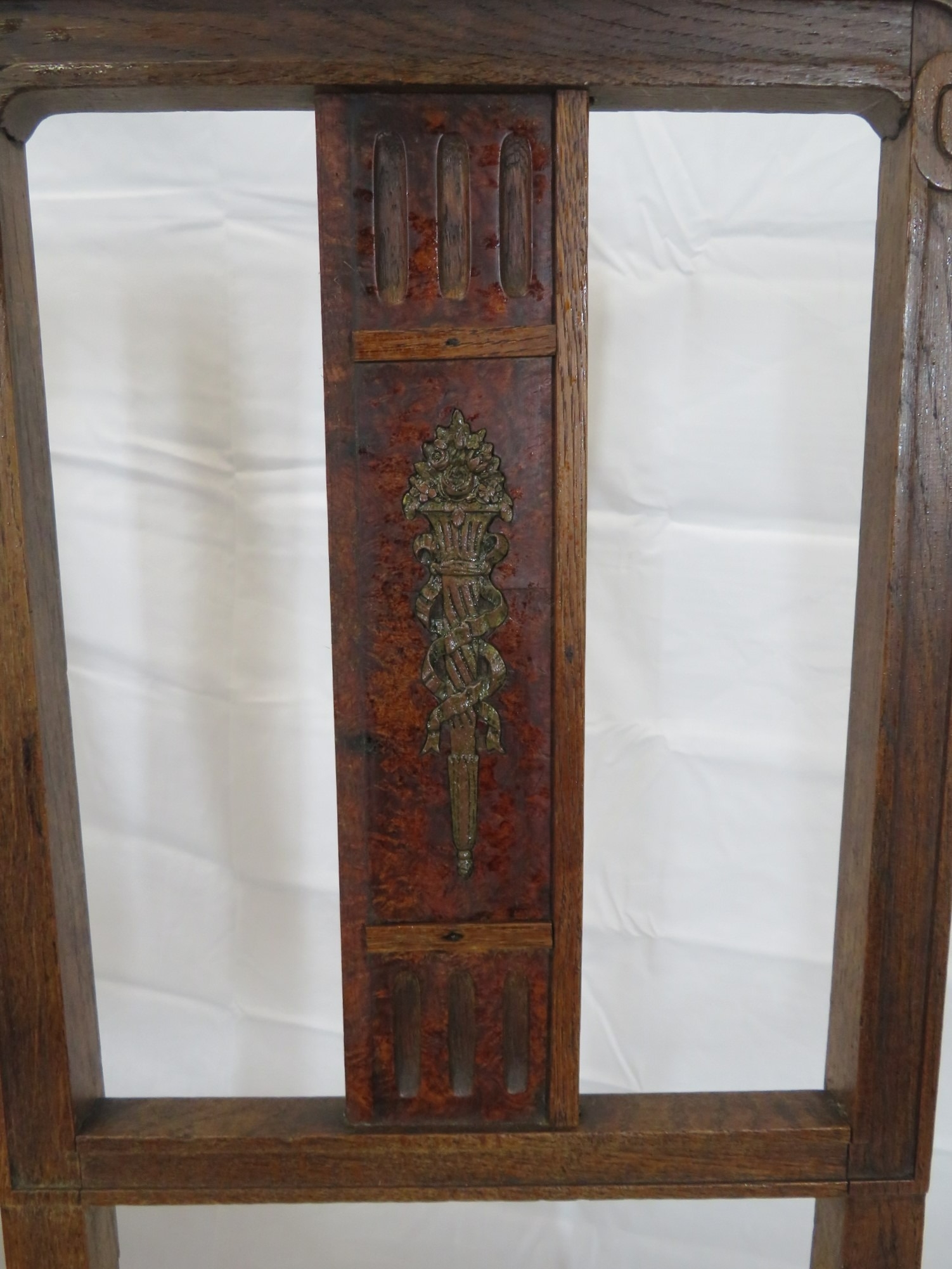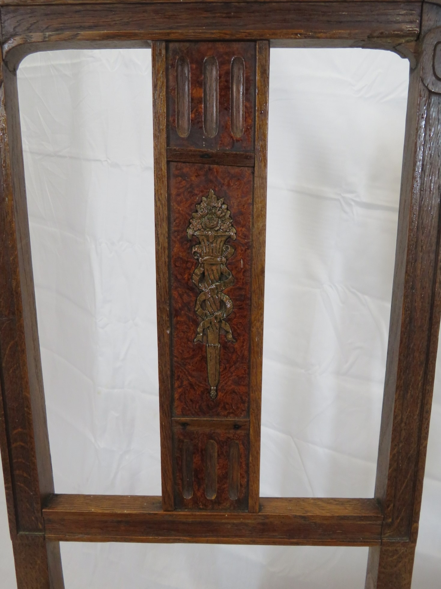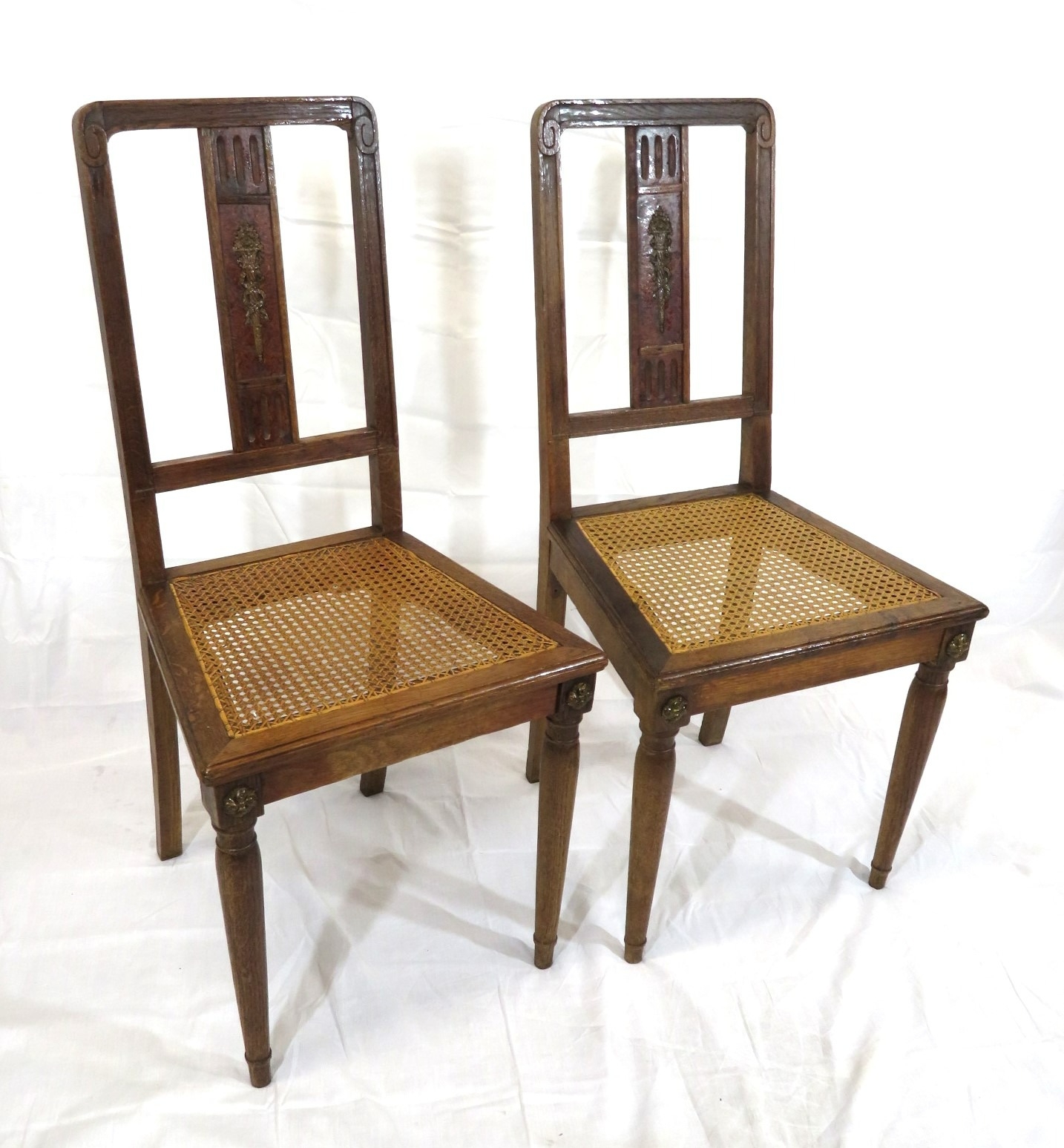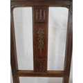 Pair of Victorian style oak chairs with inlaid foliate rails, on turned tapering legs