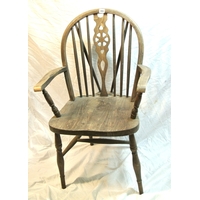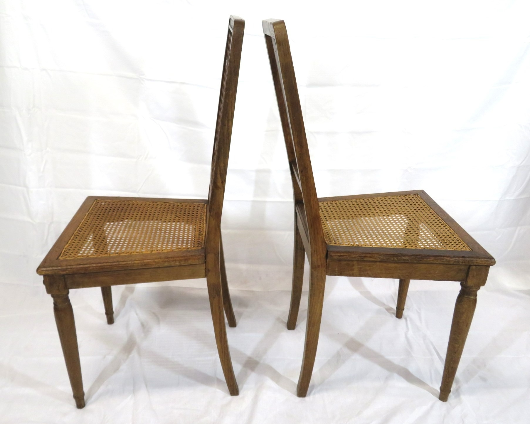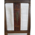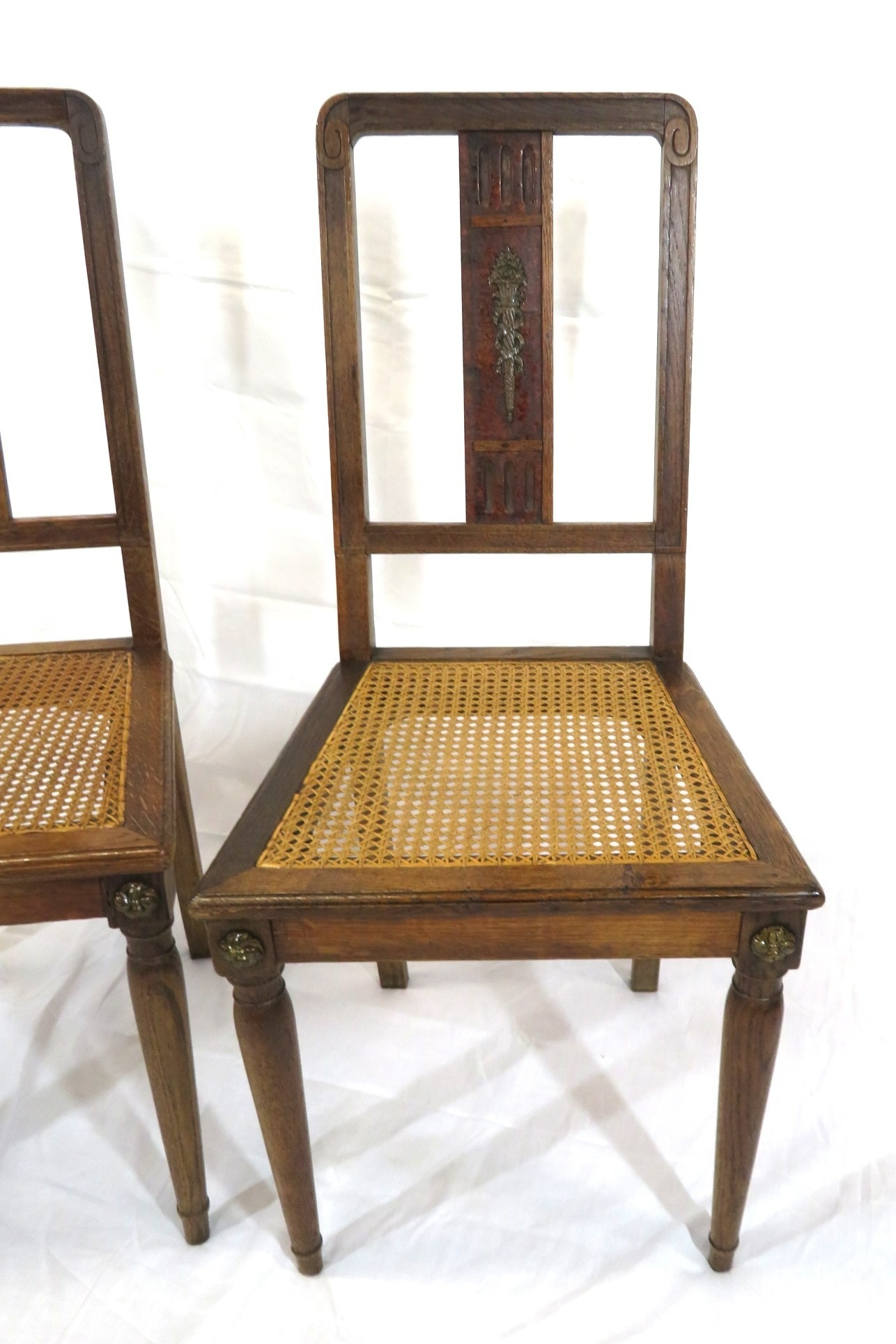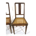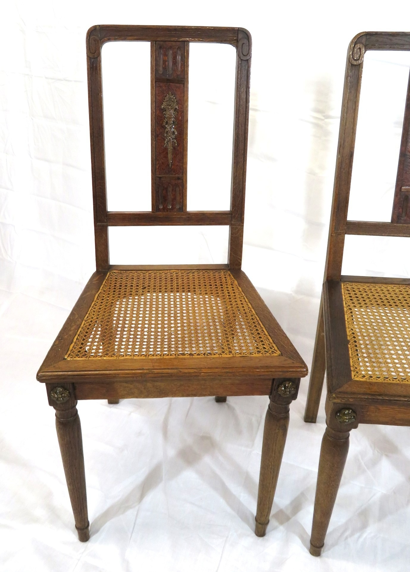 Pair of Victorian style oak chairs with inlaid foliate rails, on turned tapering legs