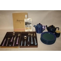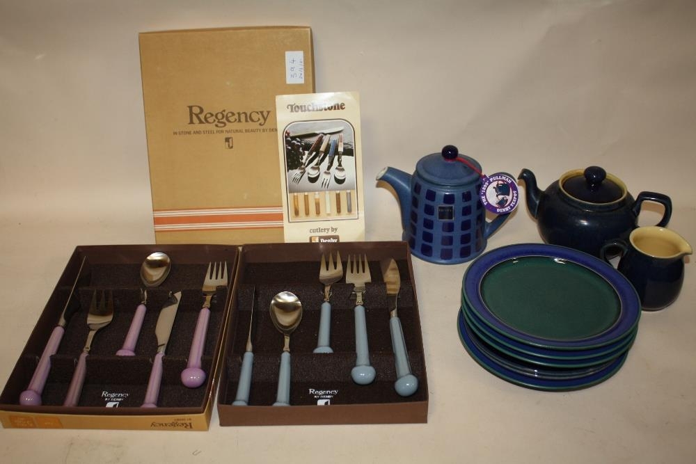 A COLLECTION OF DENBY STONEWARE TO INCLUDE REGENCY CUTLERY SETS, TEAPOTS ETC