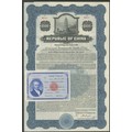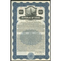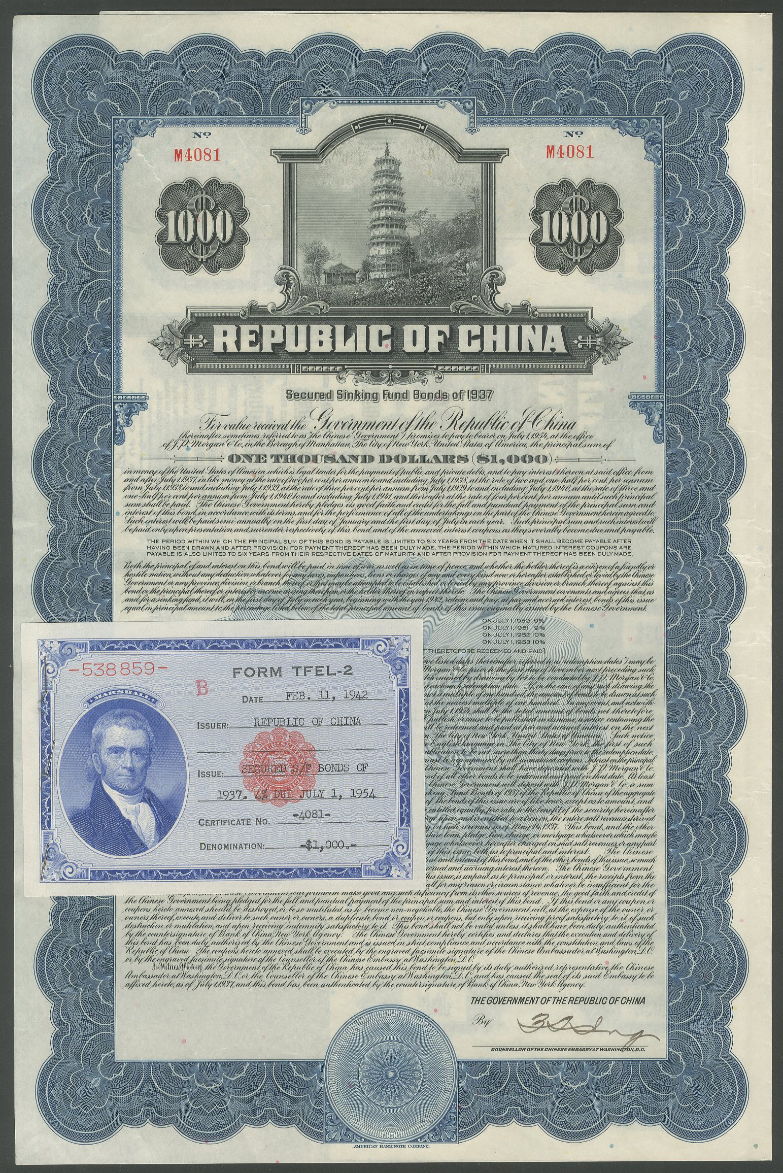 China: 1937 Secured Sinking Fund Bond (Pacific Development Loan), bond for $1000, #M4081, pagoda at top, blue and black, with coupons, with form TFEL-2 on face, ABNCo. printing. EF