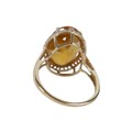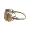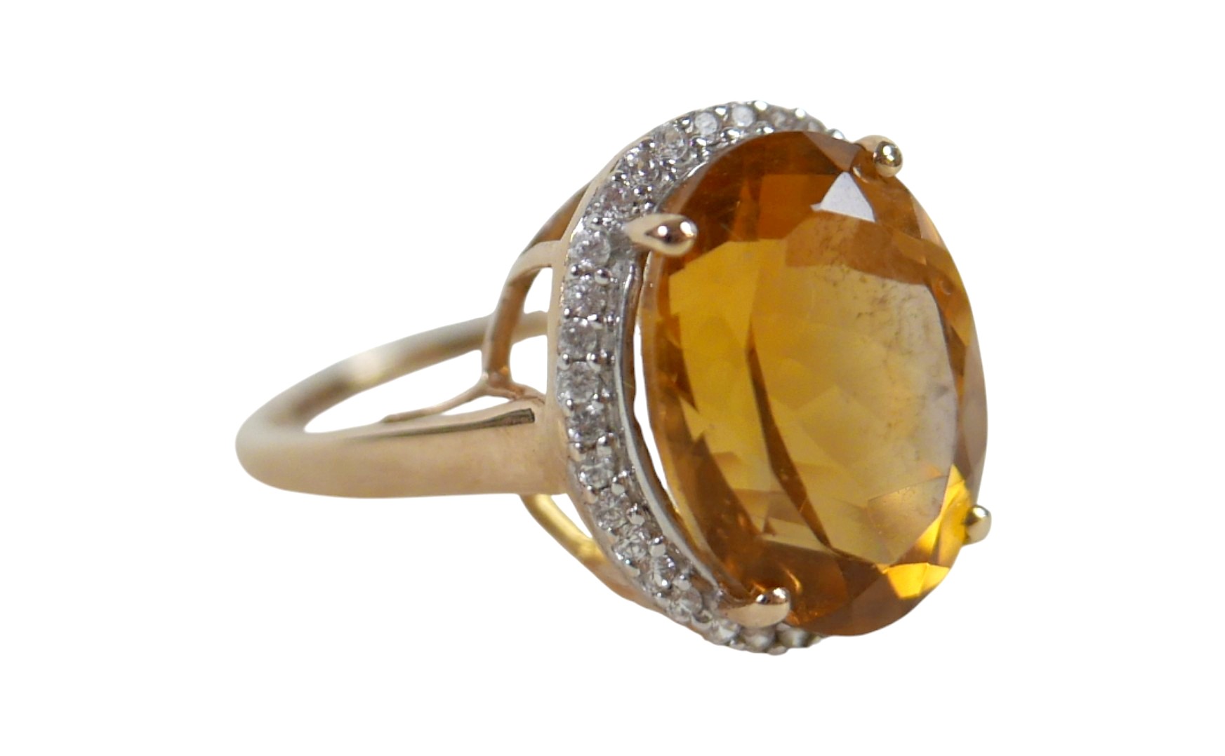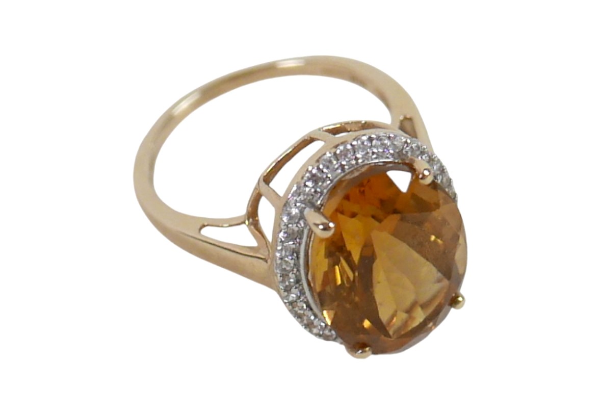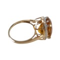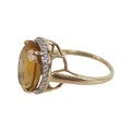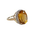 A 10k gold ring set with large oval golden citrine and flowerhead border of small zircon, size S, 5.1g.