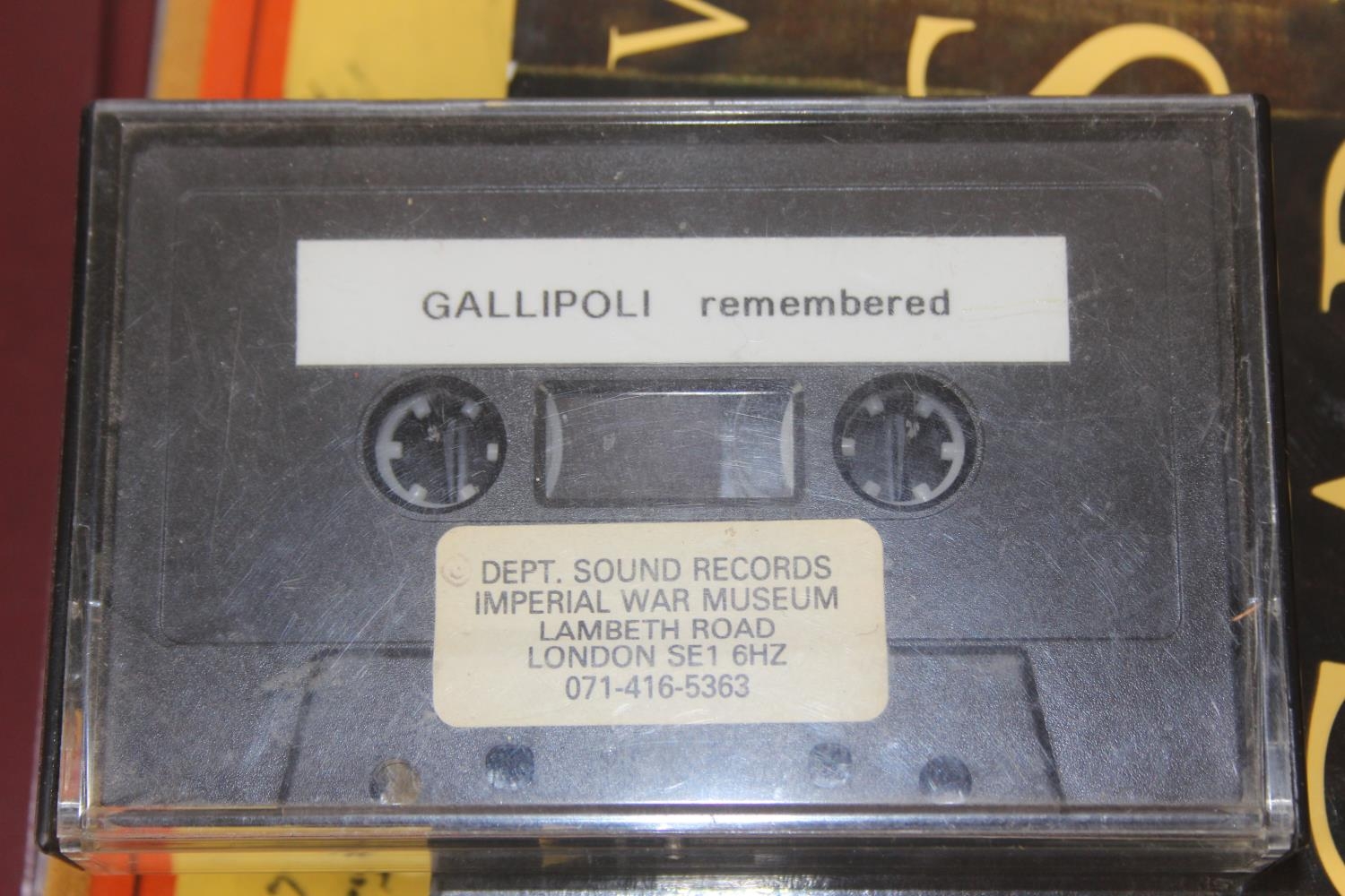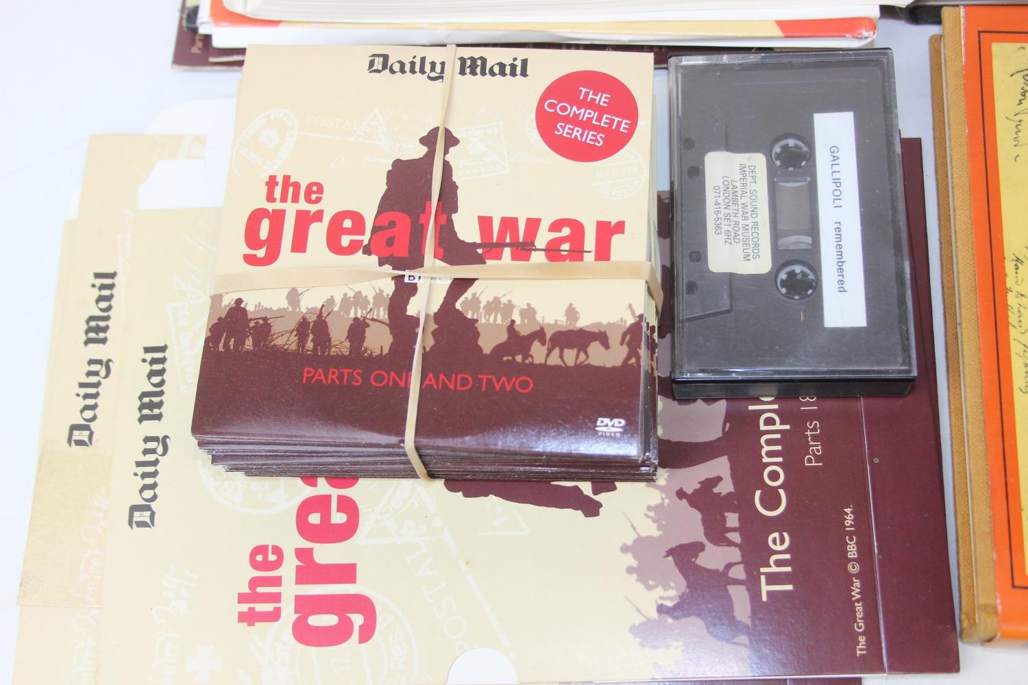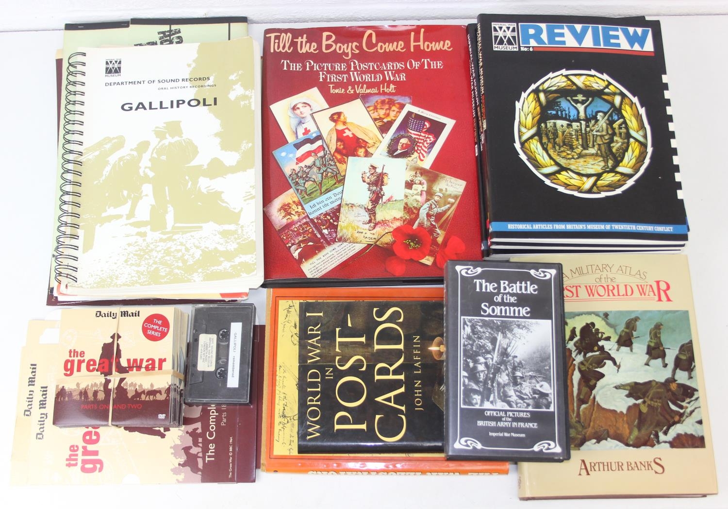 Various media, mostly WW1 related to include Somme VHS, Gallipoli Sound recordings book and cassette from the Imperial War Museum, and books